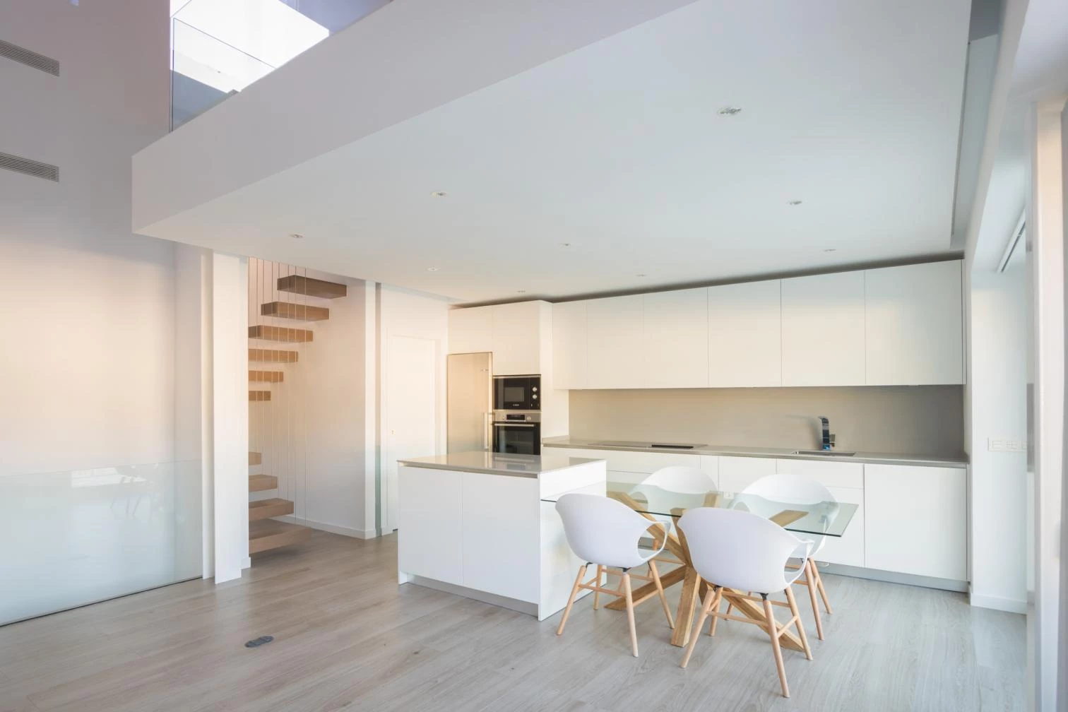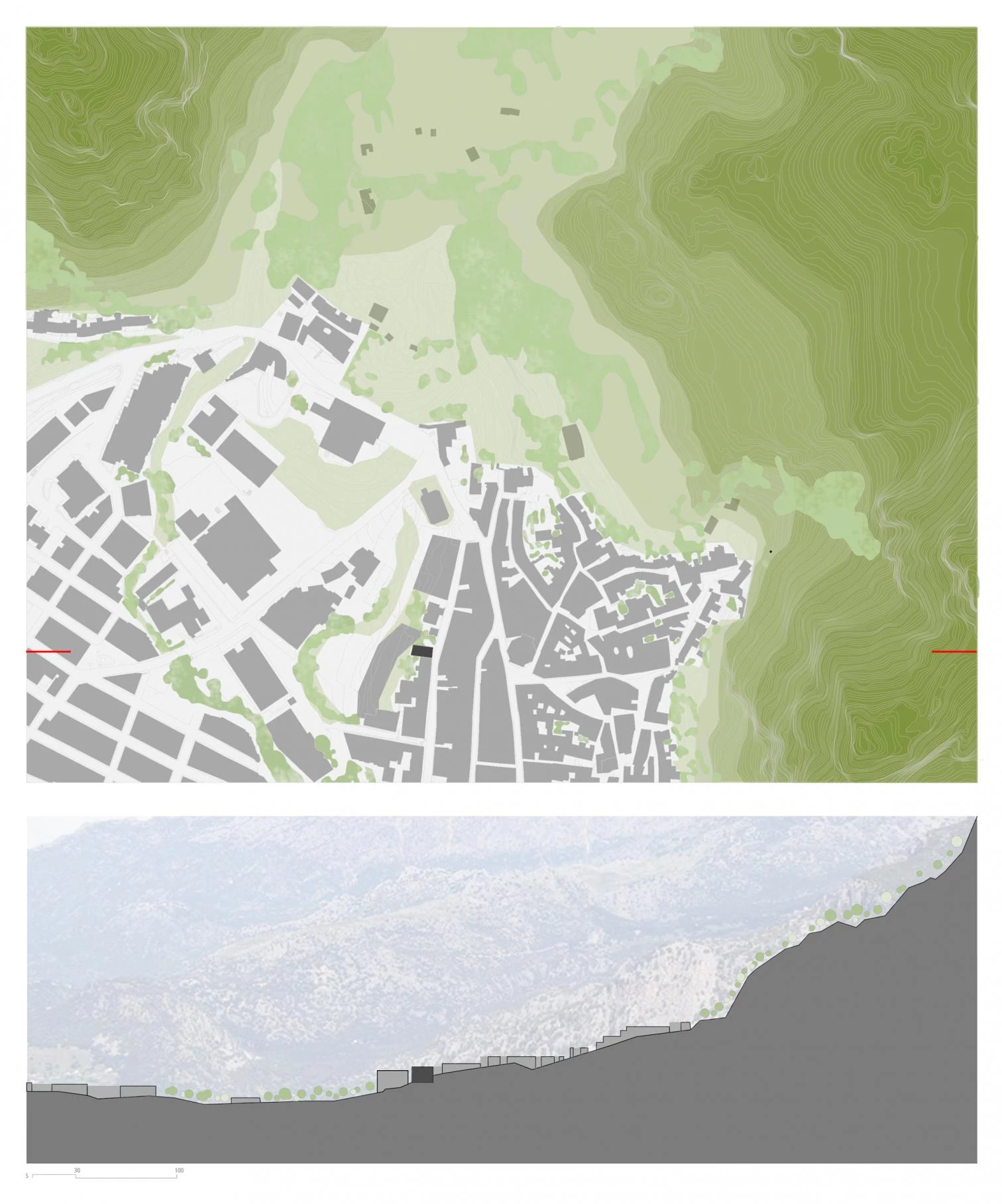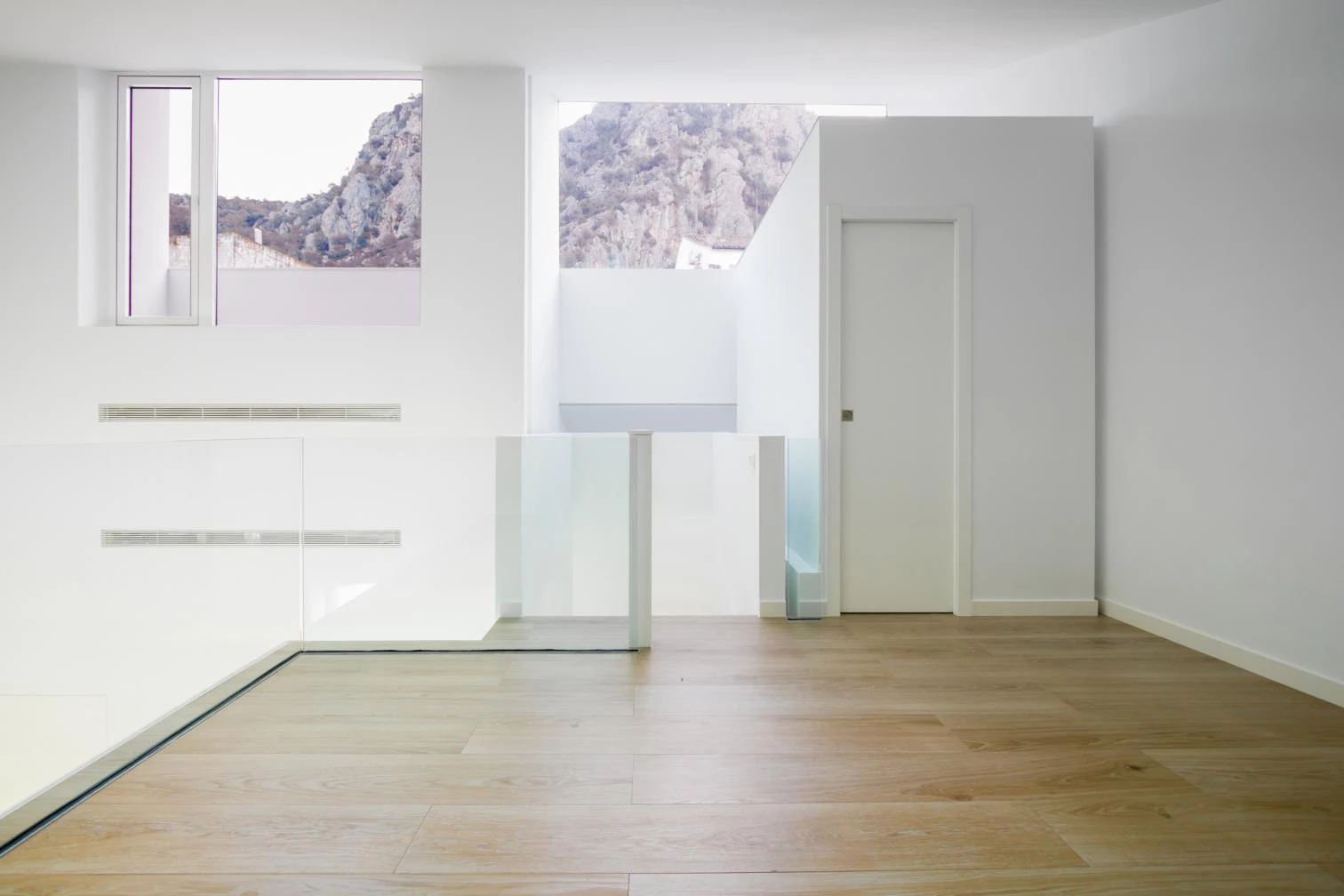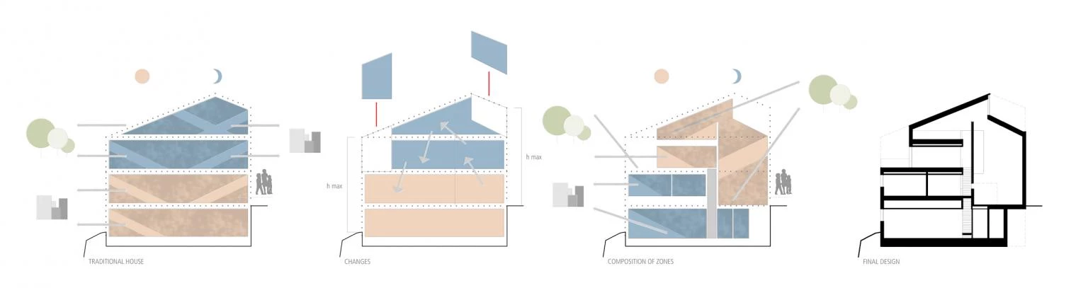 Funcionalmente, se invierte el programa de vivienda tradicional por las características y ubicación de la parcela, buscando la mejor posición de la zona de estar que suele situarse en la planta baja. Por este motivo, en el nivel inferior, además del zaguán y el garaje hacia la calle, se colocan los dormitorios hacia la zona trasera, un poco más elevada. En la planta primera se encuentra el dormitorio principal con baño hacia la calle, y la secuencia sala de estar-cocina-comedor abierta a una terraza continua con vistas hacia el valle del Aljibe. Una entreplanta incluye un estudio comunicado con el salón y los tres núcleos de servicios que miran al zaguán. El volumen de acero y hormigón no alcanza la altura máxima permitida por la normativa local para optimizar las vistas mediante un forjado inclinado trasero.