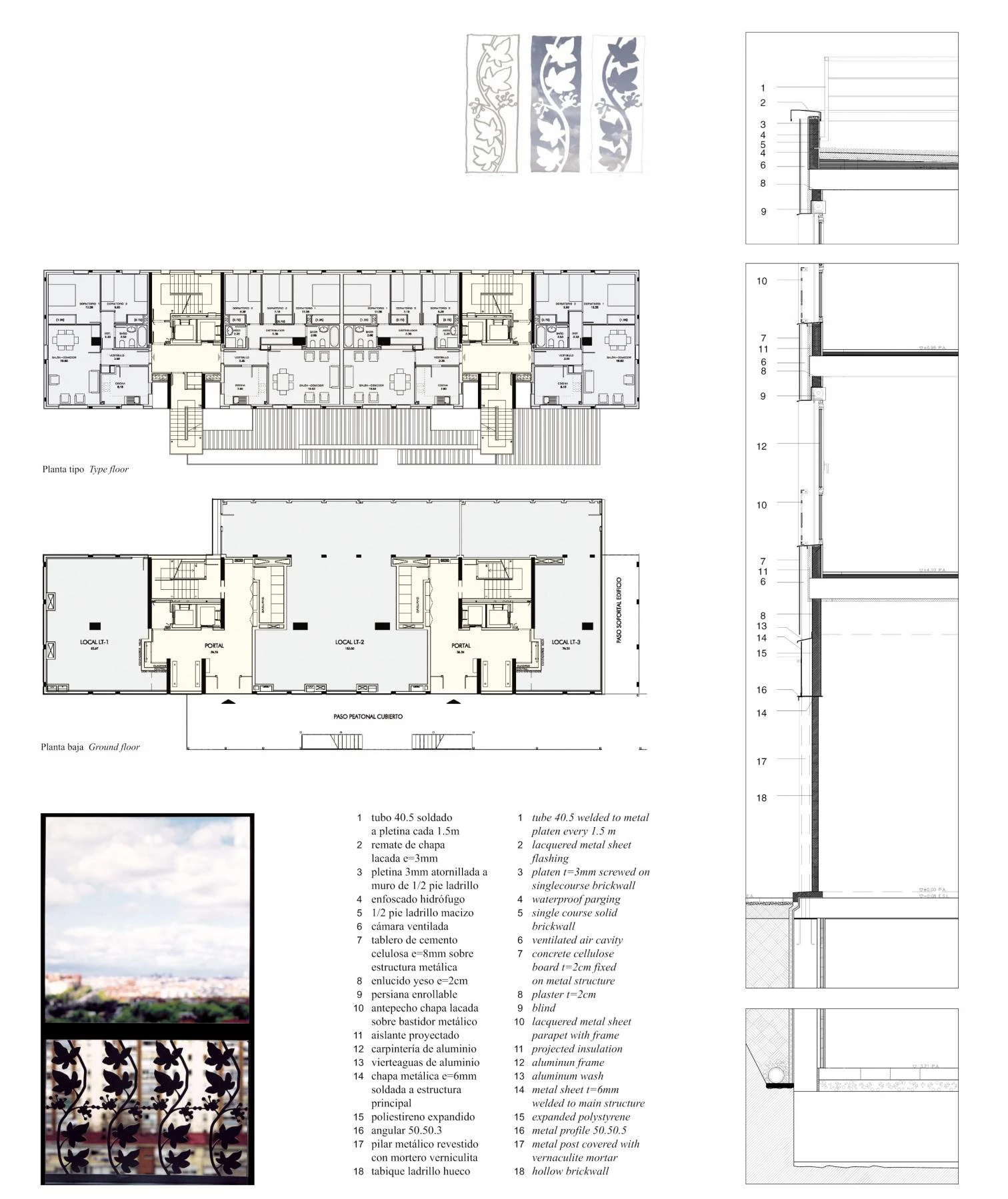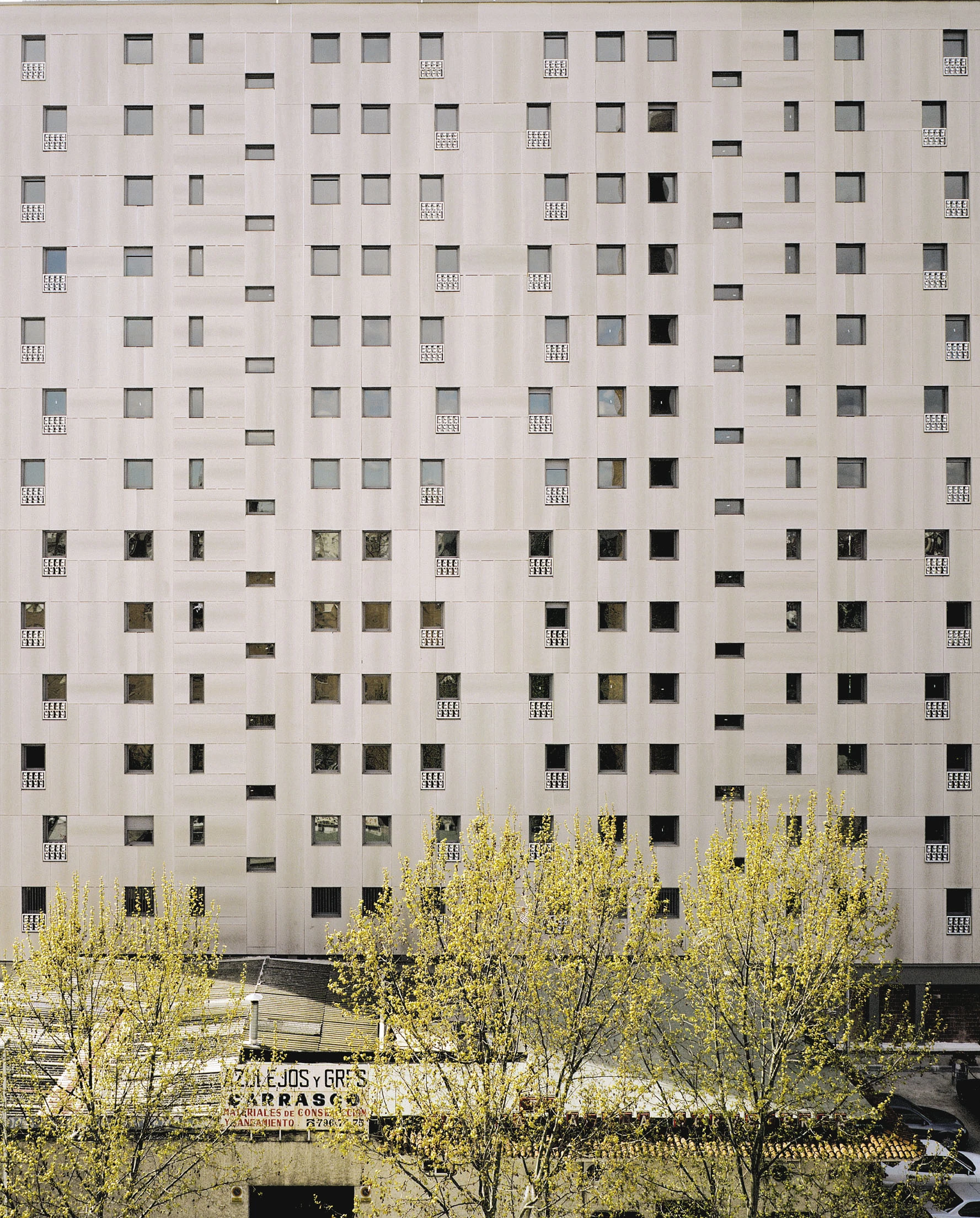 La imagen de dureza que proporcionan los paneles de cemento se contrarresta con la variedad en la disposición y en el tamaño de los huecos, y con el motivo floral de chapa lacada que decora los antepechos.