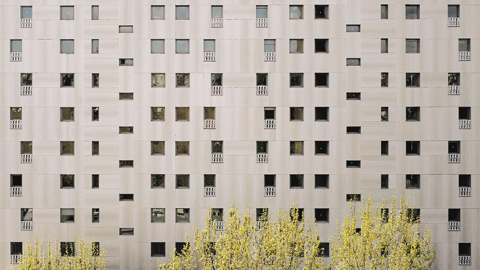 Los huecos hablan en el bloque del carácter doméstico de su programa. Frente a la aparente sencillez de la envolvente gris, que imprime carácter y rotundidad, los huecos salpican la fachada con posición y forma diversas. Los antepechos, de chapa lacada en blanco, incorporan motivos florales que suponen el positivo y negativo de un mismo diseño base. En esta escala menor, la ornamentación de las ventanas y el colorido de las escaleras filtra al exterior la domesticidad de sus espacios interiores, que pertenecen ya a los inquilinos.