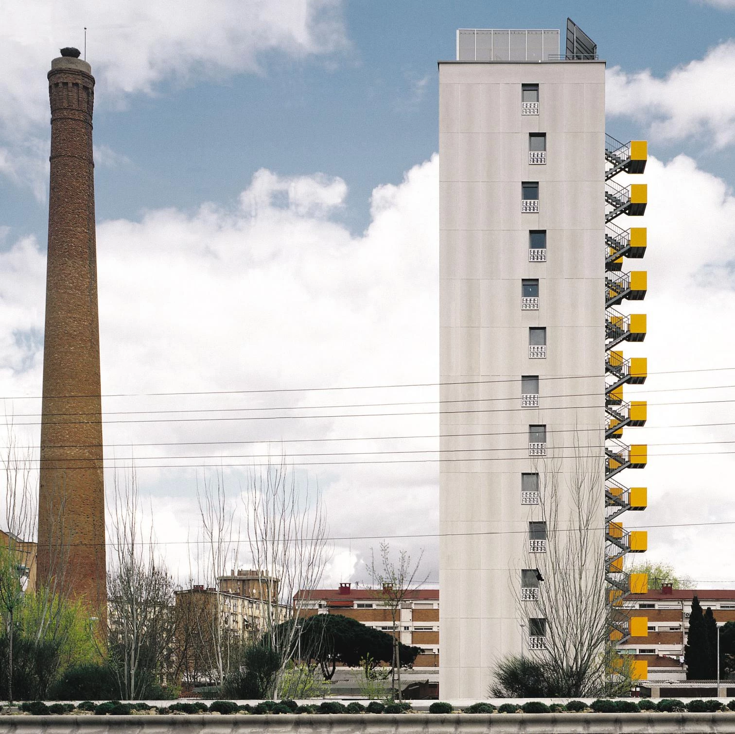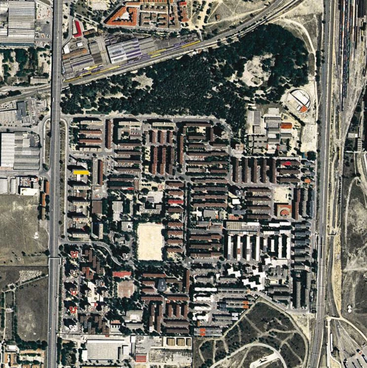Desde que en 1959 se iniciara la construcción del poblado de San Cristóbal de los Ángeles, al sur de Madrid, son numerosos los edificios (en general, bloques de más diez alturas construidos en la década de los sesenta) que han visto como el paso de los años provocaba un grave deterioro de su estructura. Los problemas, relacionados inicialmente con la calidad del terreno —arcillas y cenagales creados por un brazo subterráneo del Manzanares—, se extendieron a la gestión de las promociones y a las empresas constructoras involucradas en su promoción. Casi cuarenta años después, la actual Empresa Municipal de la Vivienda encargó la restitu-ción de un bloque de catorce pisos situado junto a la carretera de Andalucía. El volumen, que había sido demolido hacía varios años, constituía el último de una serie de cinco prismas idénticos, inser-tos en una trama consolidada con amplias zonas verdes y algunos equipamientos. El proyecto, destinado a alquiler, repone las 52 viviendas existentes en una nueva pieza que respeta la altura, anchura y volumetría de la anterior, pero aporta ingredientes distintos a la serie al incorporar nuevos patrones de diseño, tanto formales como ambientales. Su rotundo perfil se alza frente a la chimenea de la antigua fábrica de ladrillos, en su día involucrada en el deficiente desarrollo del barrio.