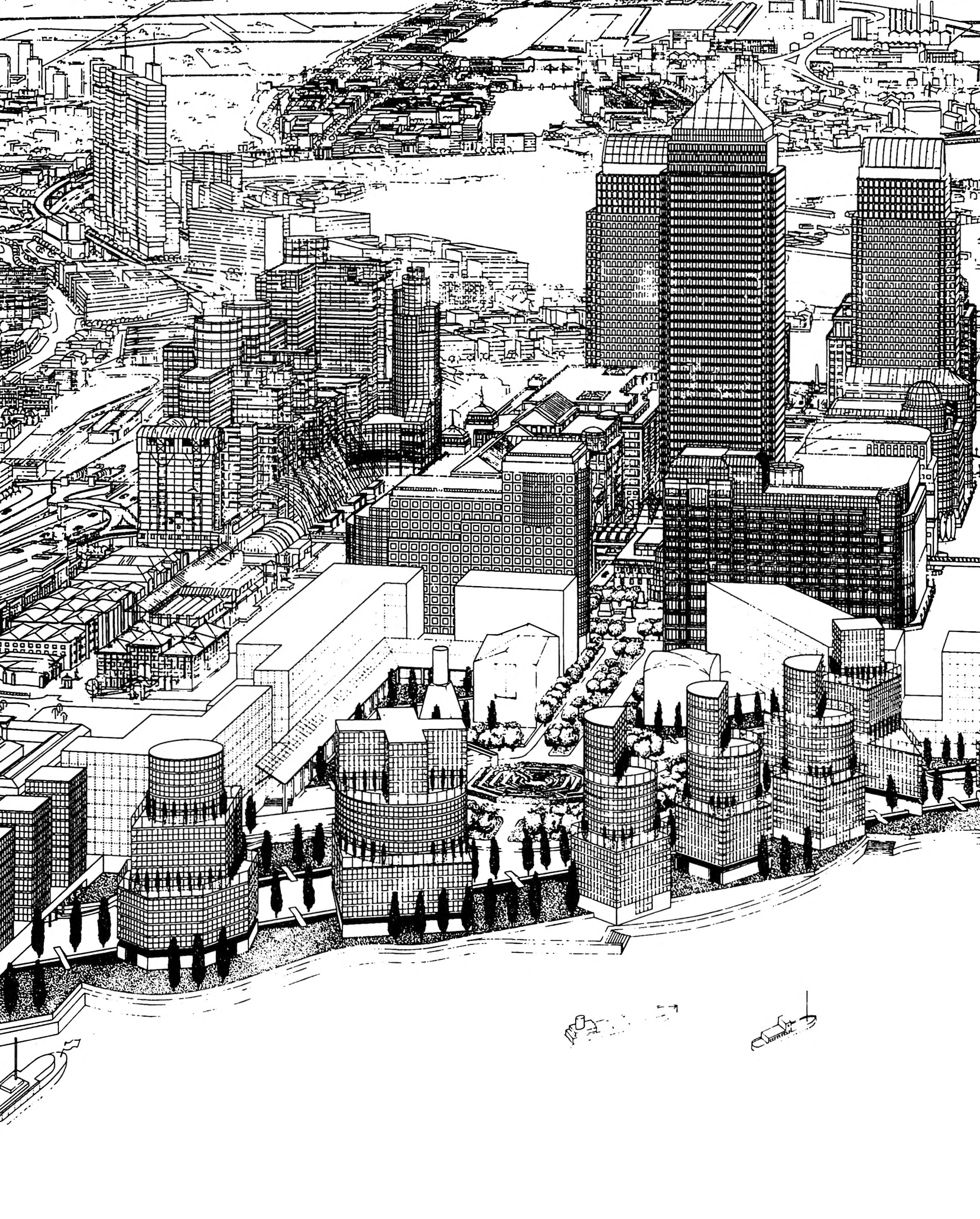 El proyecto se desarrolla en torno a un parque aterrazado que desciende gradualmente hasta la orilla del Támesis, rodeando el existente West Ferry Circus. Este amplio parque se concibe como una suerte de vestíbulo del Canary Wharf, en agudo contraste con el núcleo comercial. Un conjunto de edificios lineales, dedicados a uso terciario, delimitan el espacio de la operación por el interior, mientras que una serie de torres residenciales se disponen informalmente a lo largo del frente acuático, como actores frente a un telón de fondo.