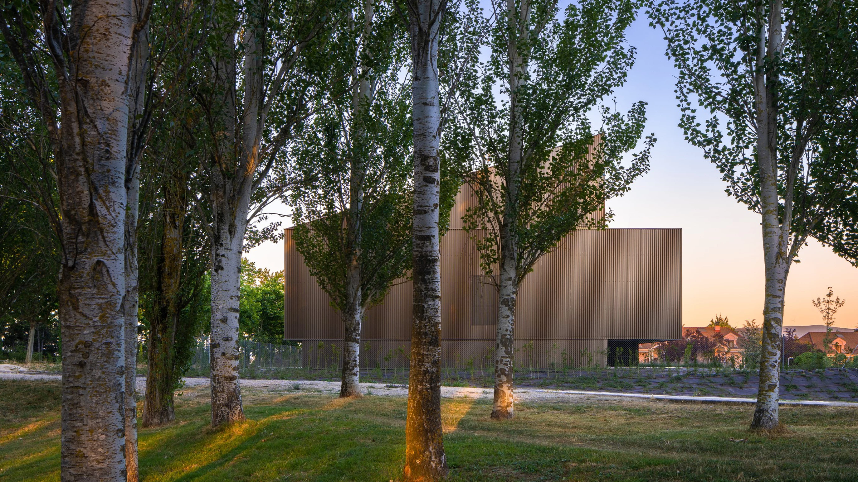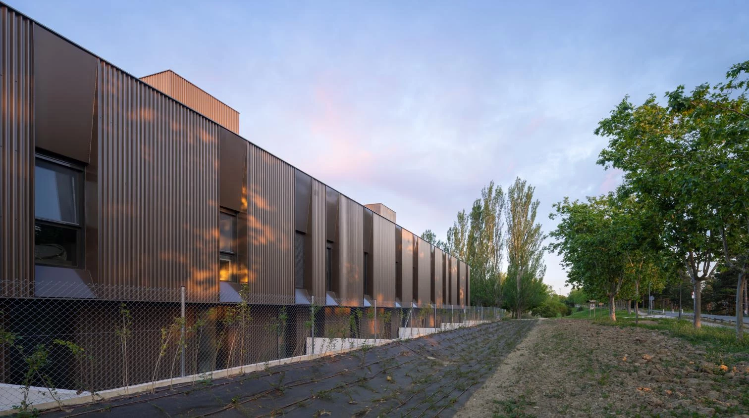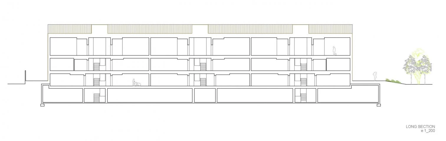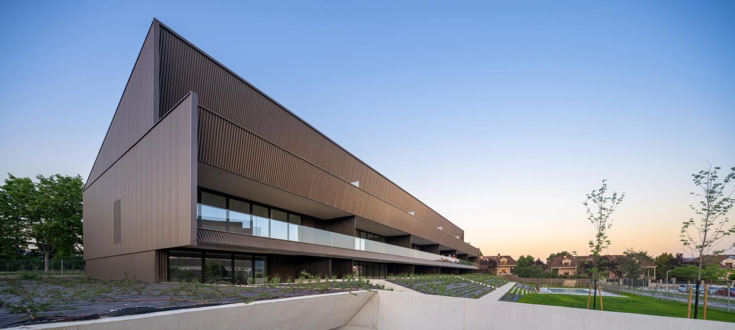 Este bloque residencial se sitúa al borde de un bosque, en el municipio de Zizur Mayor y a 5 kilómetros al suroeste de Pamplona. Con 2.500 metros cuadrados, el conjunto de dieciocho viviendas apiladas —seis en cada una de las tres alturas— proporciona una imagen cercana a la tradicional ‘casa’ para integrarse en el entorno. La distorsión de la escala, provocada mediante la extrusión de la sección, se acentúa a través de taludes con vegetación y las sombras generadas por la profundidad de las terrazas. La fachada cerrada al norte se resuelve mediante ventanas aleatorias cuya repetición emula la relación rítmica de los árboles cercanos. El frente abierto al sur contiene las terrazas corridas. Una piel estriada de acero y color broncíneo envuelve la construcción.