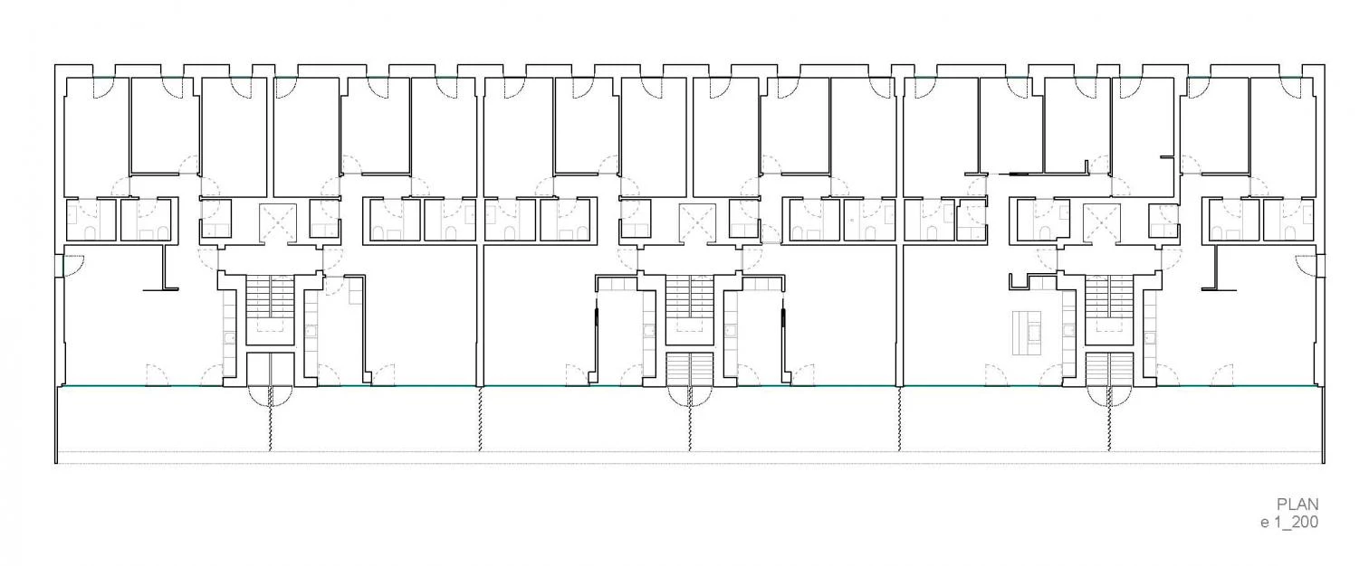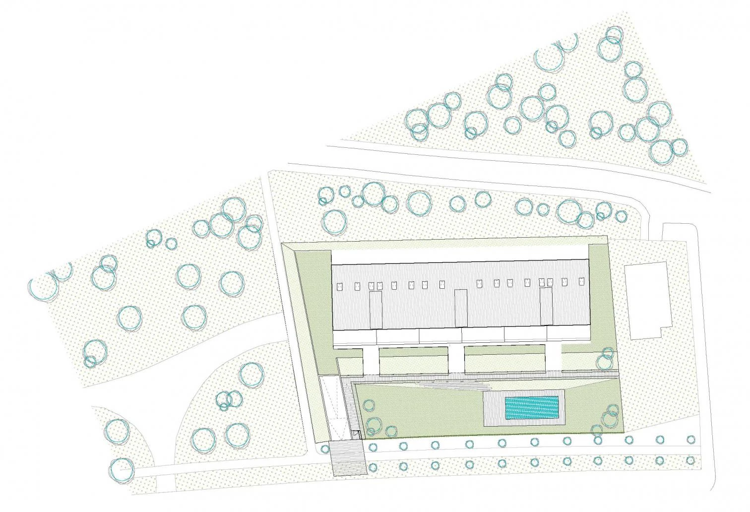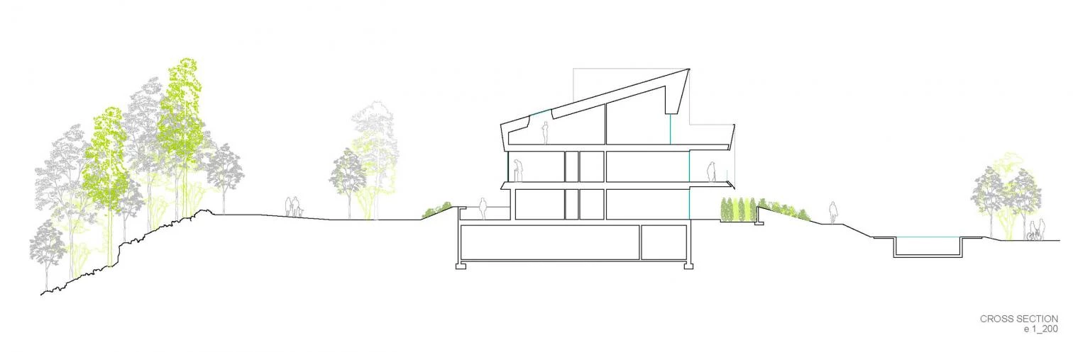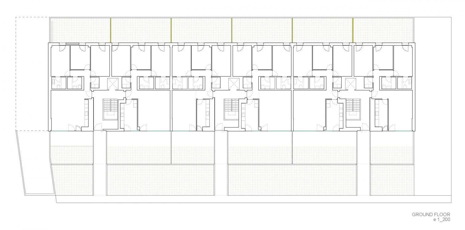 Este bloque residencial se sitúa al borde de un bosque, en el municipio de Zizur Mayor y a 5 kilómetros al suroeste de Pamplona. Con 2.500 metros cuadrados, el conjunto de dieciocho viviendas apiladas —seis en cada una de las tres alturas— proporciona una imagen cercana a la tradicional ‘casa’ para integrarse en el entorno. La distorsión de la escala, provocada mediante la extrusión de la sección, se acentúa a través de taludes con vegetación y las sombras generadas por la profundidad de las terrazas. La fachada cerrada al norte se resuelve mediante ventanas aleatorias cuya repetición emula la relación rítmica de los árboles cercanos. El frente abierto al sur contiene las terrazas corridas. Una piel estriada de acero y color broncíneo envuelve la construcción.