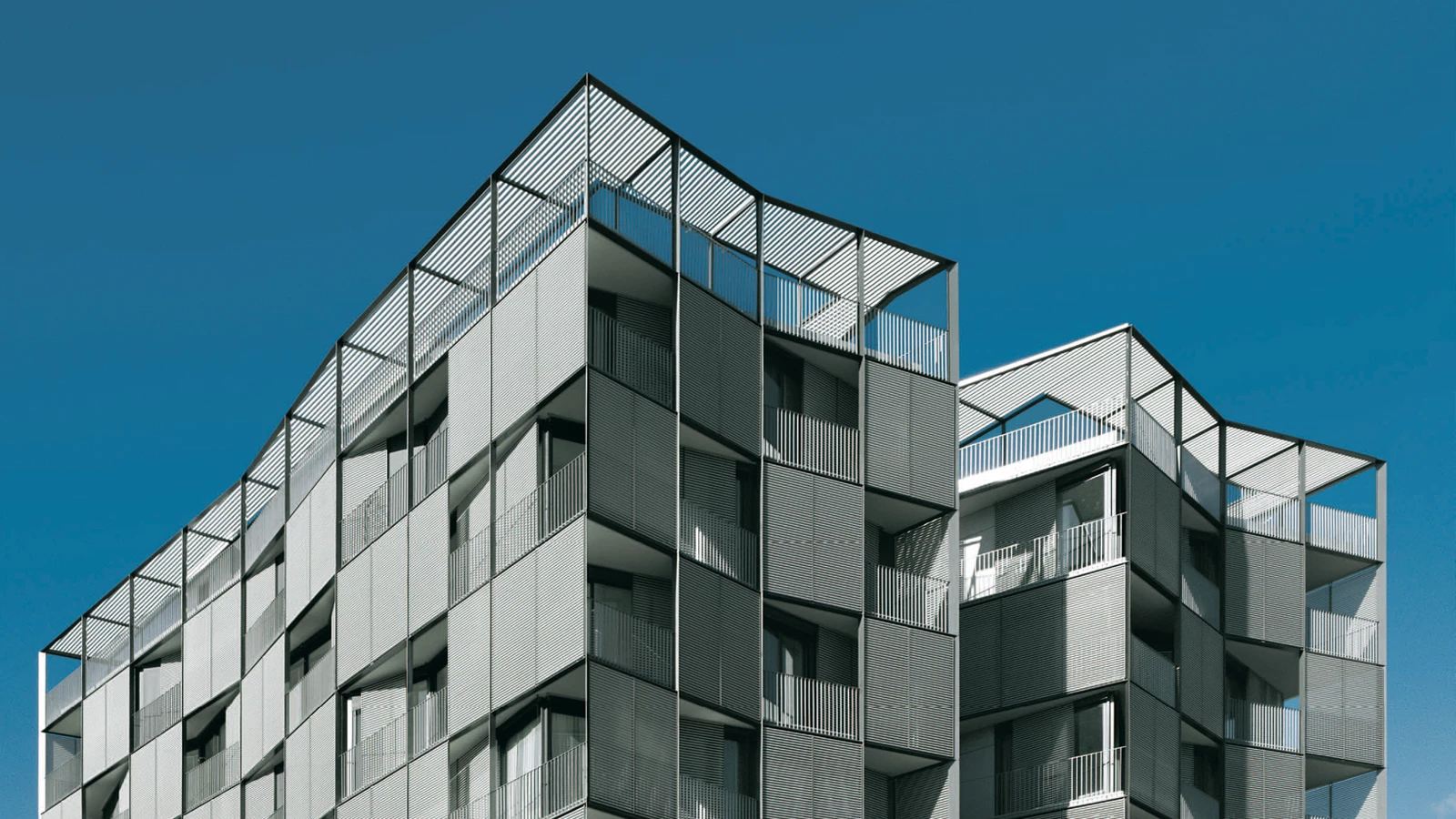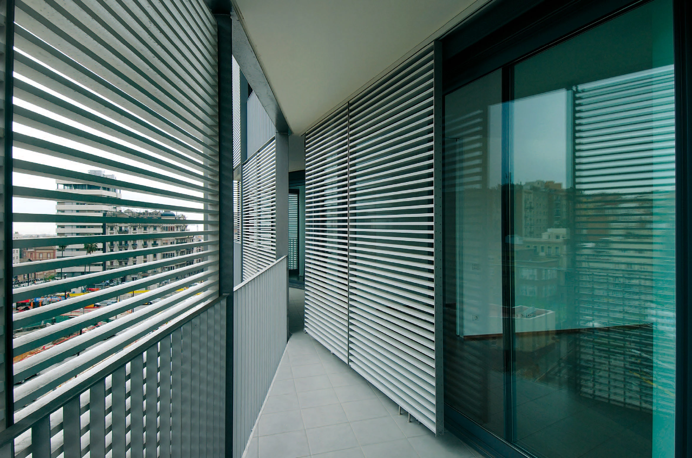 El cerramiento se resuelve con persianas metálicas fijas alternadas con correderas que protegen amplias terrazas —diseñadas para establecer relaciones sutiles entre los espacios interiores y el exterior— y al mismo tiempo, gradúan la intensidad de la luz natural. Las celosías se han construido con montantes verticales de acero inoxidable y travesaños de sección tubular lacados en color gris perla, quedando enmarcadas por finos pasamanos de acero que forman una retícula. Los elementos verticales pautan una secuencia rítmica en la fachada, mientras que los horizontales ocultan los espesores de los cantos de los forjados.