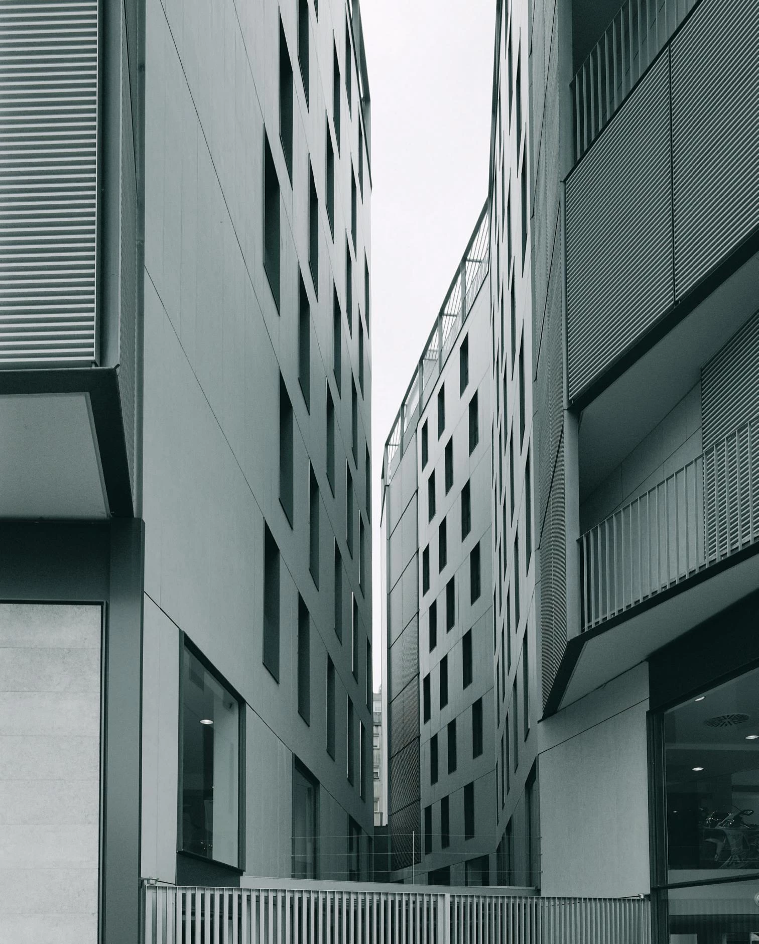Ubicado en el barrio de Gràcia, el edificio contiene las viviendas y los locales comerciales en dos volúmenes separados entre sí por un estrecho patio, mientras que el aparcamiento se organiza en 3 plantas bajo rasante.