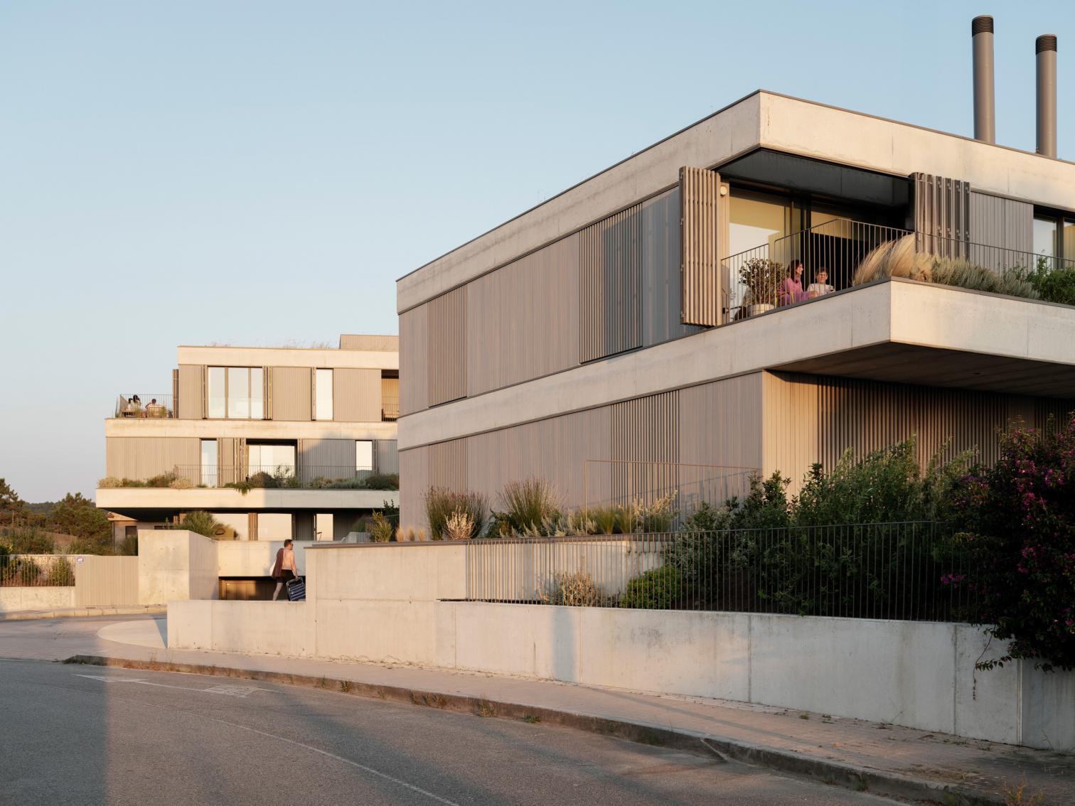 Esta diversidad formal, con edificaciones de alturas variables, garantiza que todas las viviendas dispongan de espacios exteriores privados, ya sea en planta baja o aprovechando las cubiertas transitables. La estructura de hormigón está envuelta con madera termotratada, cuya textura cambia según el uso interior, actuando como cerramiento opaco, filtro o elemento de protección solar.