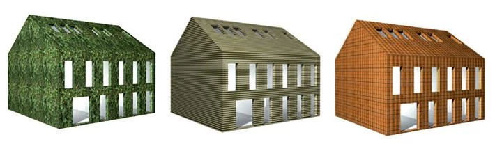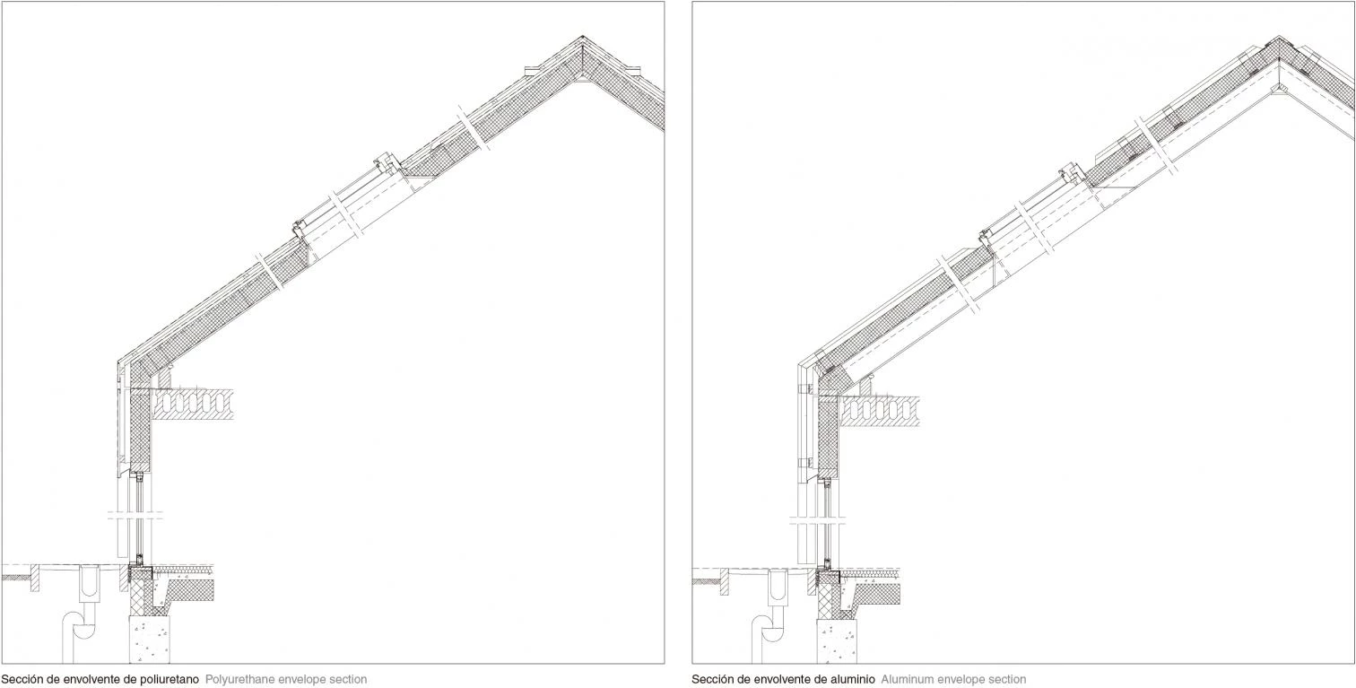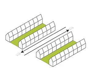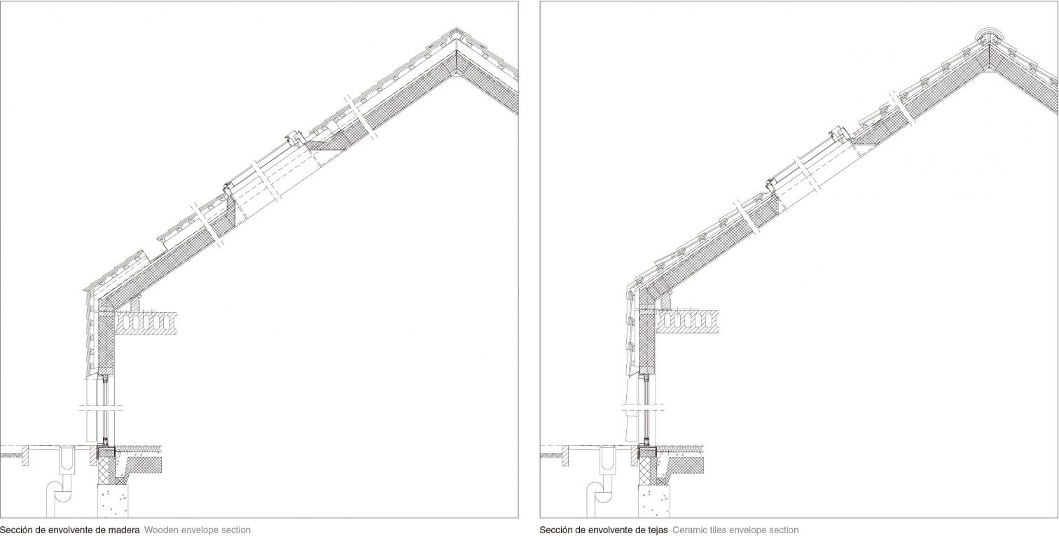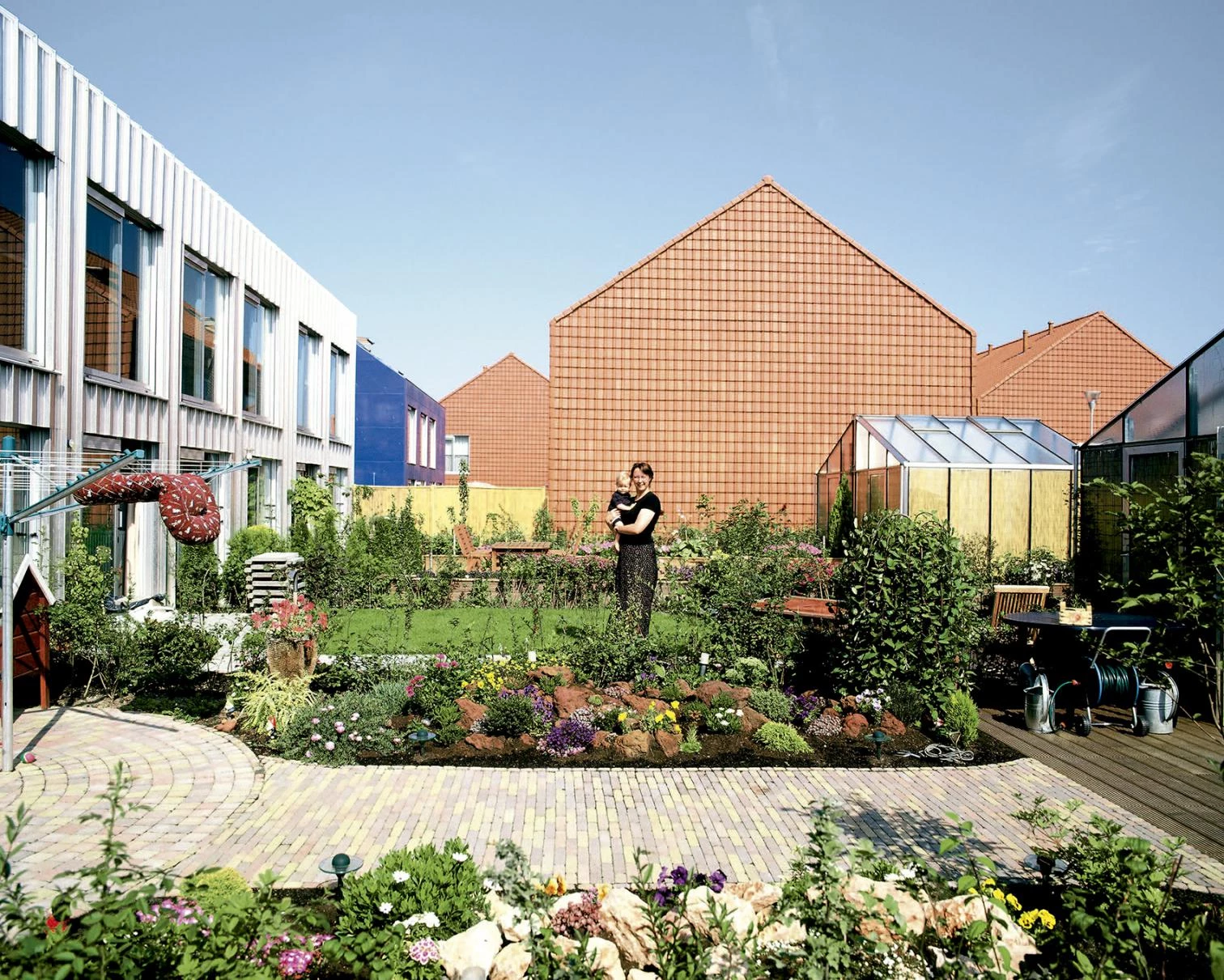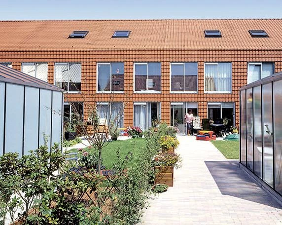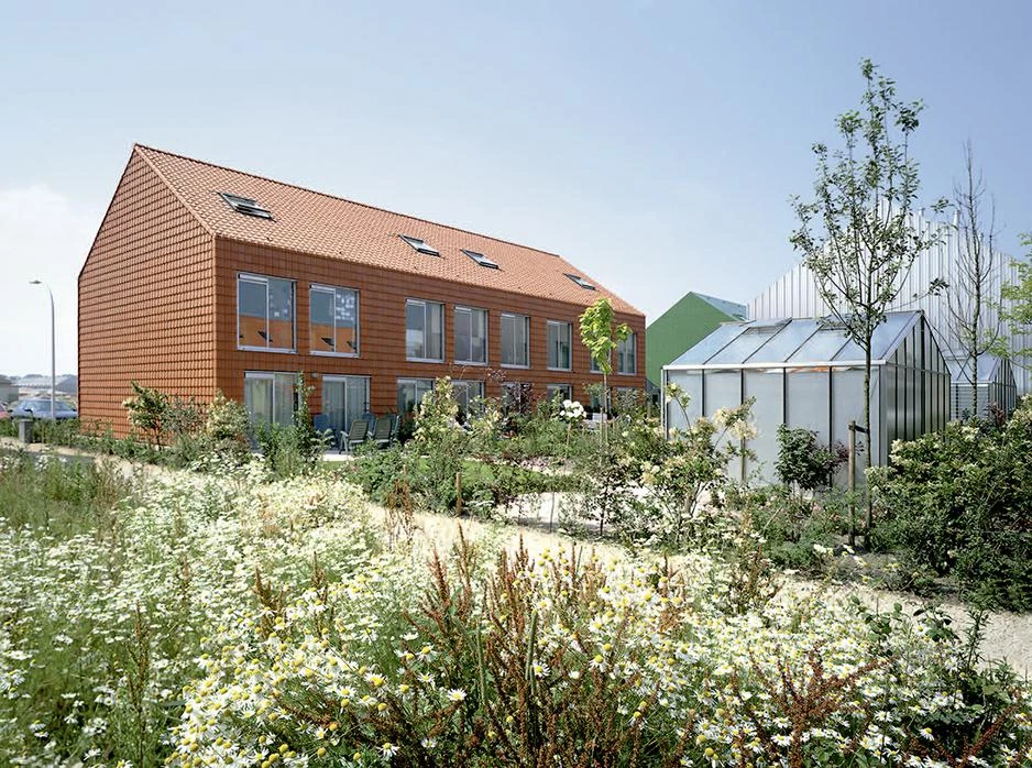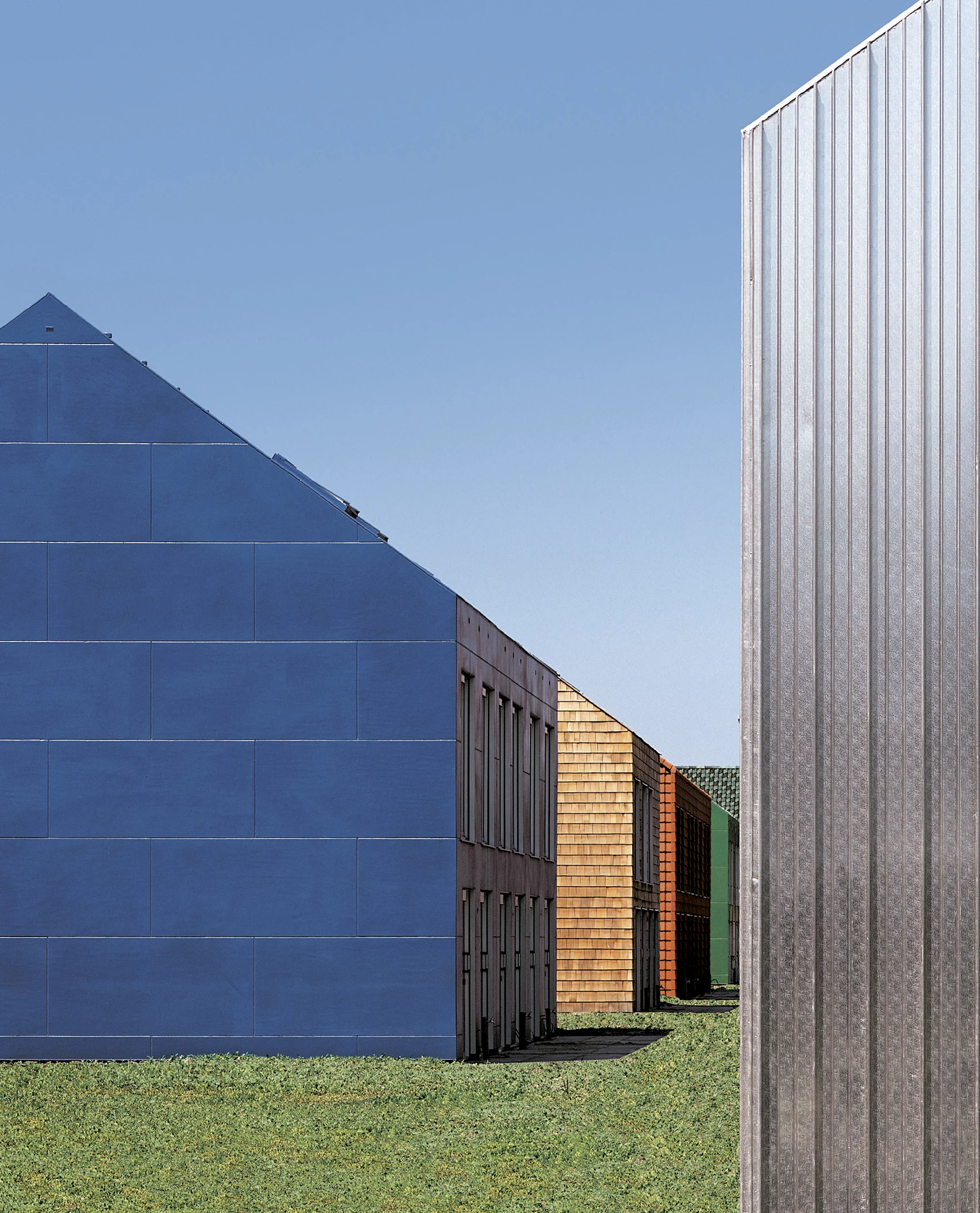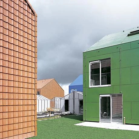 Con una disposición de parcelas en cuatro franjas de idéntica anchura, los distintos volúmenes se desplazan unos respecto a otros rompiendo la linealidad de las hileras. Es este desplazamiento el que determina el carácter global de la propuesta, al generar una serie de espacios exteriores que, en función de su orientación, transforman su uso y apariencia. Surgen así jardines enfrentados a cada pieza que, enriquecidos por las visiones en diagonal del vecindario y alternando pavimentos y césped, acogen pequeñas construcciones miméticas de las viviendas, que se utilizan como cuartos trasteros o invernaderos. Aglomerado de cemento, ripias de madera o aluminio se van alternado para revestir exteriormente las piezas, prolongando el material de la fachada a la cubierta o viceversa. En el interior, las 119 unidades son sencillas y diáfanas, permitiendo que los usuarios reinterpreten sus propias casas.