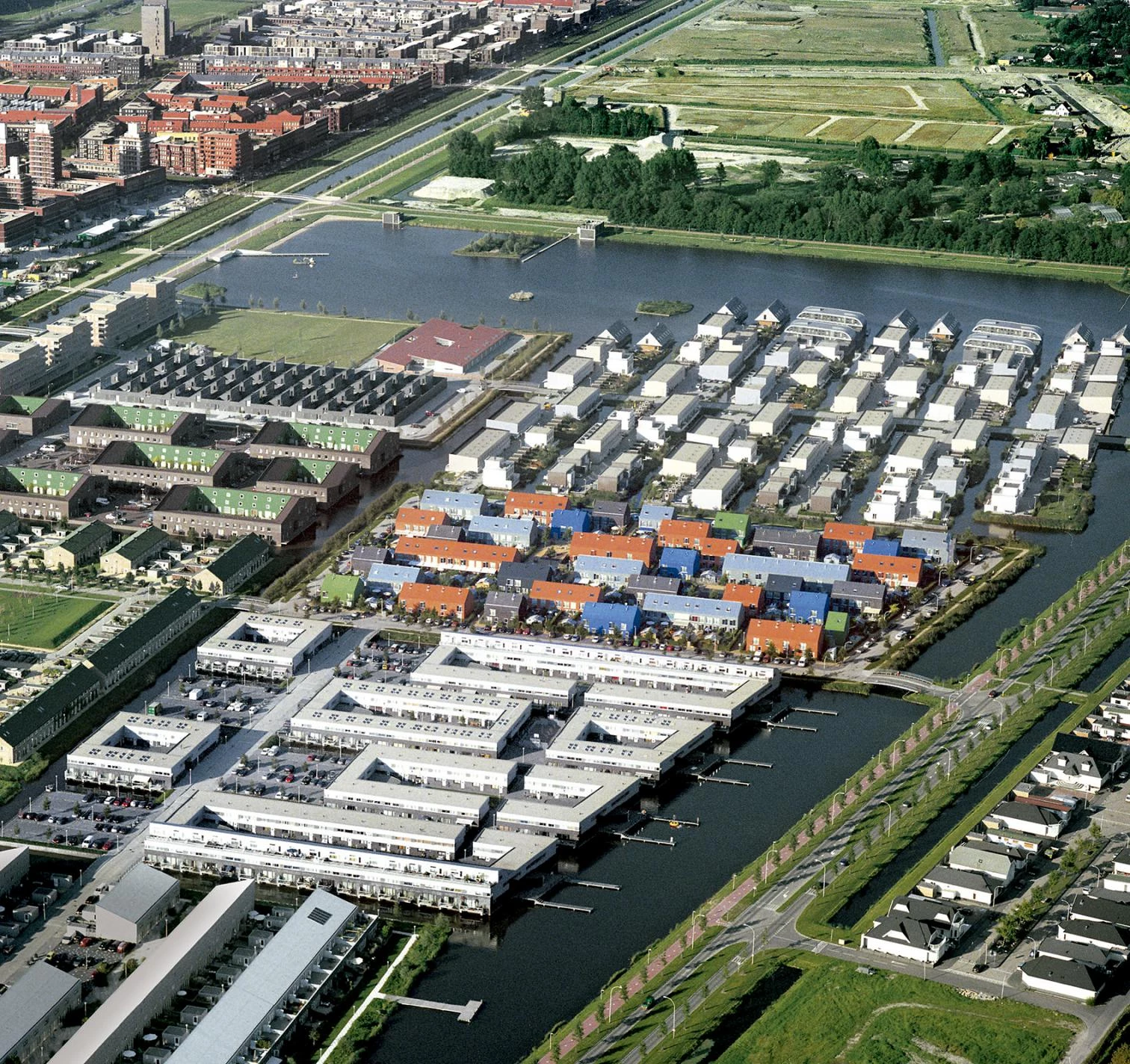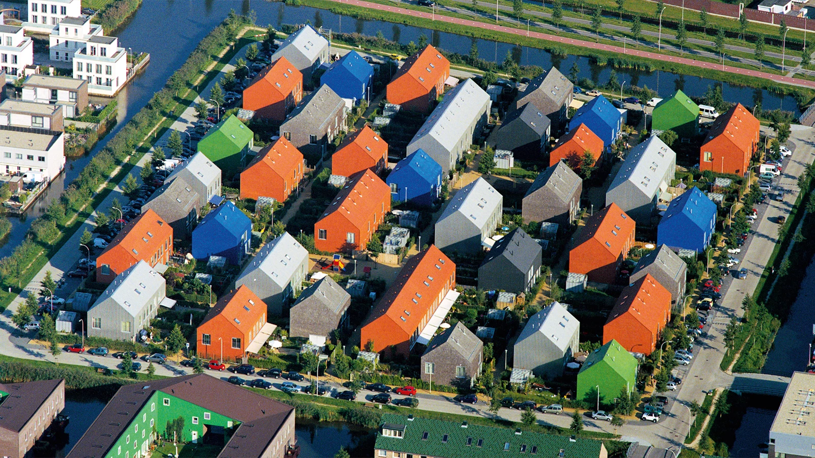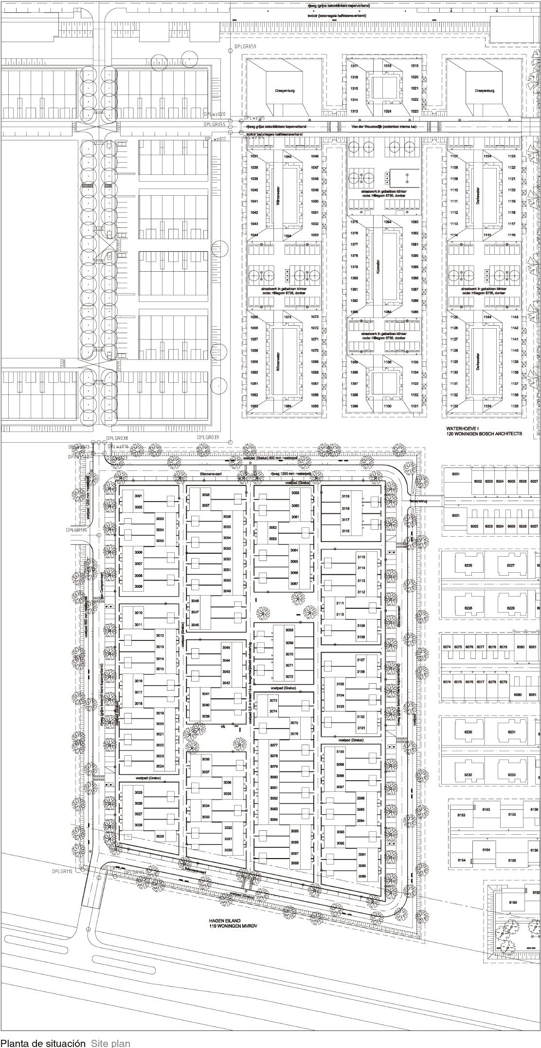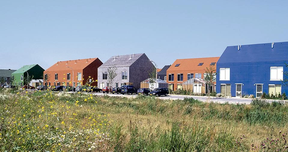En un entorno residencial de macromanzanas, en el sureste de La Haya, estas 37 piezas arquetípicas generan un pequeño barrio multicolor en los terrenos que albergaron en el pasado un aeródromo. El proyecto, diseñado como una isla peatonal, materializa un entorno de escala doméstica al que se accede tras abandonar el automóvil en el perímetro de la manzana.