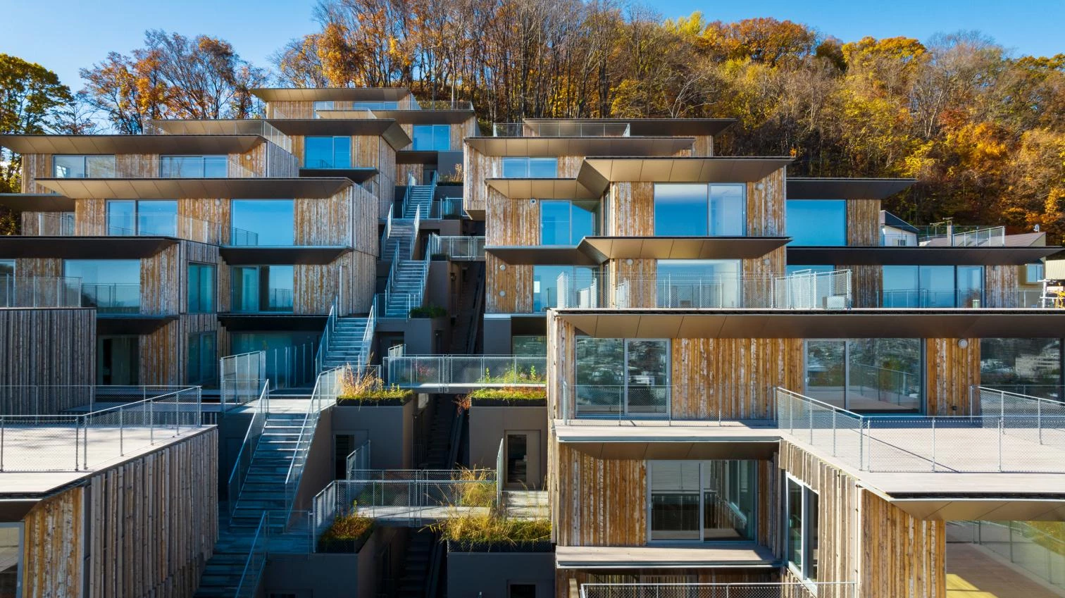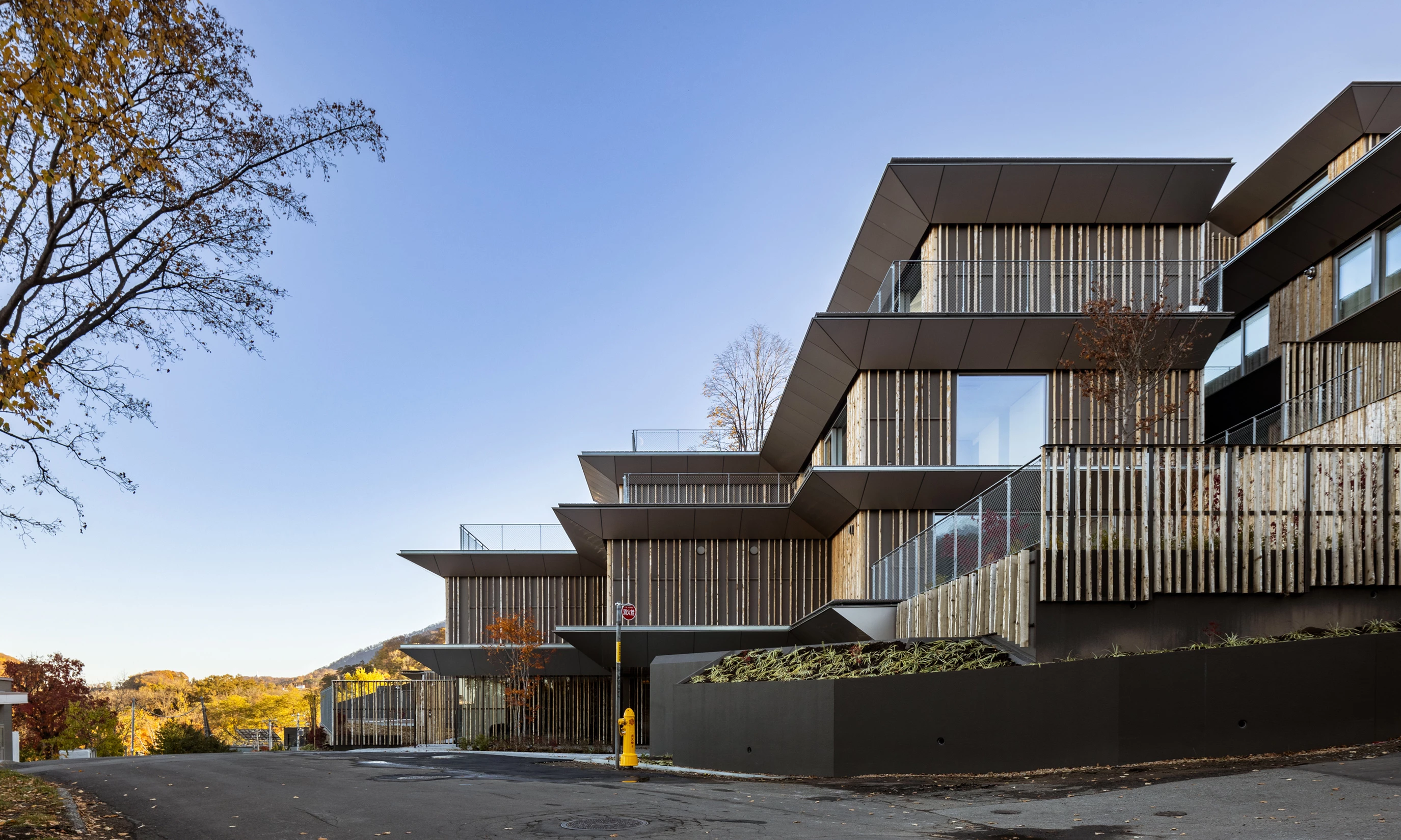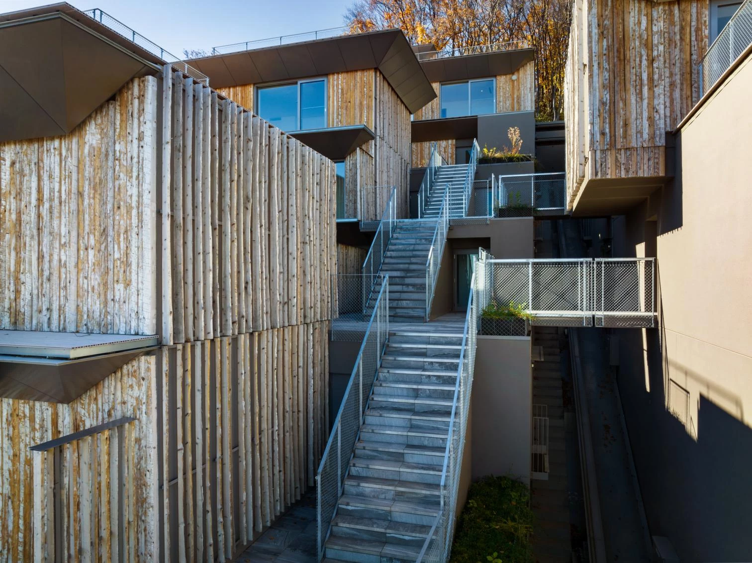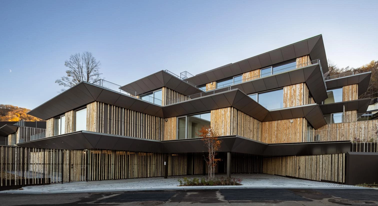Estas quince casas se apilan en la ladera de la montaña de Okura, con vistas a la ciudad de Sapporo (Hokkaido). Las piezas escalonadas emergen entre sí con la distancia necesaria para obtener ventilación y luz naturales, así como optimizar las vistas al entorno con amplios ventanales y terrazas.