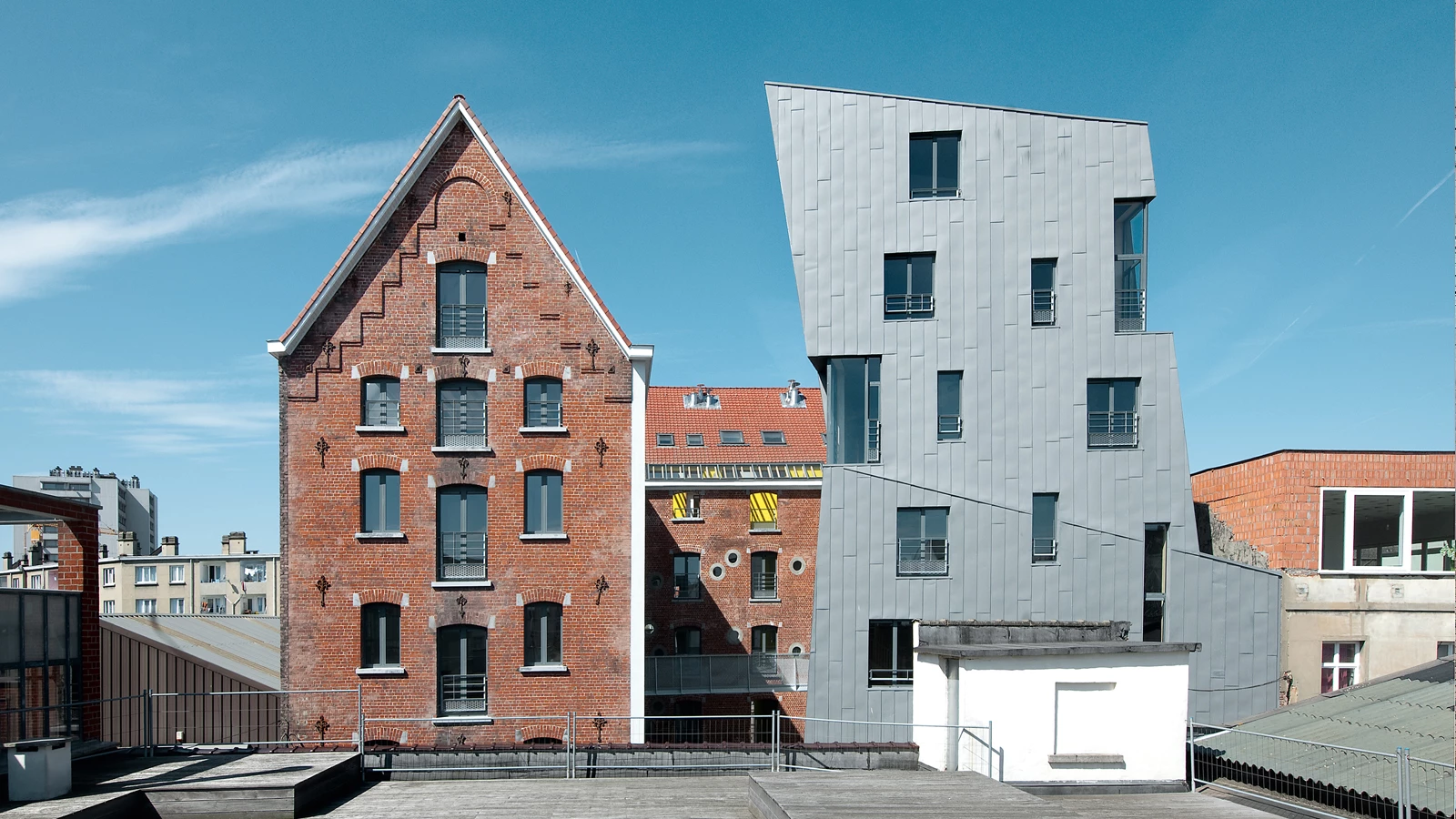 La transformación de una antigua fábrica cervecera en viviendas para artistas, que incluyen espacio para albergar sus estudios, se ha basado tanto en la rehabilitación del antiguo edificio como en la construcción de uno nuevo para alcanzar la superficie necesitada. La inserción del proyecto en su entorno podría resumirse en la búsqueda de la apertura y de una imagen singular. Como la parcela se sitúa entre dos espacios públicos, una plaza y una calle, desde los que se puede acceder al conjunto, este juega un papel de transición entre ambos. Tanto el edificio antiguo como el nuevo tienen una altura mayor que los galpones industriales que flanquean el canal, por lo que su presencia forma parte del perfil del barrio de Molenbeek.