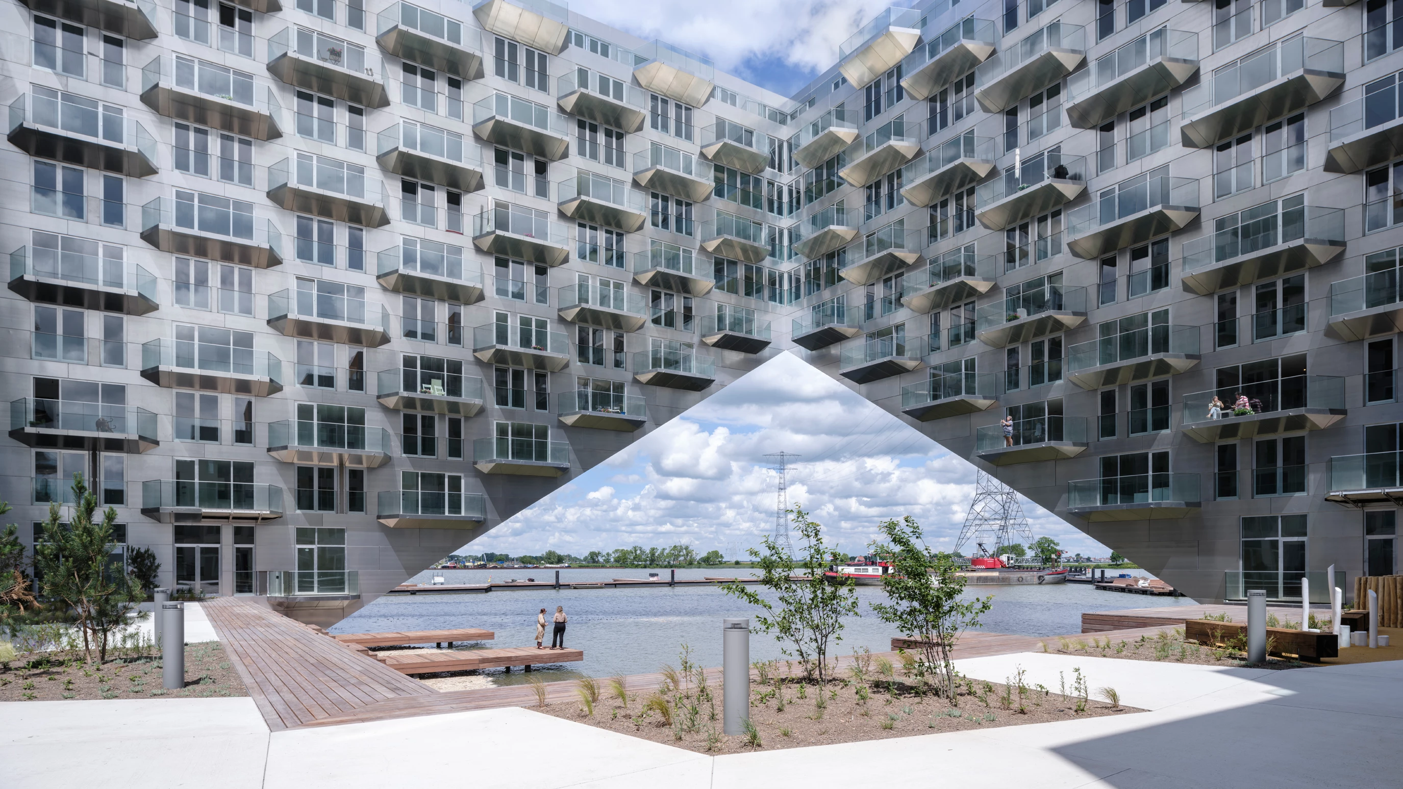 Construido sobre una isla artificial en el lago IJ, en el distrito de IJburg en Ámsterdam, este bloque residencial es fruto de la colaboración entre la firma holandesa Barcode y el estudio danés BIG. Con 442 viviendas, el conjunto abraza un puerto interior al que los barcos acceden a través de un voladizo. Esta forma distintiva para crear un corte sobre el agua contrasta con la composición de los otros dos bloques que descienden para generar terrazas. El zócalo alberga un programa variado que incluye una escuela de vela, un centro de deportes acuáticos y un restaurante. Por encima de la planta baja, los volúmenes están revestidos de aluminio para reflejar el agua circundante, mientras la caída aterrazada presenta una piel de madera.