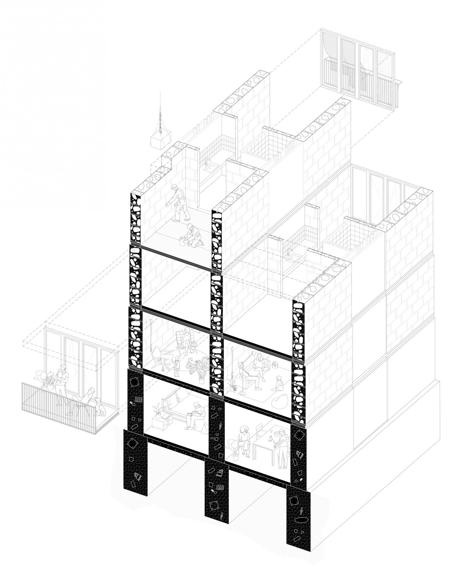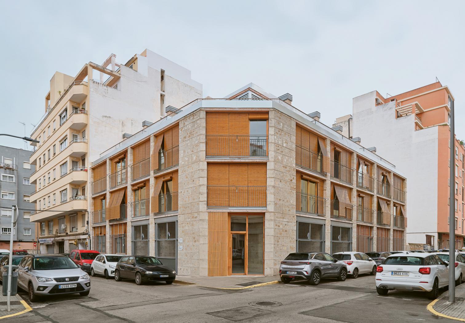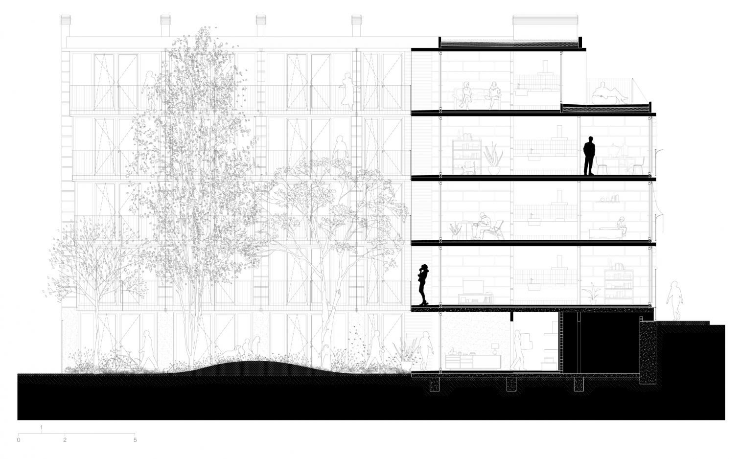Estos muros estructurales se reducen en función de la altura de la planta, y además sostienen los forjados de madera contralaminada. El diseño del edificio (tanto el acceso como la distribución de las zonas comunes y los apartamentos) responde a esta lógica estructural.