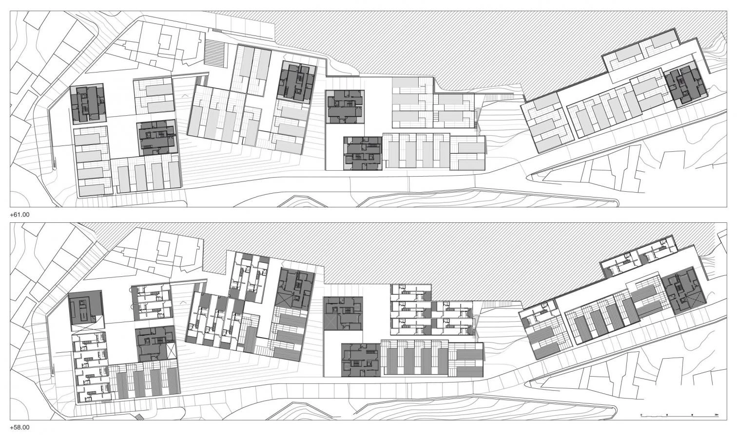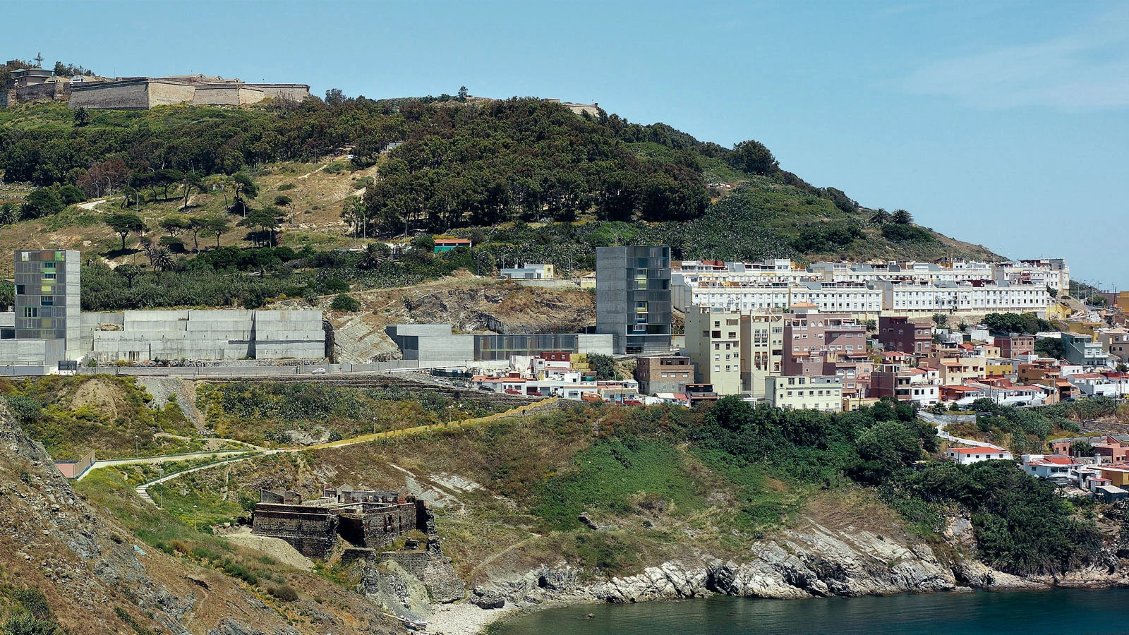 MGM Morales De Giles ArquitectosCon fuertes vientos de Levante, que soplan unos 200 días al año y con una media de 80 km/h, el Monte Hacho, principal accidente orográfico de la ciudad de Ceuta — en la orilla africana del estrecho de Gibraltar—, forma parte de ese ‘paisaje salvaje’, que van colonizando las ciudades en su prolongación. El solar, propuesto por el concurso Europan en su quinta edición, perteneció a una antigua cantera, por lo que está plagado de fosos que se excavaron para la extracción de la piedra. La impenetrabilidad de la roca y la acentuada topografía han ido forzando a las autoconstrucciones del área a adaptarse a fosas, huecos y pequeñas planicies, para ir colonizando la singularidad del lugar. Las viviendas allí construidas se protegen contra el viento, pero a la par dibujan el azote del mismo.