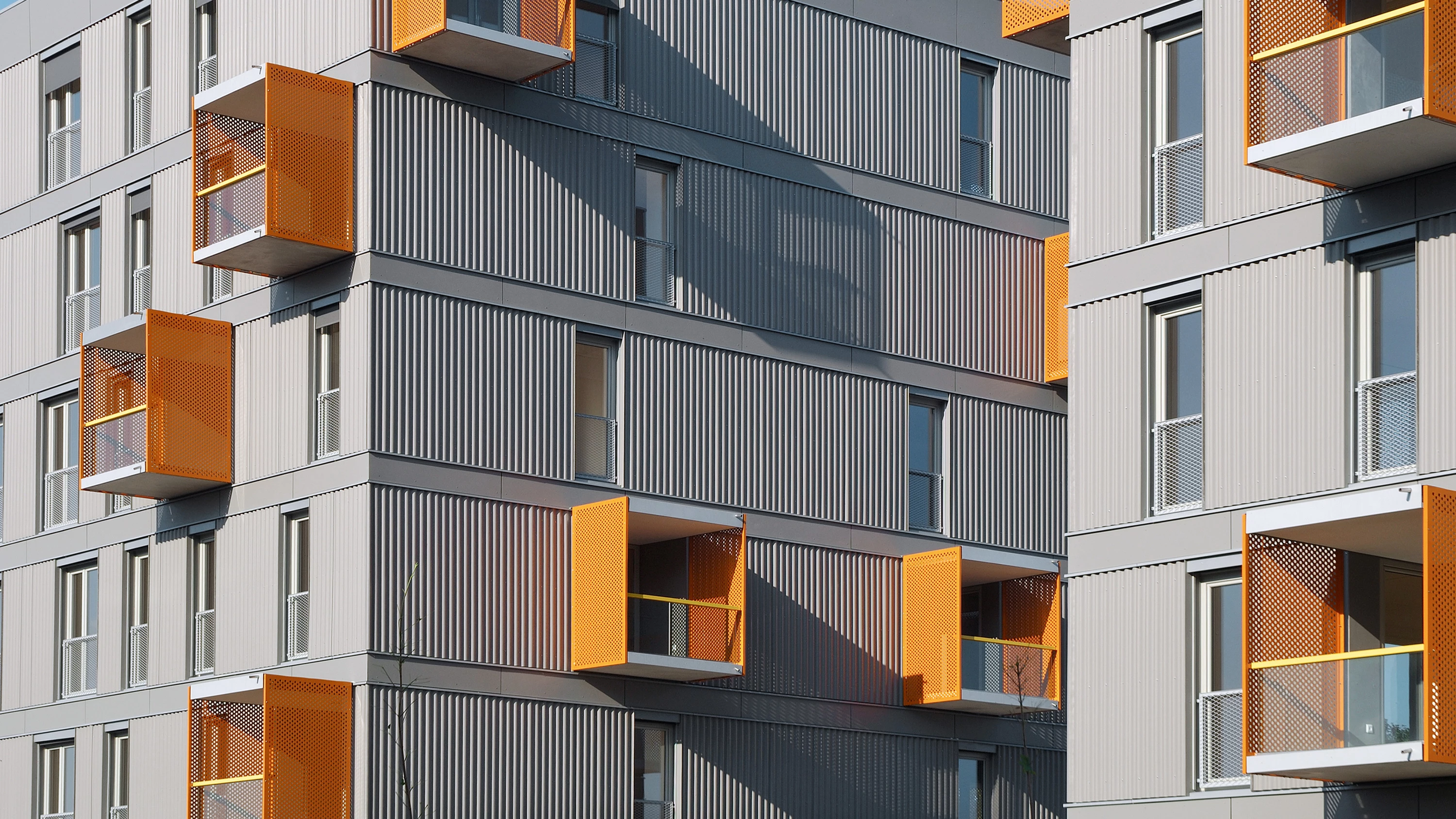 La sección del edificio se manifiesta con sinceridad en la fachada. Desde el punto de vista estético, la composición de esta surge del diálogo entre las franjas horizontales que denotan la posición del canto del forjado, y las líneas verticales onduladas que forman el ornamento de los paneles prefabricados de hormigón con los que se revisten las viviendas. Tales acabados —chapa perforada o lisa, paneles de hormigón— aluden al carácter industrial del entorno del edificio.
