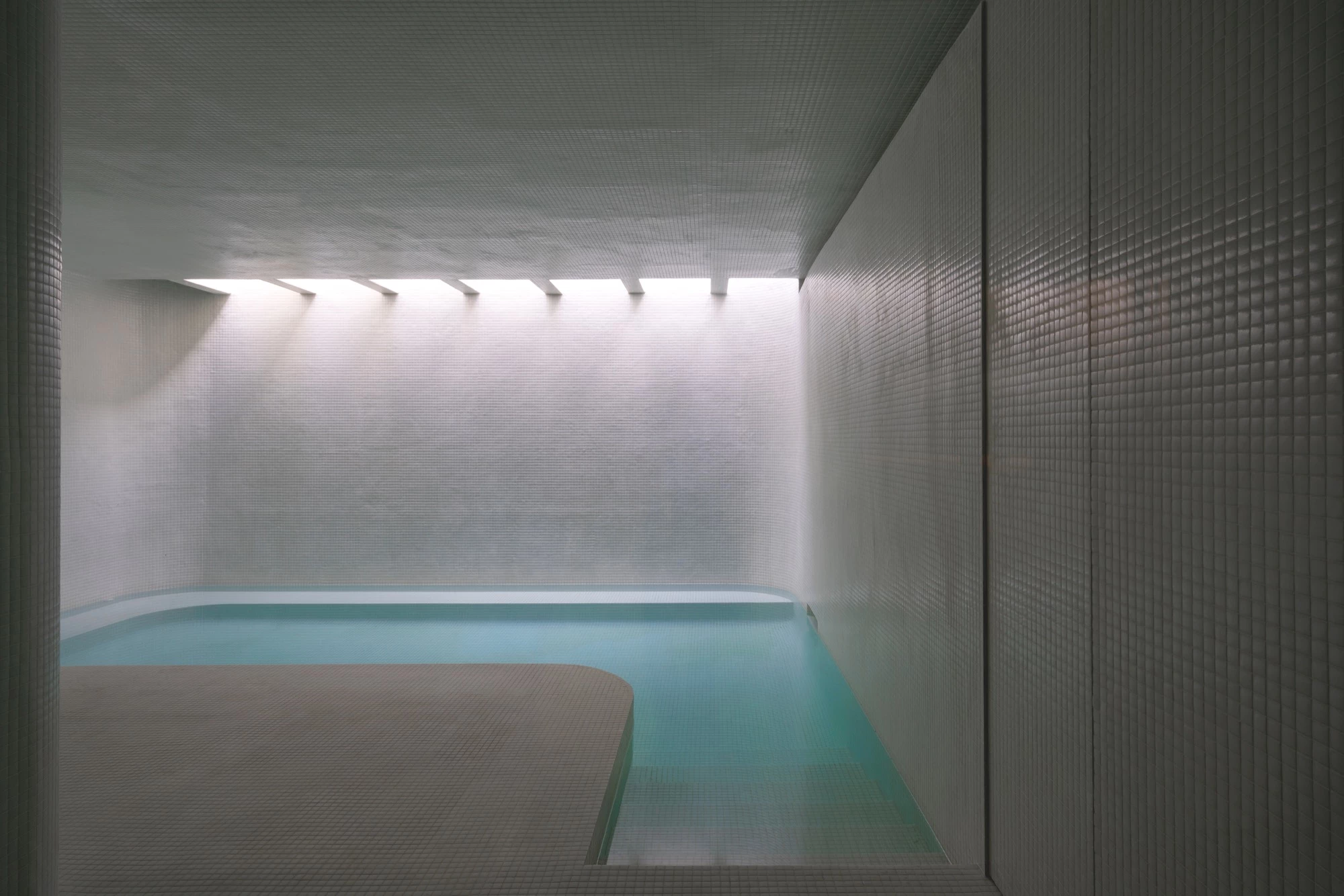 El perímetro y envolvente del espacio, además de un límite del aire y el agua, funciona como un contenedor. Así, dependiendo de las necesidades y morfología del espacio existente se formaliza como: un aislante, un contenedor de máquinas y conductos, armarios de material, o como usos anexos secundarios (sauna, baño, etc.). Los extremos del perímetro se curvan para favorecer los usos asociados, a la vez que generan espacios de oportunidad para contener las instalaciones de mayor envergadura. El material principal, un gres blanco hidrófugo, permite adaptarse a todos los planos y las formas curvas y sinuosas, multiplicando la entrada de luz cenital del lucernario. El color, los materiales, la forma y la luz hacen del espacio un lugar neutro, libre de uso, un espacio para la evasión.