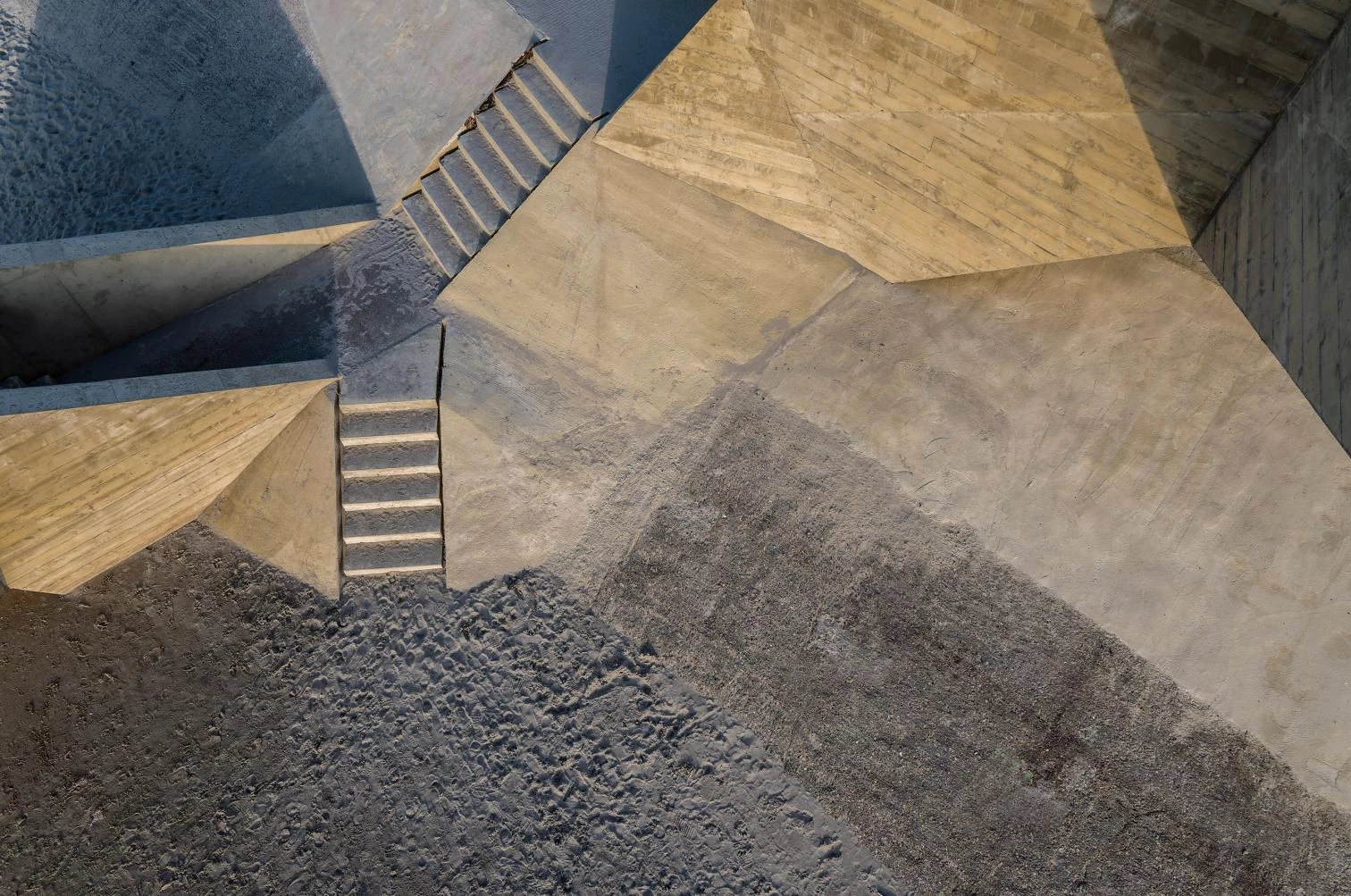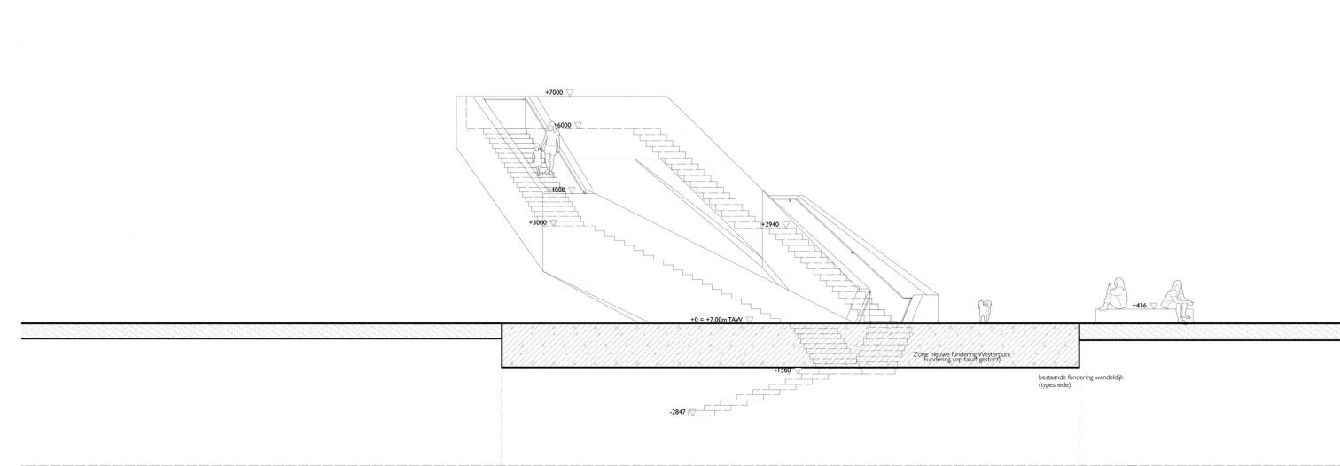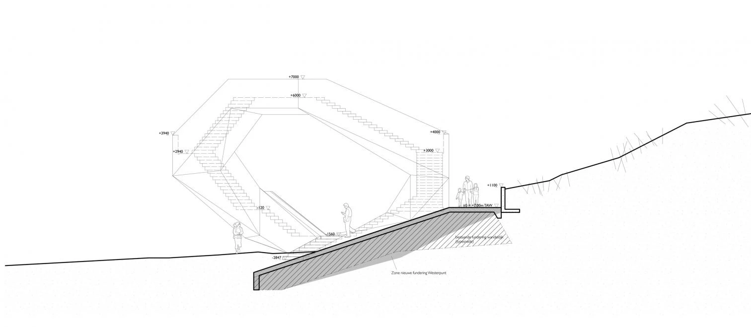 La estructura de hormigón, parcialmente sumergida durante la marea alta, se construyó utilizando una serie de secciones de escaleras rectas, conectadas en ángulos de 108 grados, con pequeños descansos entre cada una, y una amplia área de observación en la parte superior del mirador escultural. Los lados altos protegen al visitante, mientras que la parte inferior genera una forma facetada. De esta manera, forma, estructura y función están unificadas.