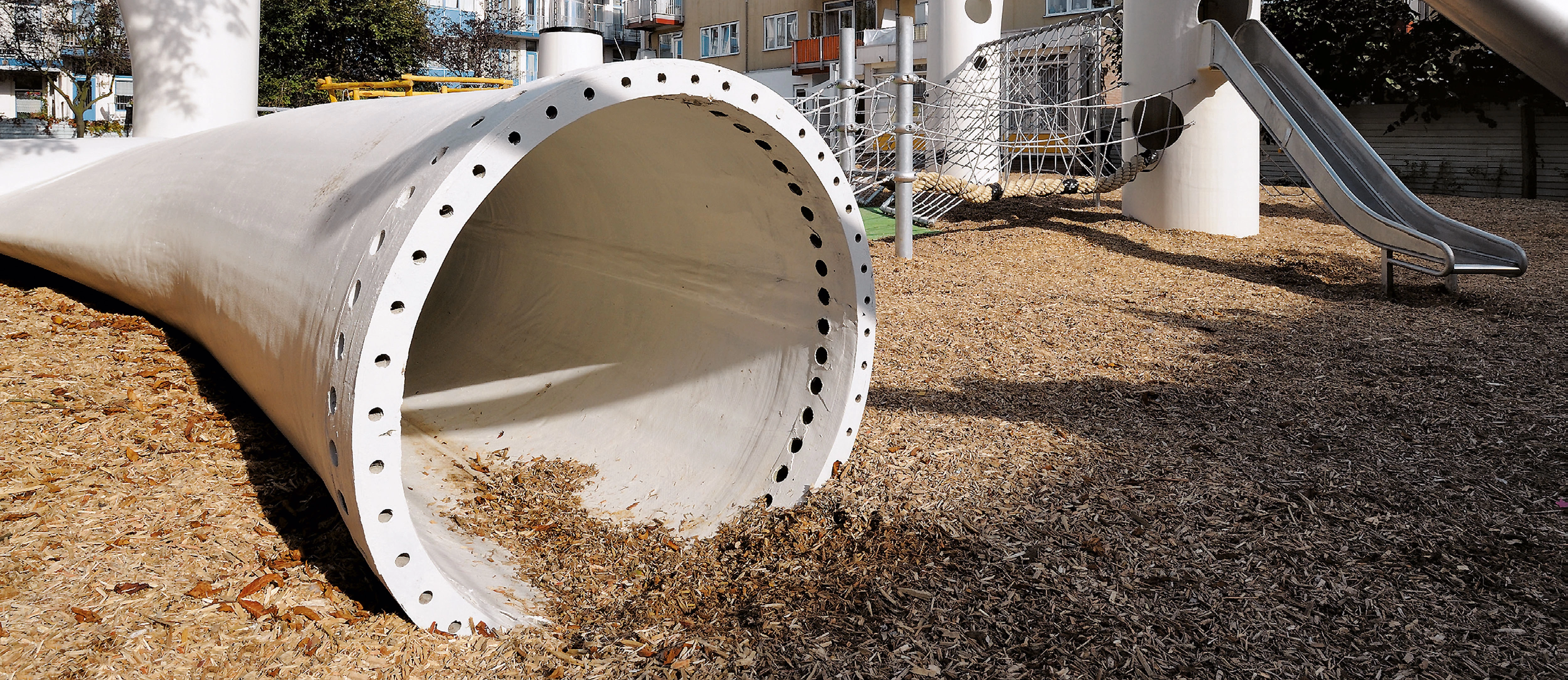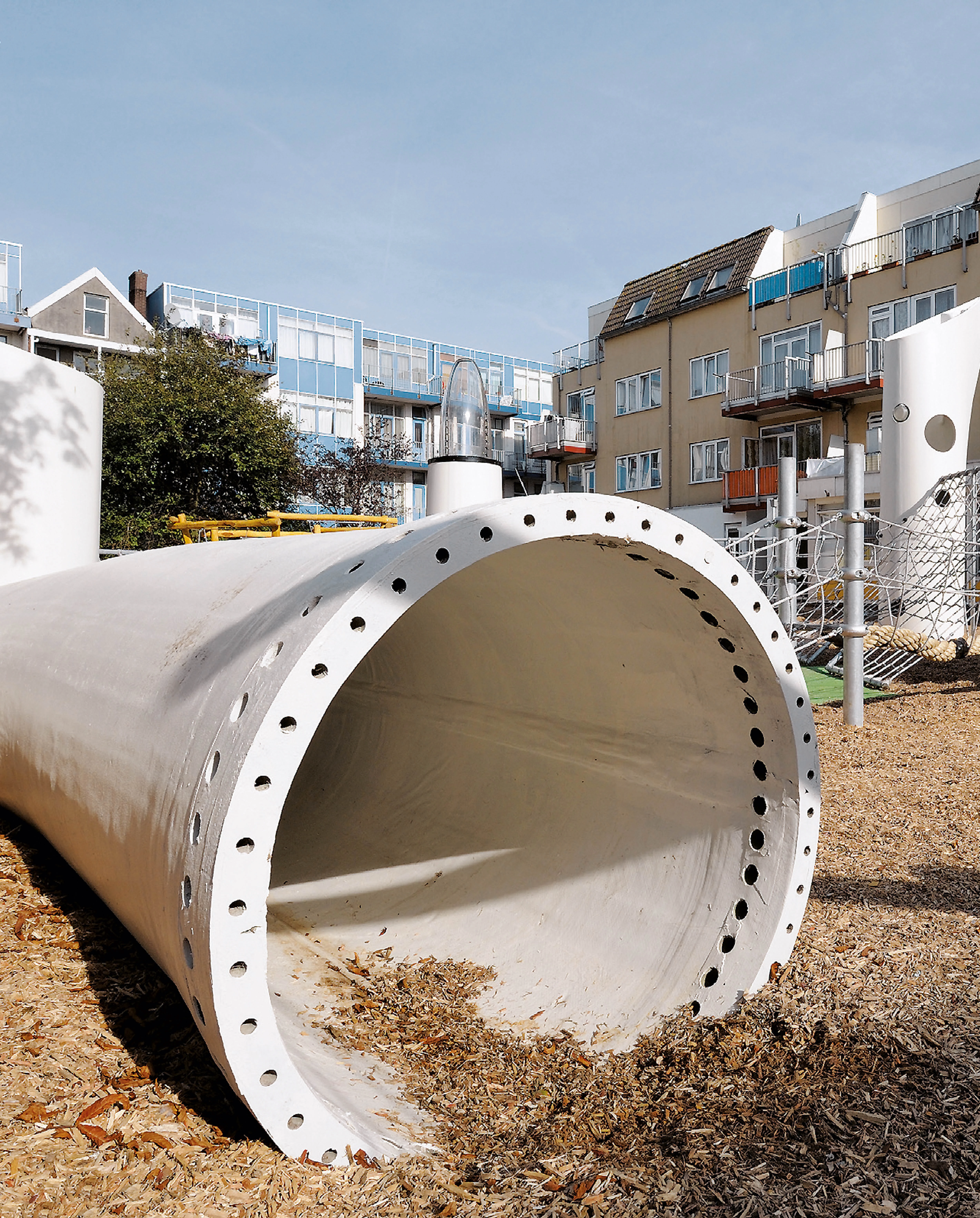 Las aspas de los molinos de viento, con curvas suaves por su forma aerodinámica, se transforman en un espacio de juego; integrando los árboles del solar, se construye un laberinto con cuatro torres, una red y un panna-cage...[+]