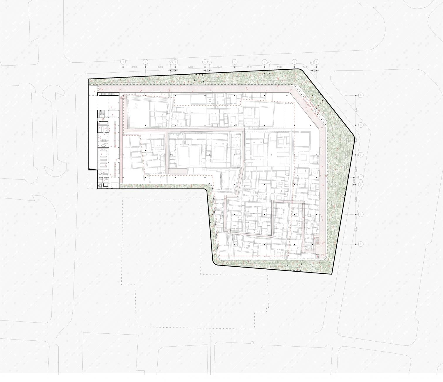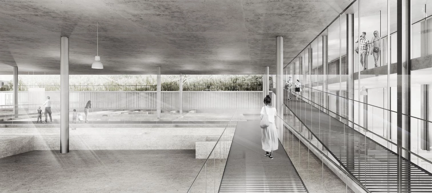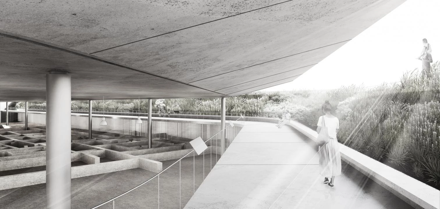 Presentado bajo el lema ‘ha-ha’, término que hace referencia a una zanja abierta en el terreno que impide el paso sin interrumpir la visión continua del paisaje, el proyecto premiado busca poner en valor del yacimiento arqueológico y cubrirlo respetuosamente para asegurar su conservación mediante una recreación del Jardín de San Esteban. De esta manera, el parque elevado descansa sobre un gran plato de hormigón tapizado con vegetación de bajo consumo hídrico y especies aromáticas, inspiradas en la tradición de los jardines andalusíes, que además aportan sombra. El vacío perimetral, que une presente y pasado, permite a la visita museográfica un recorrido con vistas sobre las ruinas, así como la ventilación natural cruzada del yacimiento, evitando el crecimiento de líquenes en las ruinas y protegiéndolo de la lluvia. El conjunto asegura la continuidad con la trama urbana, y está cerrado al noroeste con el centro de interpretación.