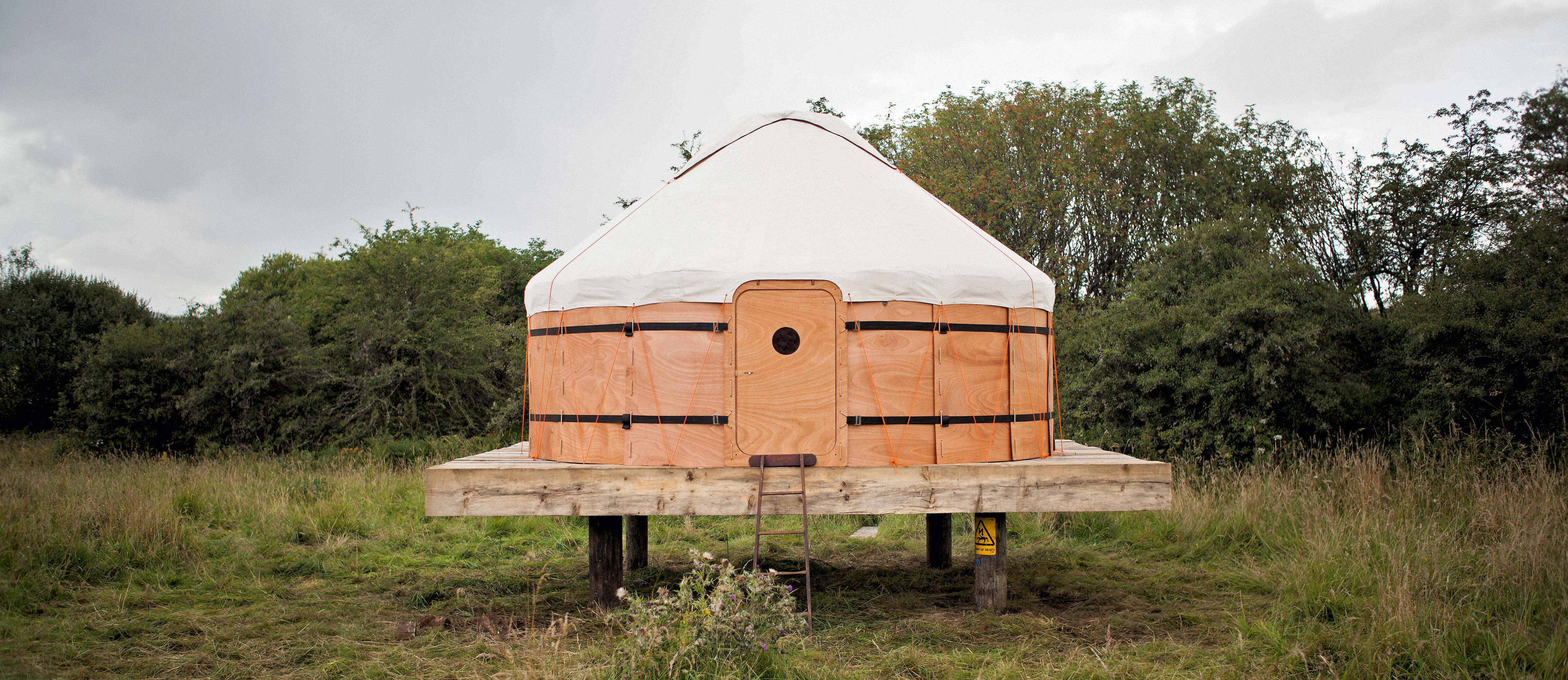 Versión actualizada de las tiendas portátiles tradicionales de los pueblos nómadas de Asia Central, el proyecto se construye con piezas de madera de balsa, fijadas entre sí con cuerda de poliéster y uniones de acero inoxidable, y cubiertas con lona de algodón.