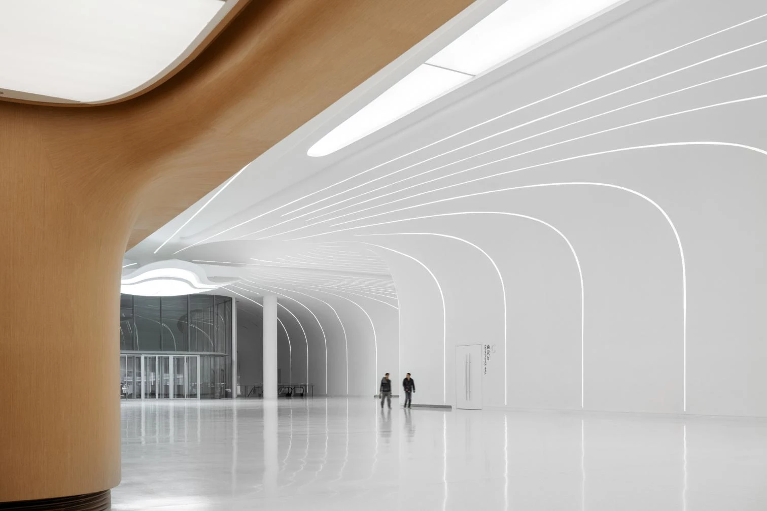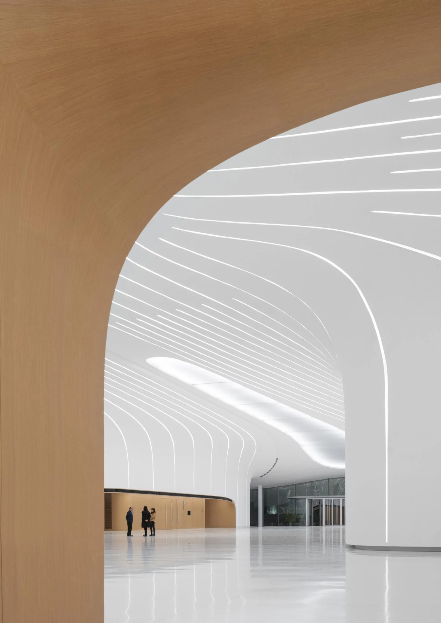 La simplicidad del interior pretende crear espacios de fácil uso que potencien la interacción social. El Centro Internacional de Innovación ZGC cuenta con dos amplios lucernarios de ETFE, que permiten que la luz natural inunde el recinto.