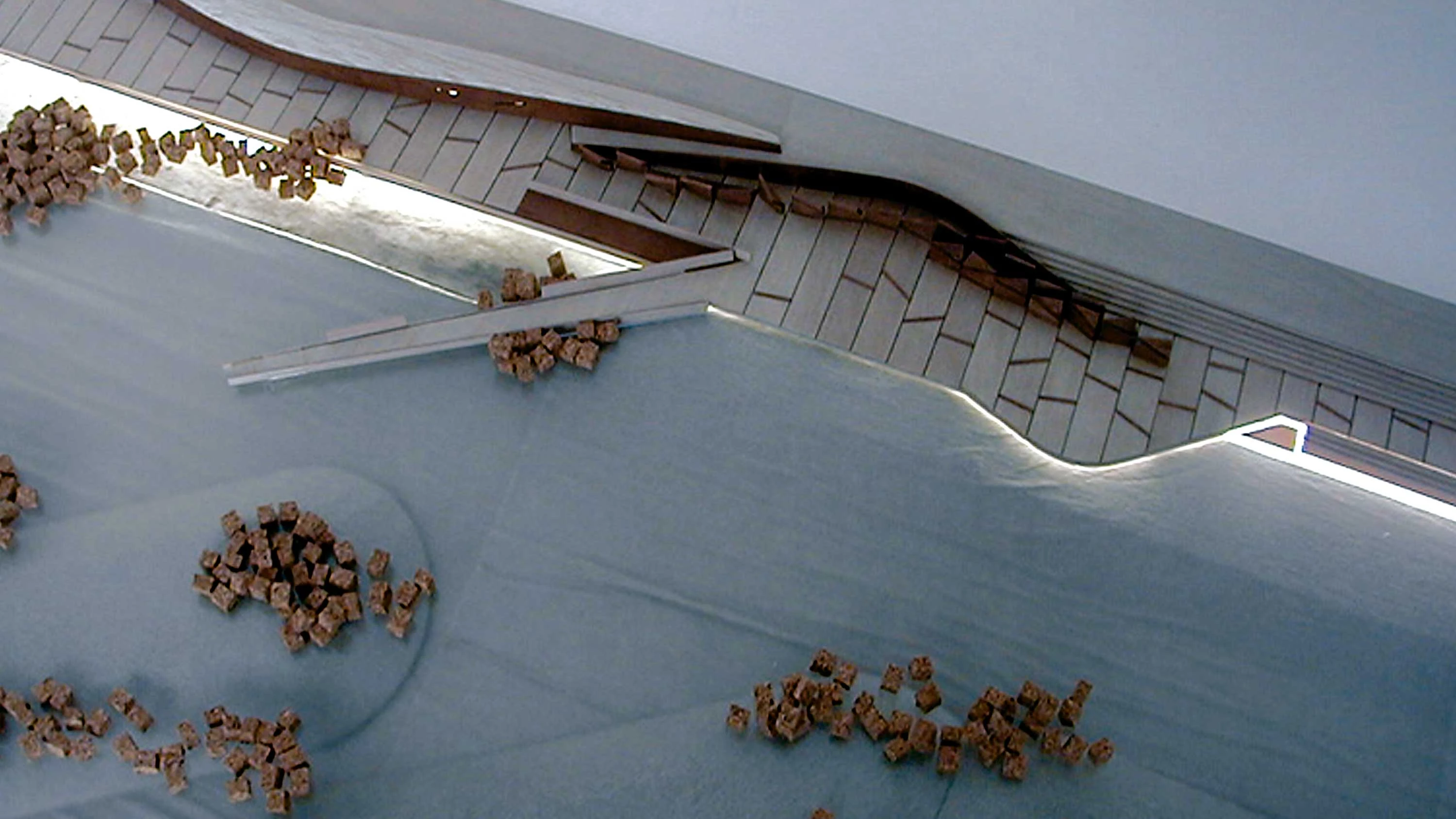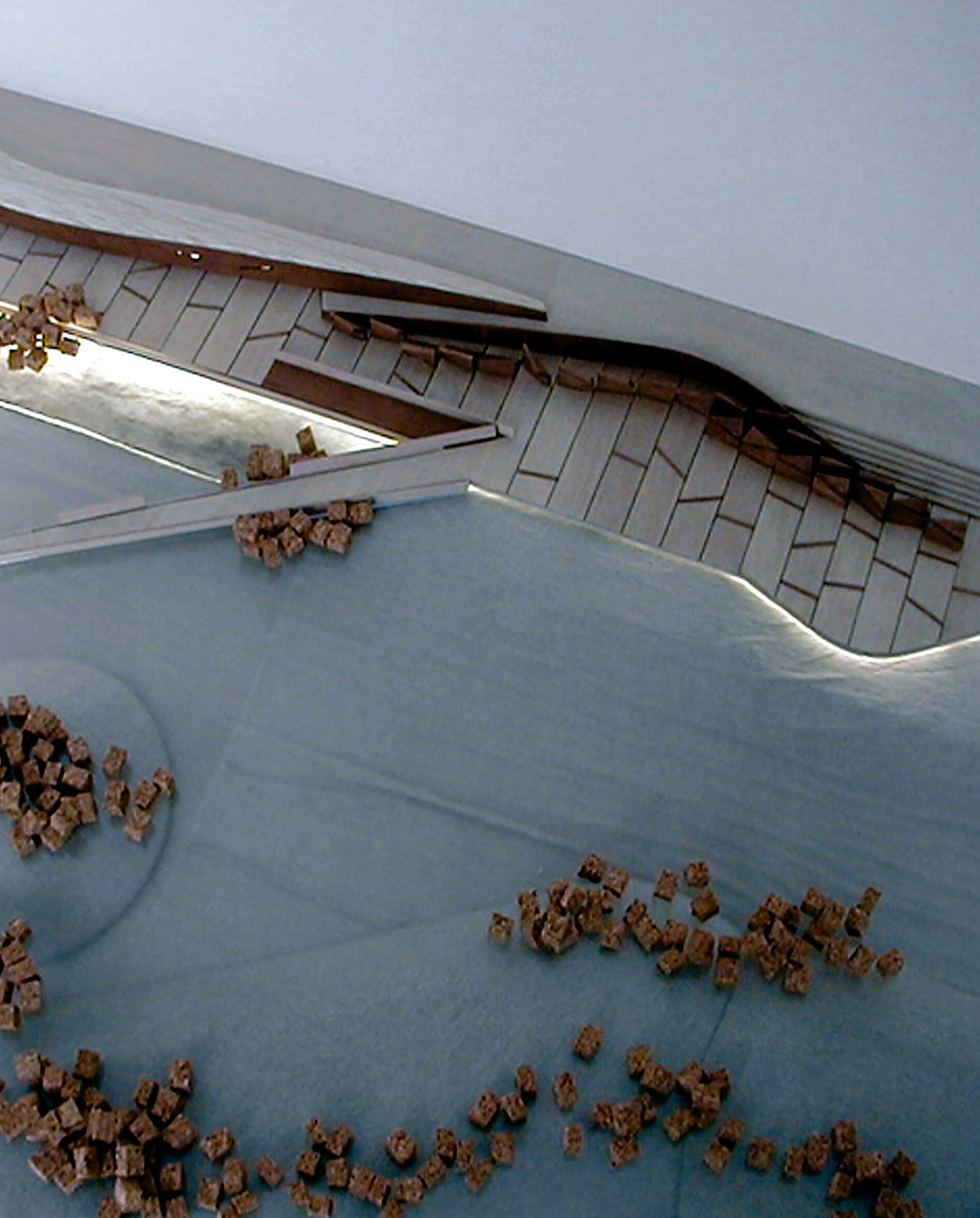 Como alternativa a las playas convencionales se plantea un muelle escalonado, con suelo de piedra del Marés y muros de acero cortén que albergan vestuarios y servicios, bien protegido de los temporales por una escollera artificial...[+]