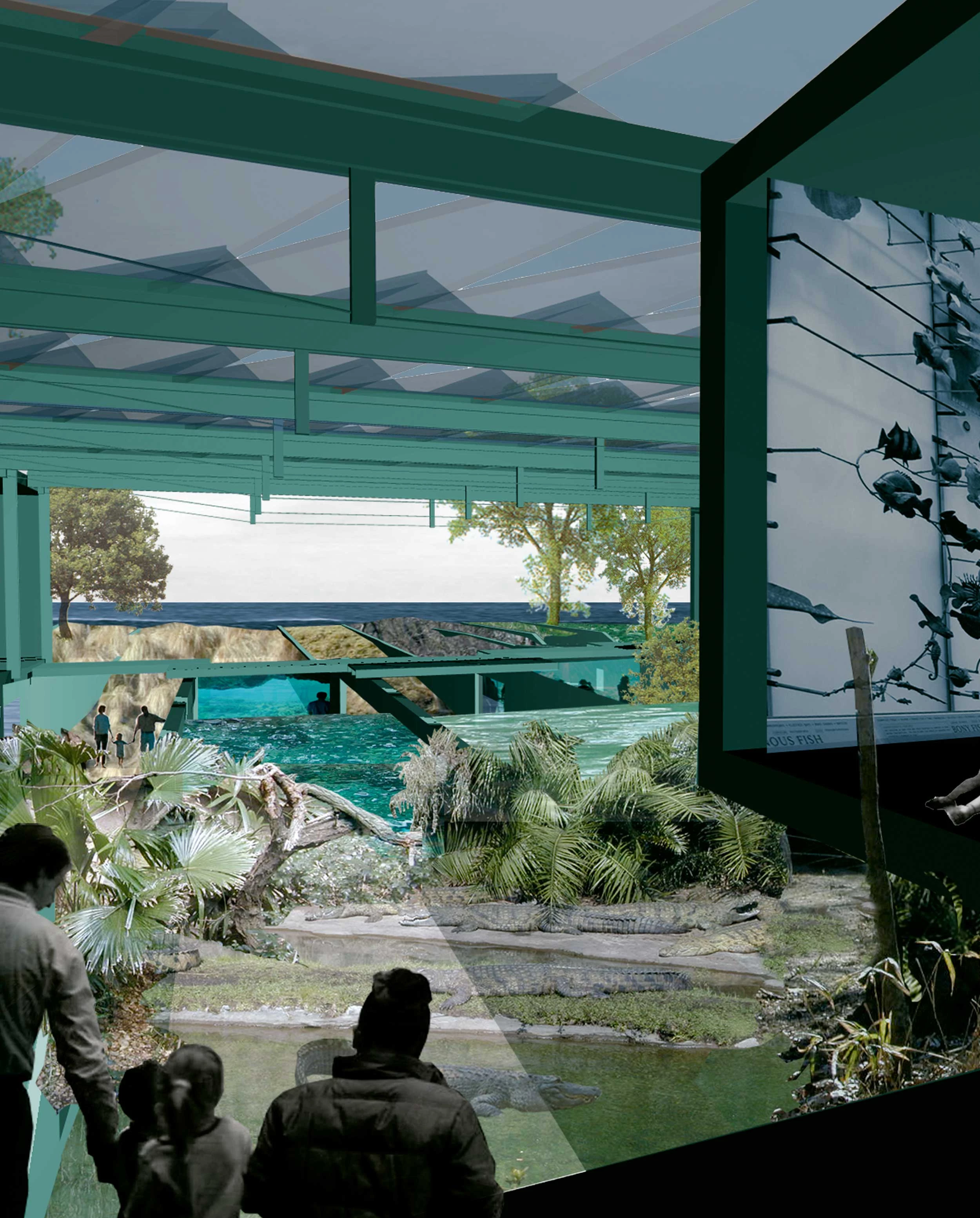 El valioso parque de reptiles y anfibios del antiguo zoo abandona el modelo de instalación oscura (obsoleto y procedente de otras latitudes) para aprovechar la luz natural y los medios pasivos de control ambiental. El plano del suelo se ordena mediante pequeños muros de hormigón y parterres áridos que enriquecen las texturas del recinto...[+]