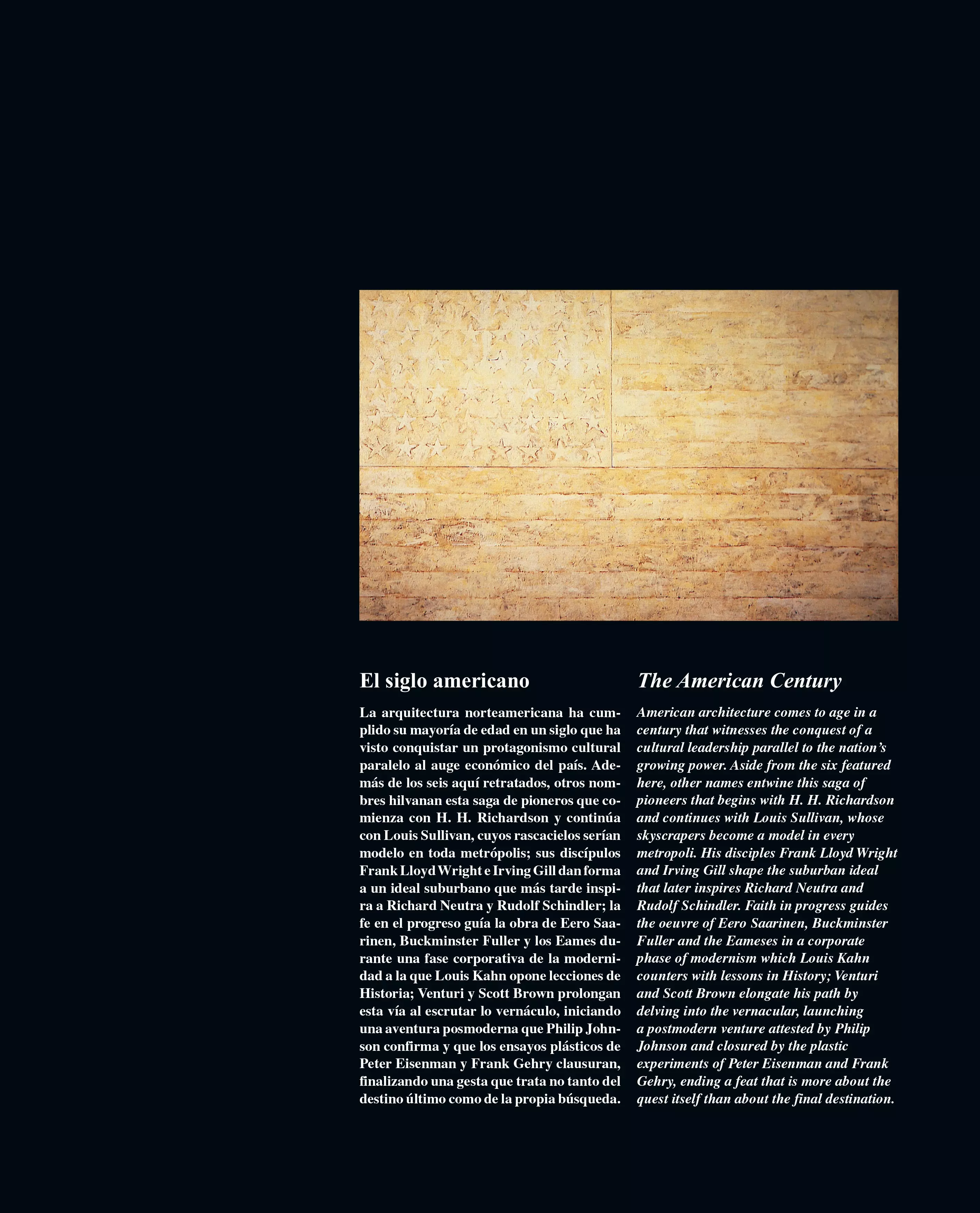 A fin de componer un retrato más compacto, Filler ha añadido un prólogo que trenza las seis biografías y menciona algunas de las ausencias. ¿Cómo no comenzar el relato con Richardson, fundamento canónico de Sullivan y Wright? ¿Y cómo hacerlo con alguien fallecido 24 años antes de que el siglo se inicie? Si están los Eames, ¿por qué faltan los vieneses de California, Schindler y Neutra, o el espíritu inventivo de Fuller? ¿Cómo explicar la reacción de Kahn y Venturi en Filadelfia sin dar cuenta de la jerarquía del Mies de Chicago o la influencia de Johnson desde el MoMA? ¿La muerte prematura de Saarinen o el desarrollo tardío de Eisenman les ha negado el oceánico reconocimiento de que disfruta Gehry? Los interrogantes se enredan como cerezas, pero no es éste un retrato de grupo, sino un grupo de retratos individuales que roturan el territorio de la arquitectura con un ánimo más próximo al de los pioneros americanos que al de los colectivos corales europeos.