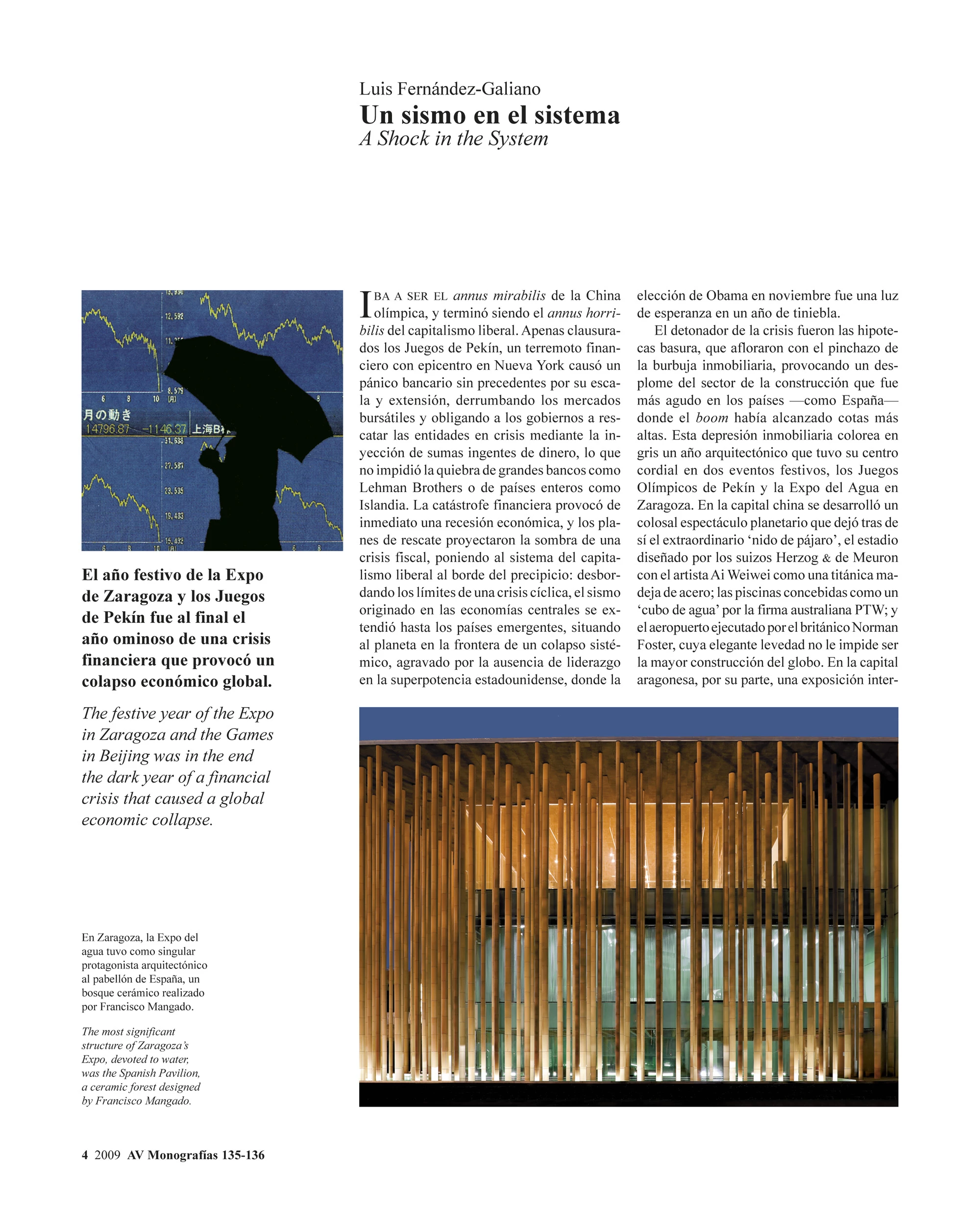 El detonador de la crisis fueron las hipotecas basura, que afloraron con el pinchazo de la burbuja inmobiliaria, provocando un desplome del sector de la construcción que fue más agudo en los países —como España— donde el boom había alcanzado cotas más altas. Esta depresión inmobiliaria colorea en gris un año arquitectónico que tuvo su centro cordial en dos eventos festivos, los Juegos Olímpicos de Pekín y la Expo del Agua en Zaragoza. En la capital china se desarrolló un colosal espectáculo planetario que dejó tras de sí el extraordinario ‘nido de pájaro’, el estadio diseñado por los suizos Herzog & de Meuron con el artista Ai Weiwei como una titánica madeja de acero; las piscinas concebidas como un ‘cubo de agua’ por la firma australiana PTW; y el aeropuerto ejecutado por el británico Norman Foster, cuya elegante levedad no le impide ser la mayor construcción del globo. En la capital aragonesa, por su parte, una exposición internacional sobre el agua y el desarrollo sostenible —aunque también vinculada al segundo centenario de la Guerra de la Independencia, de cuyo inicio Zaragoza fue protagonista— produjo, entre el habitual turbión de construcciones efímeras, algunos edificios singulares, del pabellón-puente de la anglo-iraquí Zaha Hadid al palacio de congresos de los madrileños Nieto y Sobejano, y una obra excepcional, el pabellón de España, materializado como un bosque lírico y exacto de columnas cerámicas por el navarro Francisco Mangado.