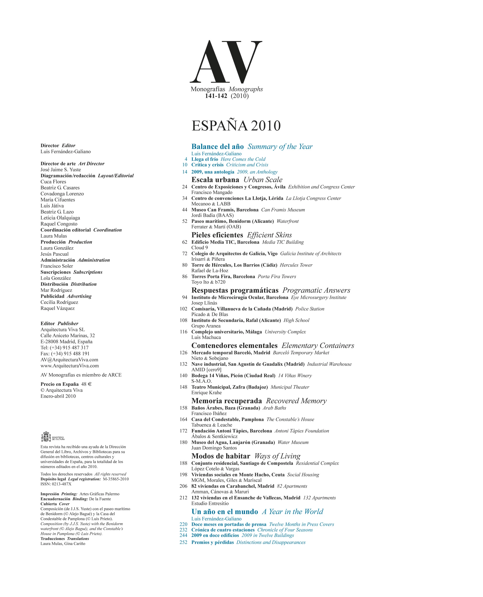 El año tuvo asimismo la habitual lista de premios, encabezada por el Pritzker, que ganó el severo suizo Peter Zumthor, y el Mies, que se otorgó a la Ópera de Oslo, una obra horizontal, paisajística y urbana del estudio Snøhetta; el portugués Álvaro Siza recibió a la vez el Oro británico y el francés, mientras el estadounidense recaía en el australiano Glenn Murcutt; la angloiraquí Zaha Hadid, que terminó el museo MAXXI en Roma, fue galardonada con el Praemium Imperiale, y el norteamericano Steven Holl, que inauguró el museo Knut Hamsun en la Noruega de sus orígenes, fue el primer receptor del generosamente dotado premio de la Fundación BBVA; el británico Norman Foster, que inauguró en Madrid la primera exposición exhaustiva de sus dibujos, fue distinguido con el Príncipe de Asturias de las Artes, siendo el cuarto arquitecto que obtiene este premio, el más prestigioso de los concedidos en España, donde los organismos profesionales también destacaron dos obras recientes: el Teatro del Canal en Madrid, un proyecto de Juan Navarro Baldeweg que recibió el premio de la Bienal, y el Pabellón de España en Zaragoza, una realización de Francisco Mangado a la que le fue otorgada el Premio de Arquitectura Española, al mismo tiempo que el navarro completaba otras dos obras importantes, el Palacio de Congresos de Ávila y el Museo de Arqueología de Álava.