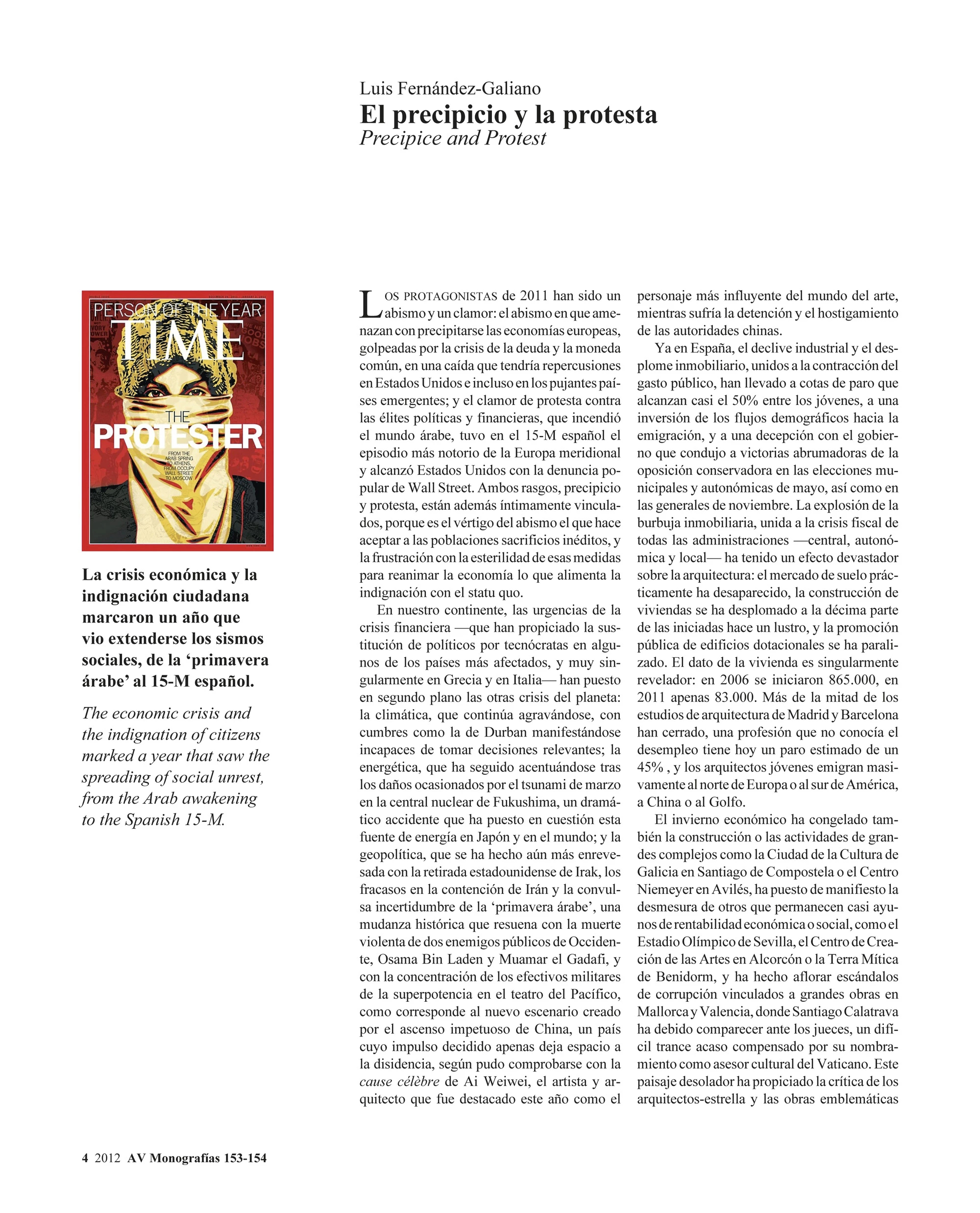 Los protagonistas de 2011 han sido un abismo y un clamor: el abismo en que amenazan con precipitarse las economías europeas, golpeadas por la crisis de la deuda y la moneda común, en una caída que tendría repercusiones en Estados Unidos e incluso en los pujantes países emergentes; y el clamor de protesta contra las élites políticas y financieras, que incendió el mundo árabe, tuvo en el 15-M español el episodio más notorio de la Europa meridional y alcanzó Estados Unidos con la denuncia popular de Wall Street. Ambos rasgos, precipicio y protesta, están además íntimamente vinculados, porque es el vértigo del abismo el que hace aceptar a las poblaciones sacrificios inéditos, y la frustración con la esterilidad de esas medidas para reanimar la economía lo que alimenta la indignación con el statu quo.