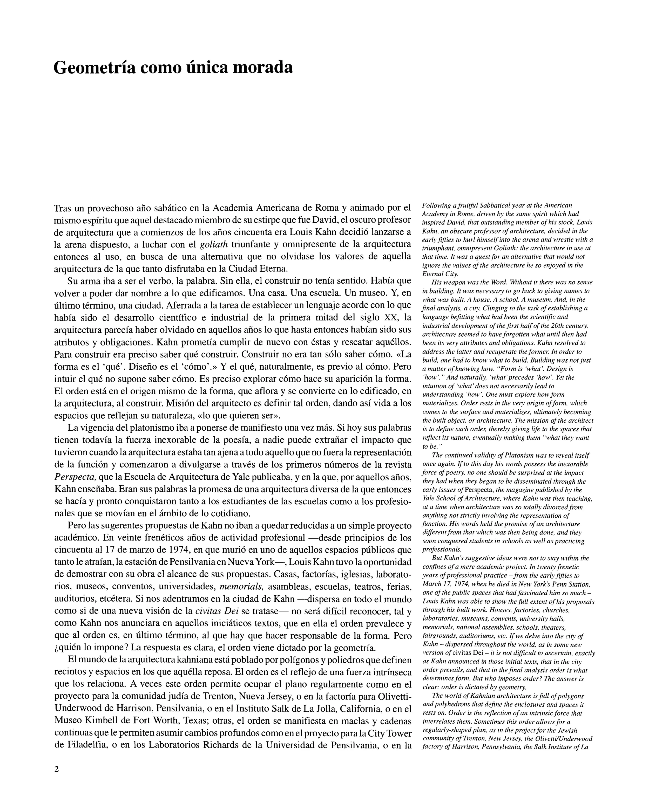 Tras un provechoso ano sabático en la Academia Americana de Roma y animado por el mismo espíritu que aquel destacado miembro de su estirpe que fue David, el oscuro profesor de arquitectura que a comienzos de los años cincuenta era Louis Kahn decidió