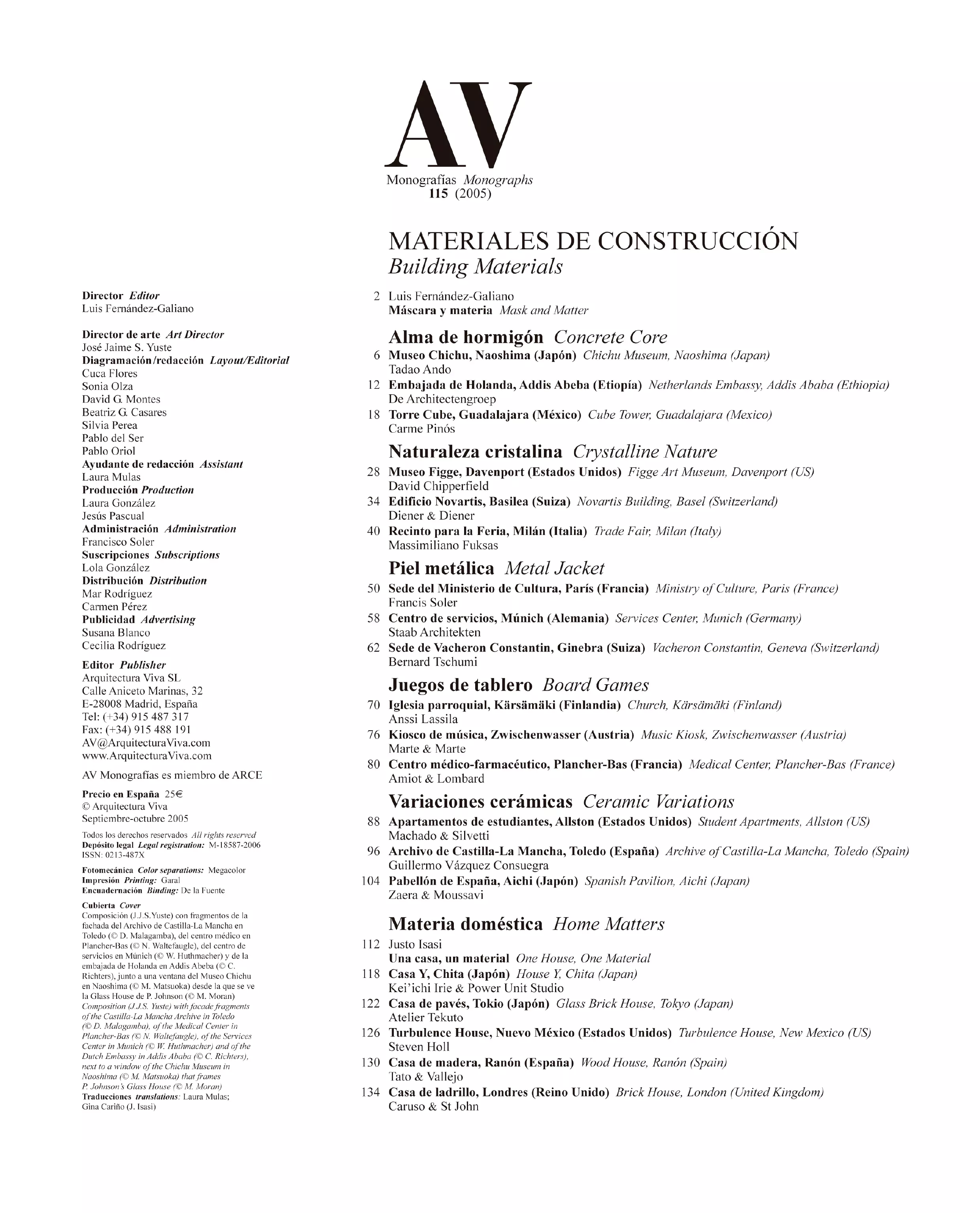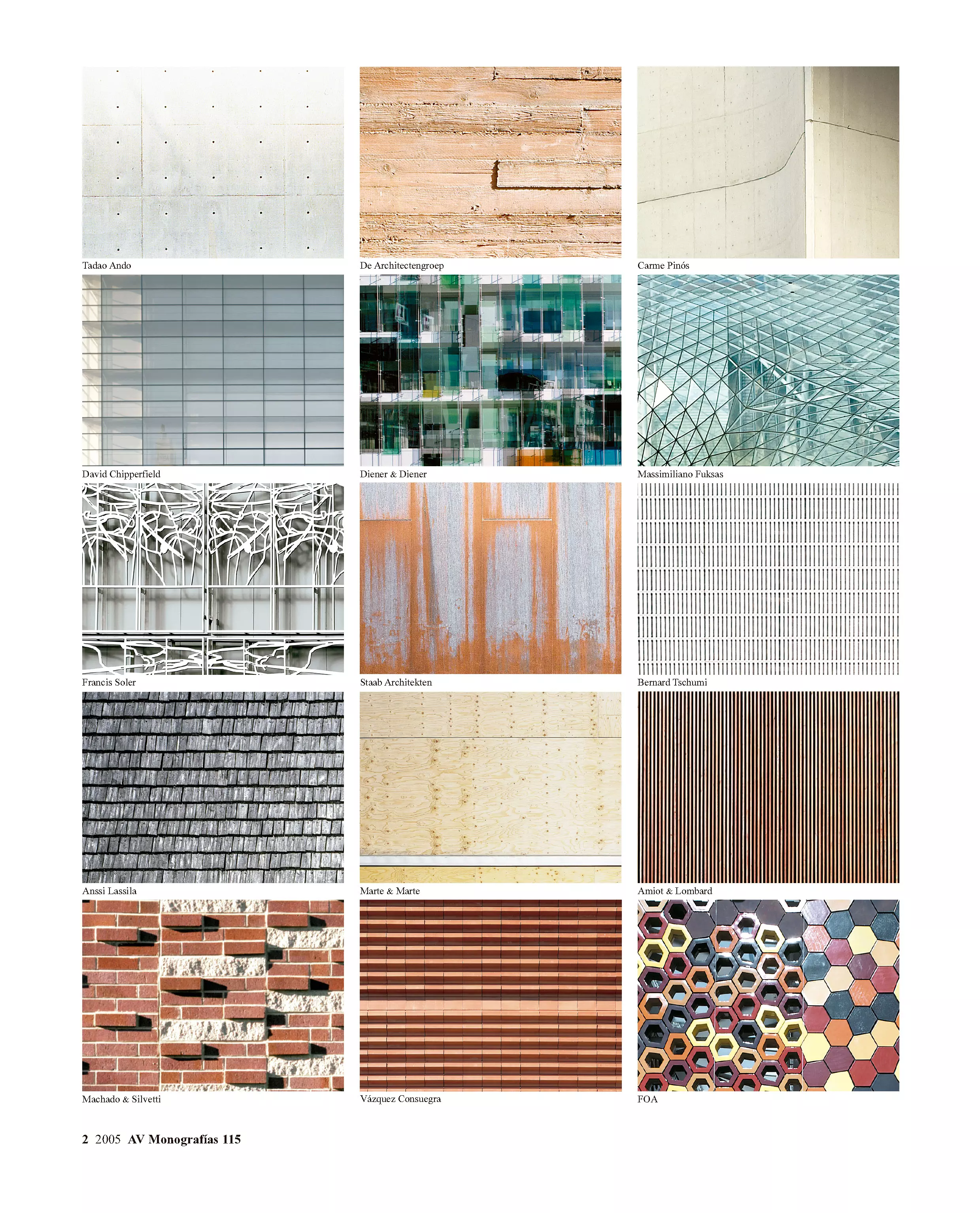 Secuestrados por la fascinación hedonista del arte epitelial, nuestros contemporáneos abordan la exploración de los materiales de la arquitectura con el espíritu experimental de la investigación estética, la impaciencia urgente de la sensación y la búsqueda obstinada de la novedad. Aquí esa búsqueda ha querido orquestarse en cinco movimientos que corresponden a otras tantas familias materiales —el hormigón, el vidrio, el metal, la madera y la cerámica—, cuyas denominaciones compactas y comunes no dejan adivinar la variedad infinita de sus géneros y especies, y cuyos ecos de naturaleza y convención equívocamente ocultan la extrema sofisticación artificiosa de los procesos de elaboración de los productos, que apenas recuerdan ya sus orígenes artesanos o vernáculos. Los cinco materiales se ilustran en cubierta, y el collage de la fachada se perfora para evocar la transparencia vítrea y rendir un homenaje centenario a un maestro de la simulación y de la máscara.