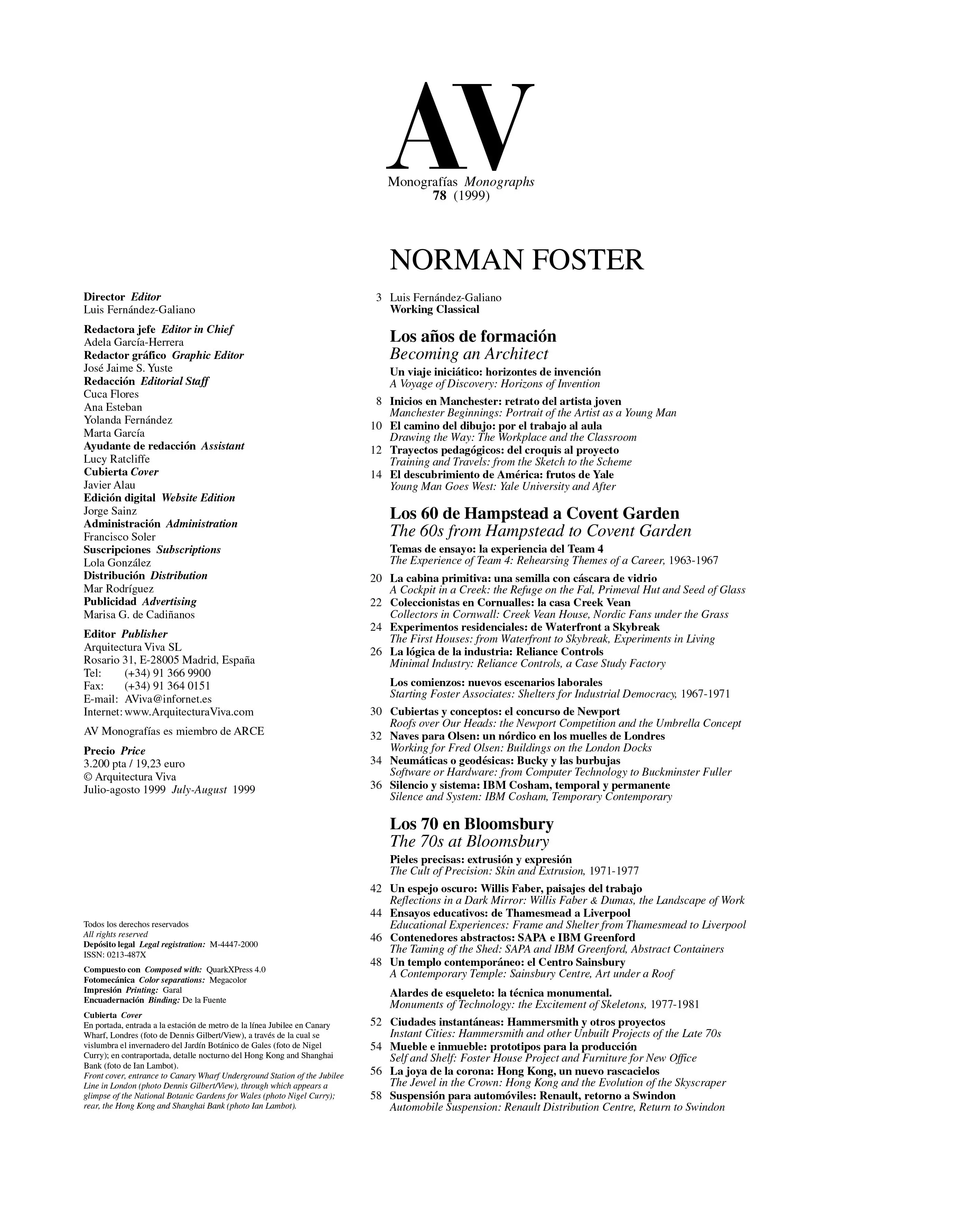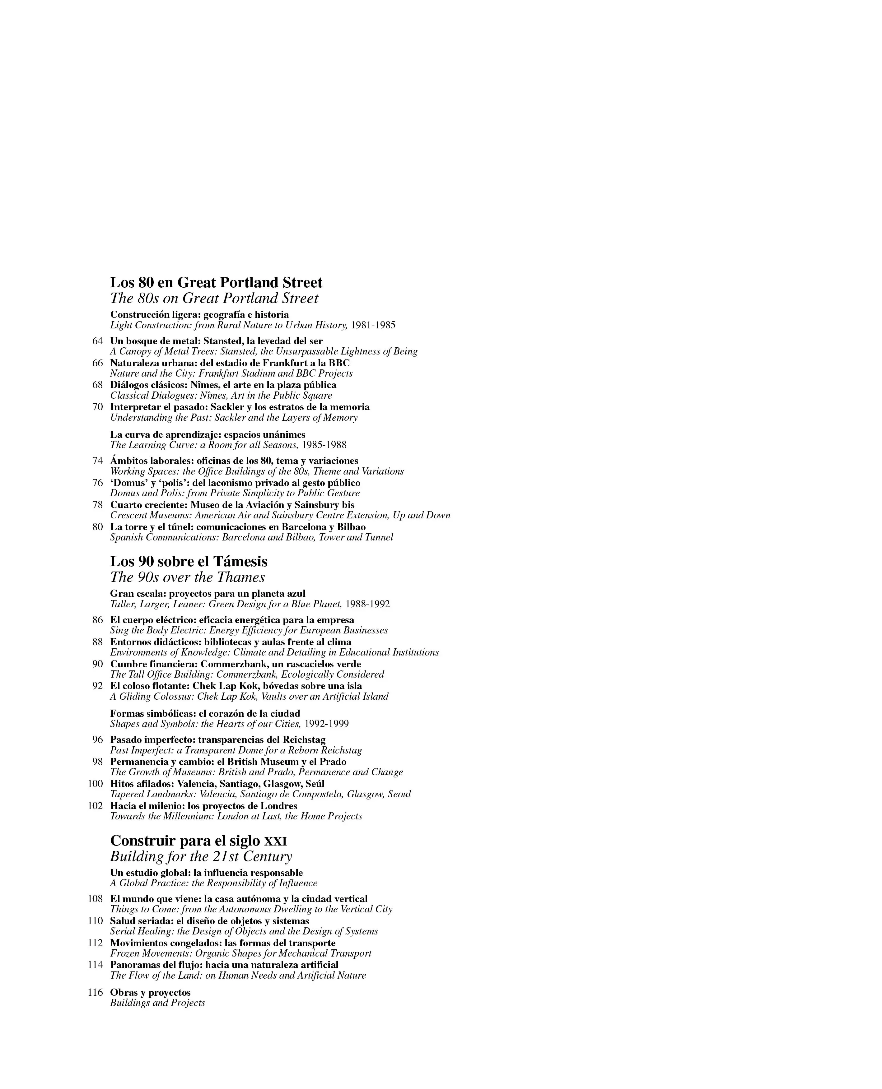 Para conformar este relato modulado ha sido esencial la disponibilidad generosa de Norman Foster, la hospitalidad cordial de Elena Ochoa y la ayuda eficaz de innumerables miembros del estudio organizando visitas, explicando proyectos o preparando material gráfico y literario. Lo prolijo del esfuerzo seguramente no se advierte en lo magro del resultado, que a fuer de sintético ha debido omitir obras relevantes, describir otras con brevedad telegráfica y dedicar a muchas apenas algo más que una mención o un adjetivo. Esta voluntad de concisión me llevó a redactar el texto original en inglés, a fin de evitar los prolijos barroquismos del castellano, al cual traduje de viva voz la versión que aquí se imprime; el proceso ha hecho quizá los textos más informativos y precisos, pero seguramente a costa de su calidad literaria. Finalmente, he procurado que la amistad y la gratitud no interfieran en la naturaleza crítica de los textos: es algo que debo a un arquitecto que, en este momento cenital de su carrera, está abocado a elegir entre su compromiso con una oficina colosal y su compromiso con una trayectoria; entre su fidelidad a 500 empleados y su fidelidad a la obra; entre su responsabilidad empresarial y su responsabilidad histórica.