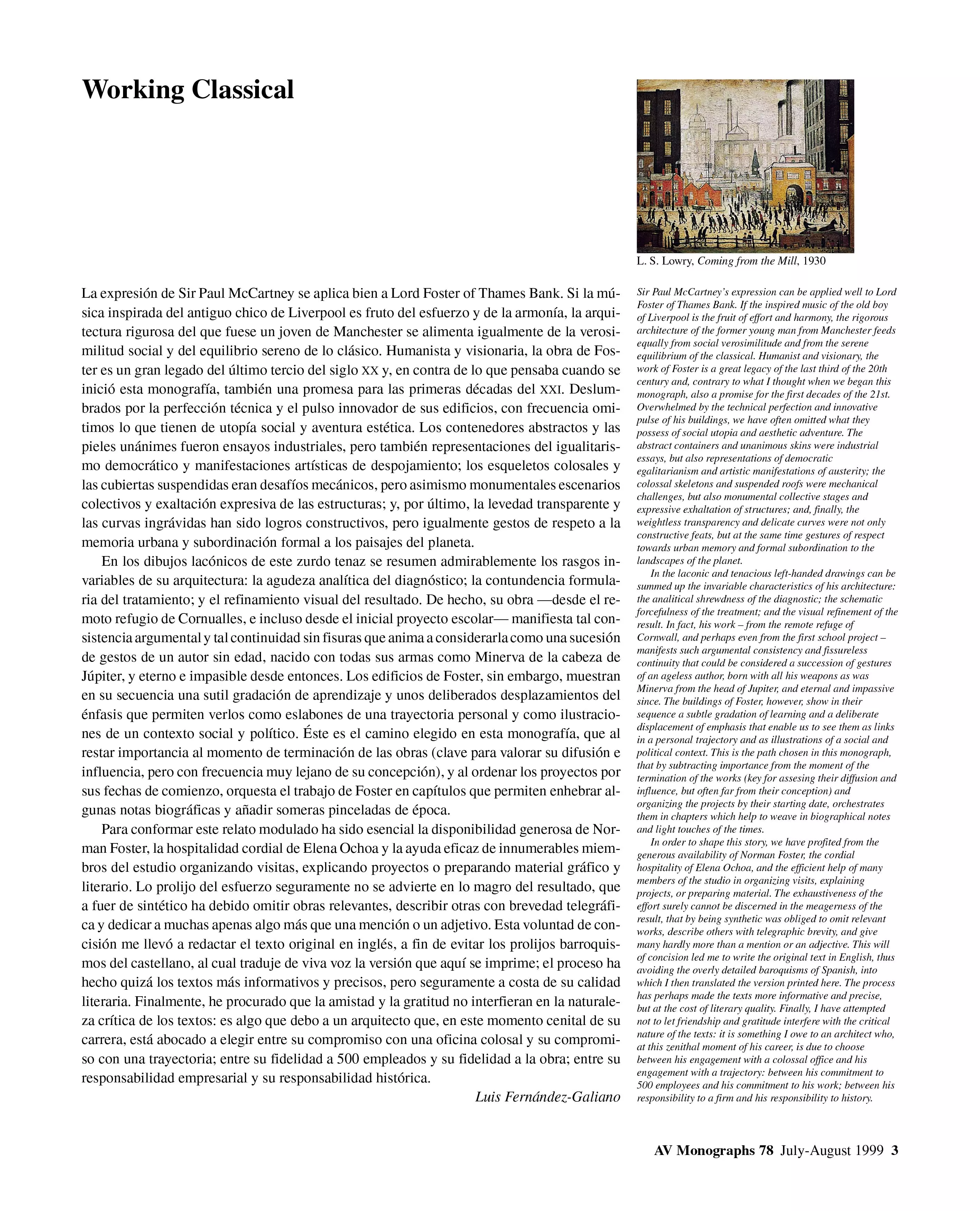 La expresión de Sir Paul McCartney se aplica bien a Lord Foster of Thames Bank. Si la música inspirada del antiguo chico de Liverpool es fruto del esfuerzo y de la armonía, la arquitectura rigurosa del que fuese un joven de Manchester se alimenta igualmente de la verosimilitud social y del equilibrio sereno de lo clásico. Humanista y visionaria, la obra de Foster es un gran legado del último tercio del siglo XX y, en contra de lo que pensaba cuando se inició esta monografía, también una promesa para las primeras décadas del XXI. Deslumbrados por la perfección técnica y el pulso innovador de sus edificios, con frecuencia omitimos lo que tienen de utopía social y aventura estética. Los contenedores abstractos y las pieles unánimes fueron ensayos industriales, pero también representaciones del igualitarismo democrático y manifestaciones artísticas de despojamiento; los esqueletos colosales y las cubiertas suspendidas eran desafíos mecánicos, pero asimismo monumentales escenarios colectivos y exaltación expresiva de las estructuras; y, por último, la levedad transparente y las curvas ingrávidas han sido logros constructivos, pero igualmente gestos de respeto a la memoria urbana y subordinación formal a los paisajes del planeta.