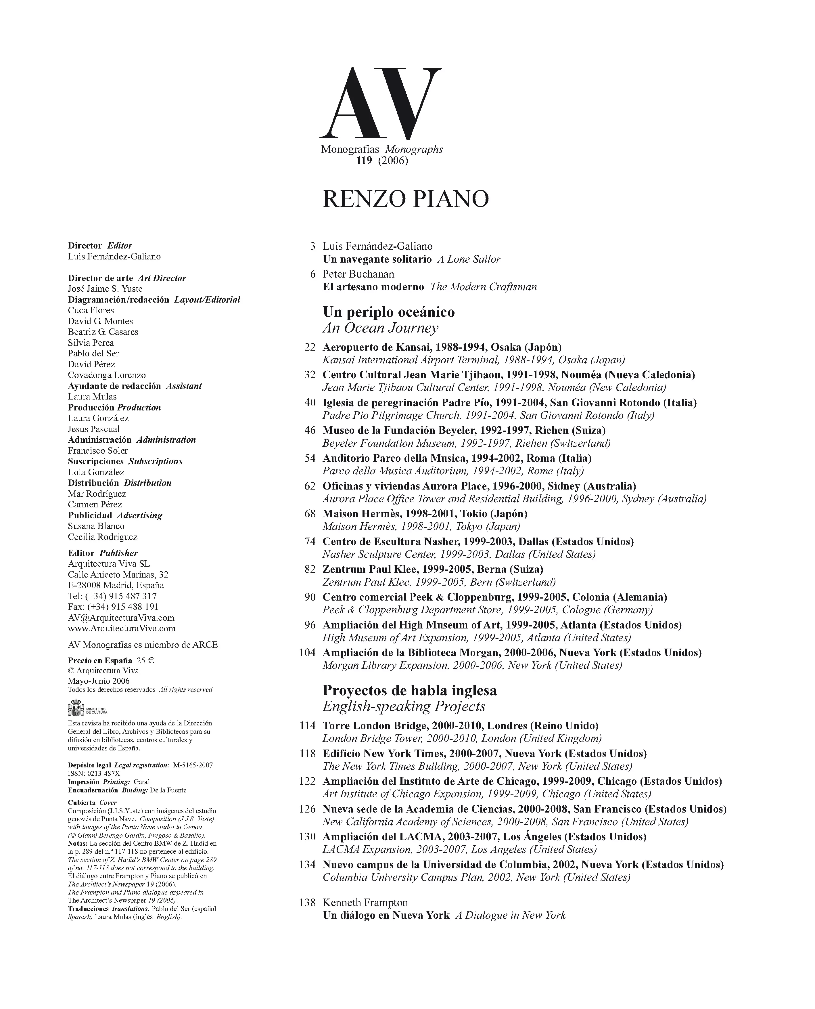 Esta revista publicó en 1990 su primera monografía sobre un autor contemporáneo —antes sólo habían aparecido números dedicados a Mies y Le Corbusier coincidiendo con los centenarios de ambos— y fue precisamente Piano el elegido, documentando su trayectoria desde la fundación del Building Workshop en 1981: un recorrido que, tras los ecos inaugurales de su asociación con Richard Rogers y el fenomenal impacto del museo parisino, se inicia con su relación con Dominique de Menil y ese fruto extraordinario que es la obra de Houston, y se extiende hasta la culminación del estadio de Bari, el más hermoso de los construidos para el Mundial de Fútbol disputado en Italia el año de la monografía; publicación que se cerraba con el proyecto para el colosal aeropuerto de Kansai, sobre una isla artificial en la bahía de Osaka, que Piano había ganado en concurso unos meses antes.