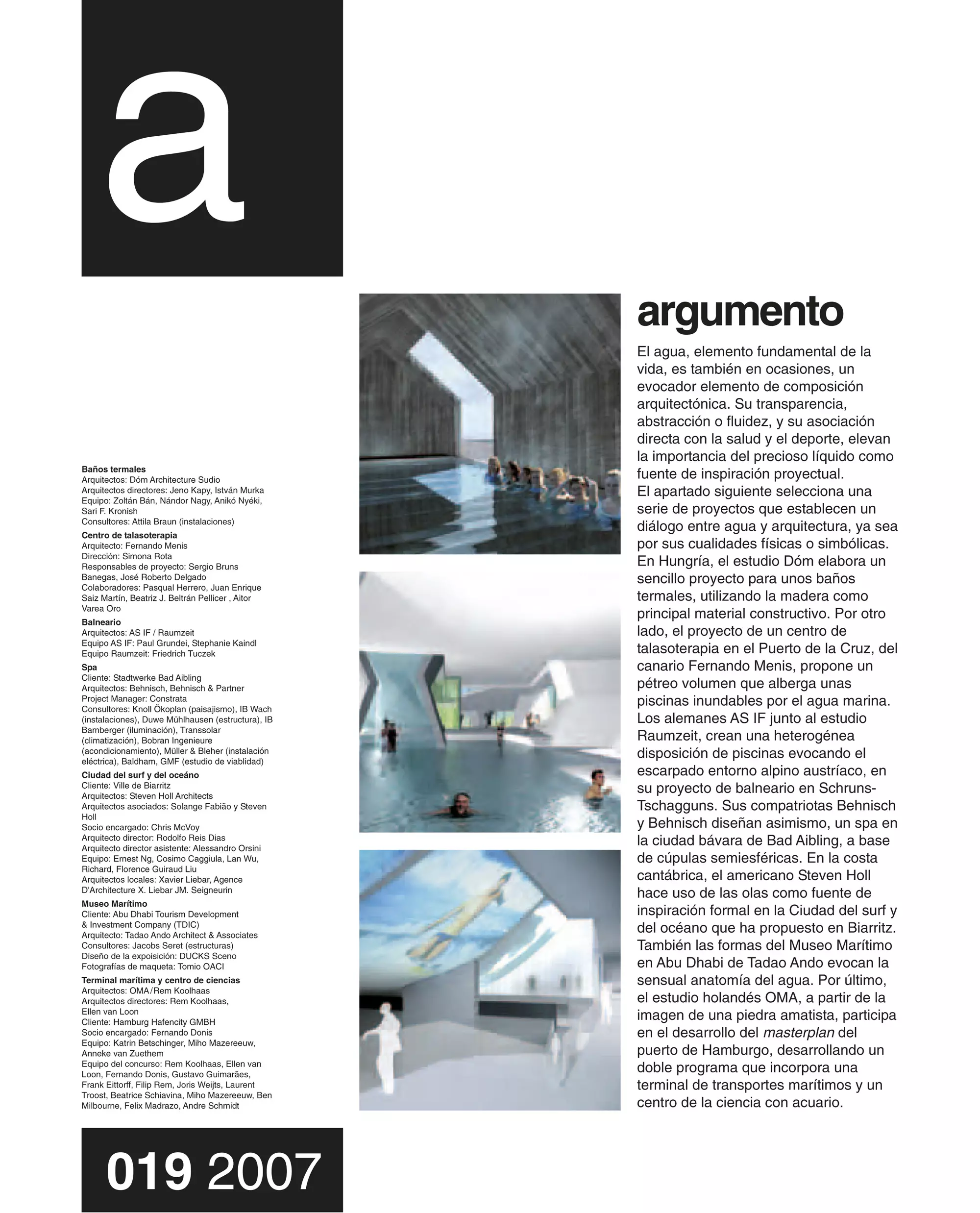 Proyecto: Baños termales, Algyö / Centro de talasoterapia, Puerto de la Cruz / Balneario, Schruns-Tshagguns / Spa, Bad Aibling / Ciudad del surf y el océano, Biarritz / Museo Martítimo, Abu Dhabi / Terminal y centro de ciencias, Hamburgo