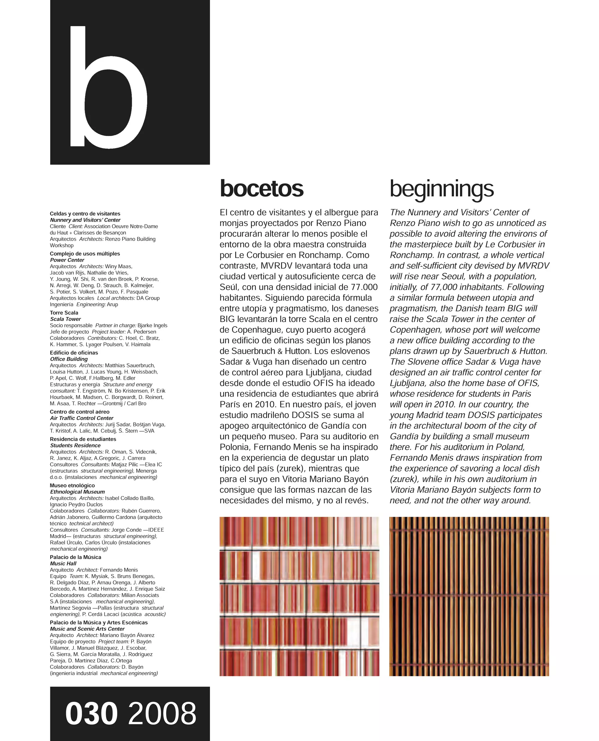 Proyecto: Celdas y centro de visitantes, Ronchamp / Complejo de usos múltiples, Gwang Gyo / Torre Scala, Copenhague / Edificio de oficinas, Copenhague / Centro de control aéreo, Ljubljana / Residencia de estudiantes, París / Museo etnológico, Gandía / Palacio de Música, Torun / Palacio de la Música y Artes Escénicas, Vitoria