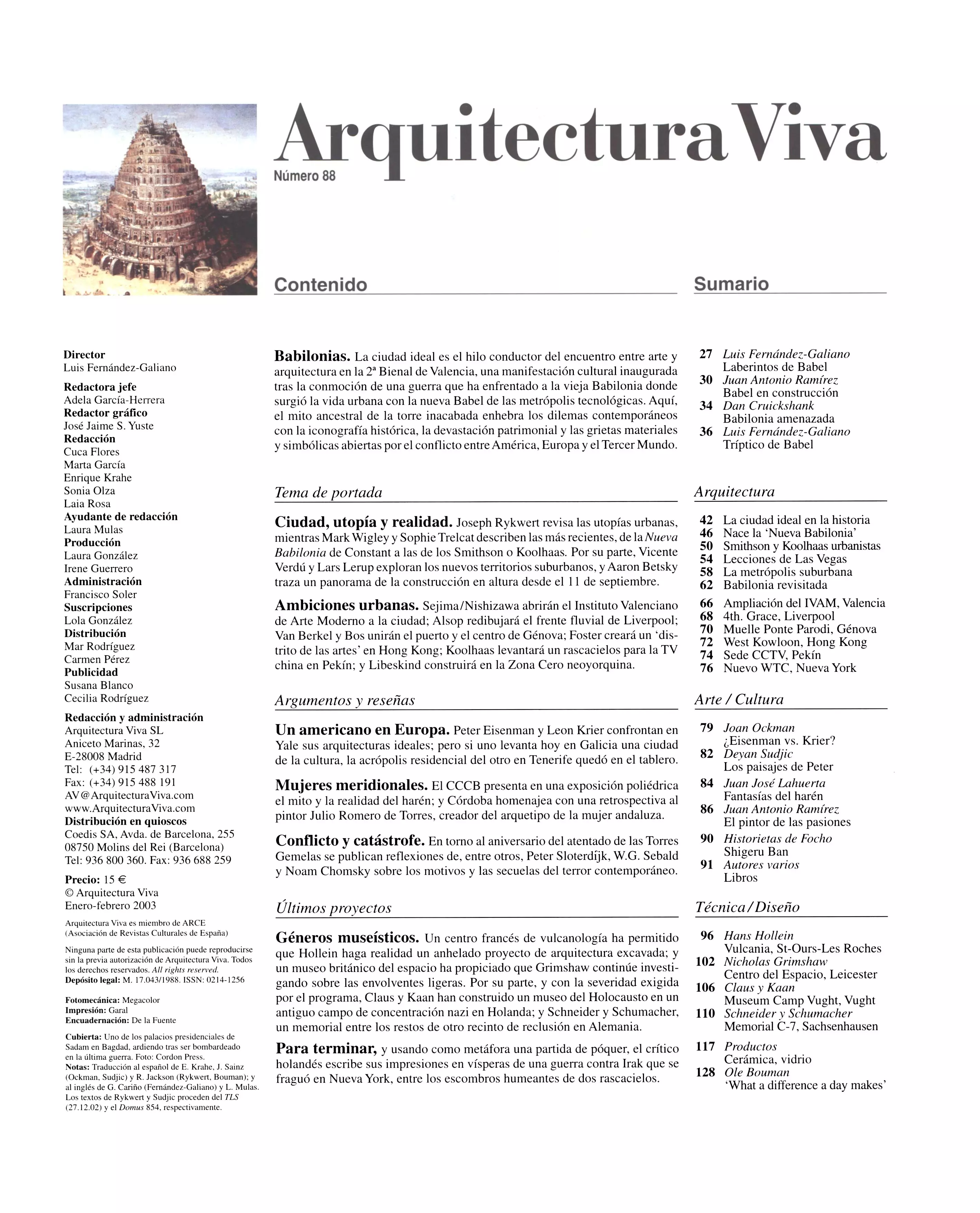 Ciudad, utopía y realidad. Joseph Rykwert revisa las utopías urbanas, mientras Mark Wigley y Sophie Trelcat describen las más recientes, de la NuevaBabilonia de Constant a las de los Smithson o Koolhaas. Por su parte, Vicente Verdú y Lars Lerup exploran los nuevos territorios suburbanos, y Aaron Betsky traza un panorama de la construcción en altura desde el 11 de septiembre.
