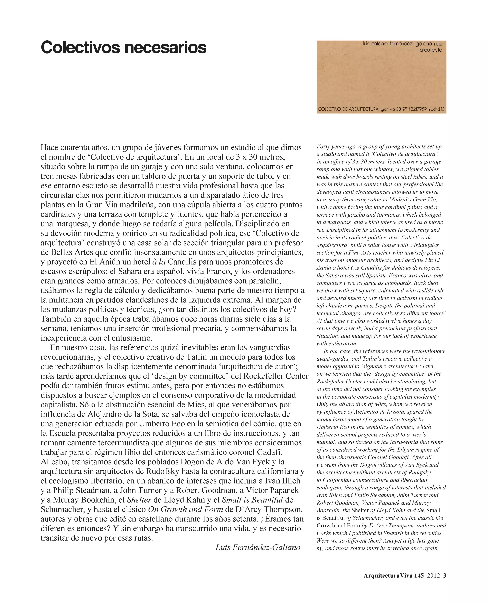 Hace cuarenta años, un grupo de jóvenes formamos un estudio al que dimos el nombre de ‘Colectivo de arquitectura’. En un local de 3 x 30 metros, situado sobre la rampa de un garaje y con una sola ventana, colocamos en tren mesas fabricadas con un tab