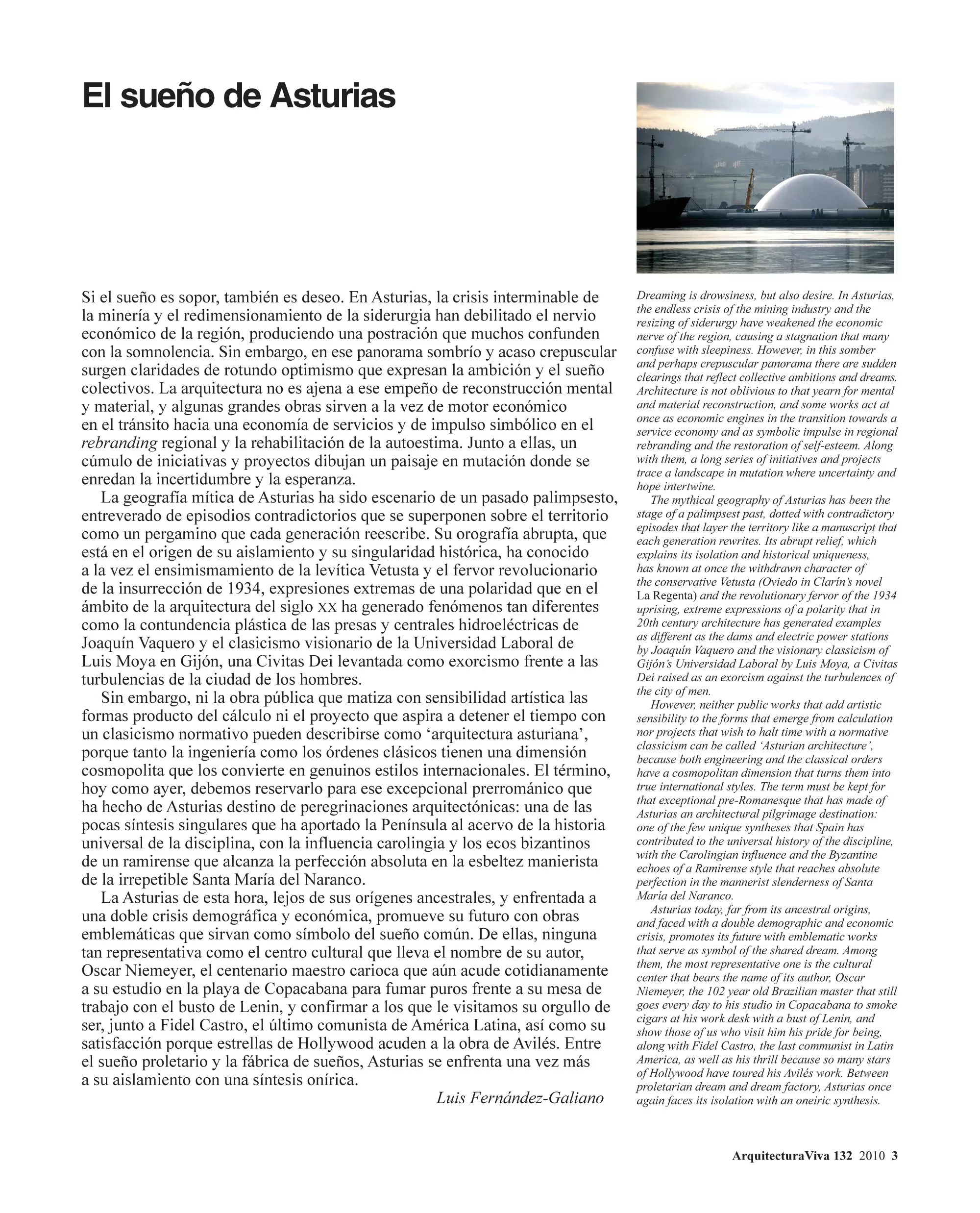 Si el sueño es sopor, también es deseo. En Asturias, la crisis interminable de la minería y el redimensionamiento de la siderurgia han debilitado el nervio económico de la región, produciendo una postración que muchos confunden con la somnolencia. Sin embargo, en ese panorama sombrío y acaso crepuscular surgen claridades de rotundo optimismo que expresan la ambición y el sueño colectivos. La arquitectura no es ajena a ese empeño de reconstrucción mental y material, y algunas grandes obras sirven a la vez de motor económico en el tránsito hacia una economía de servicios y de impulso simbólico en el rebranding regional y la rehabilitación de la autoestima. Junto a ellas, un cúmulo de iniciativas y proyectos dibujan un paisaje en mutación donde se enredan la incertidumbre y la esperanza.