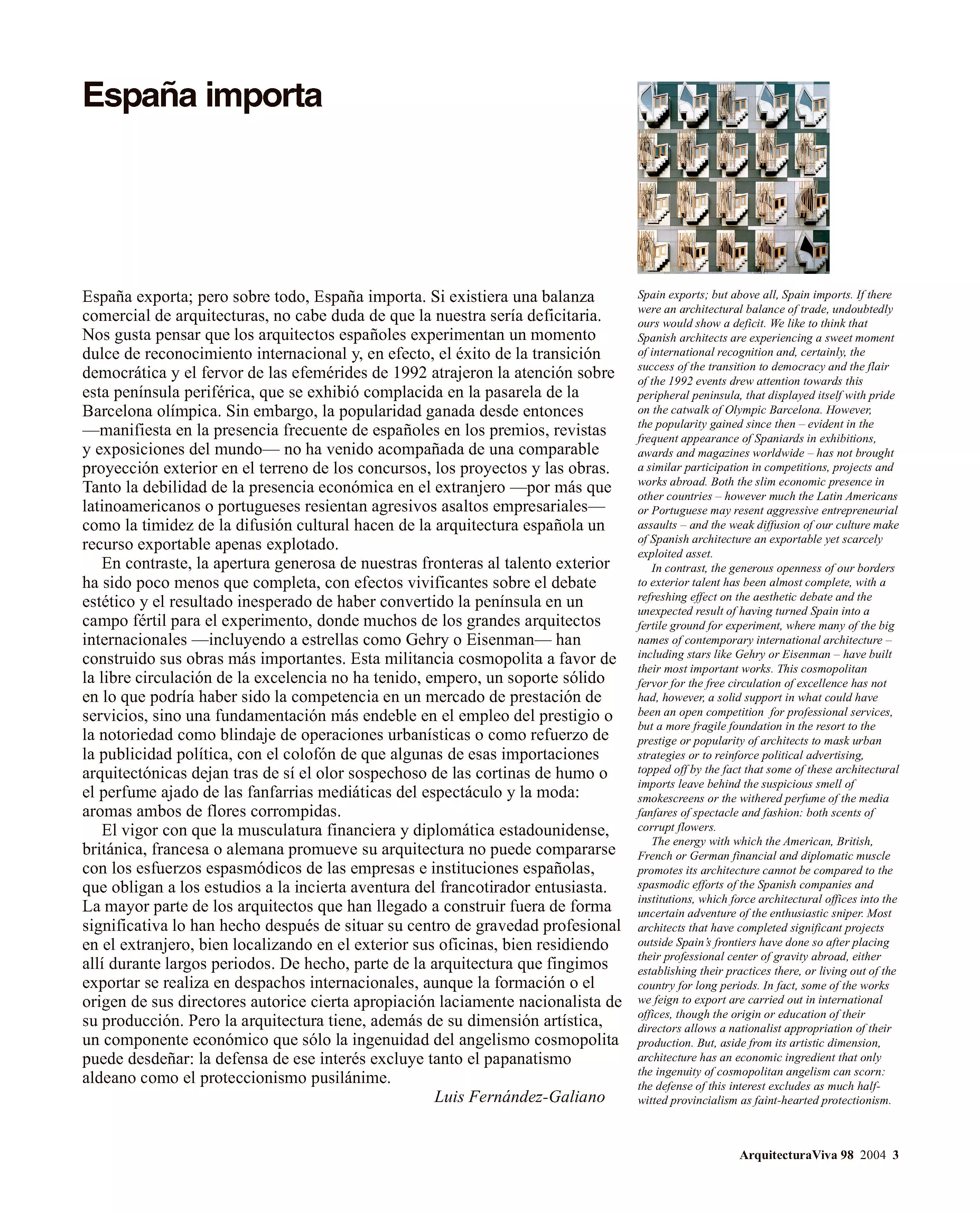 España exporta; pero sobre todo, España importa. Si existiera una balanza comercial de arquitecturas, no cabe duda de que la nuestra sería deficitaria. Nos gusta pensar que los arquitectos españoles experimentan un momento dulce de reconocimiento internacional y, en efecto, el éxito de la transición democrática y el fervor de las efemérides de 1992 atrajeron la atención sobre esta península periférica, que se exhibió complacida en la pasarela de la Barcelona olímpica. Sin embargo, la popularidad ganada desde entonces —manifiesta en la presencia frecuente de españoles en los premios, revistas y exposiciones del mundo— no ha venido acompañada de una comparable proyección exterior en el terreno de los concursos, los proyectos y las obras. Tanto la debilidad de la presencia económica en el extranjero —por más que latinoamericanos o portugueses resientan agresivos asaltos empresariales— como la timidez de la difusión cultural hacen de la arquitectura española un recurso exportable apenas explotado.