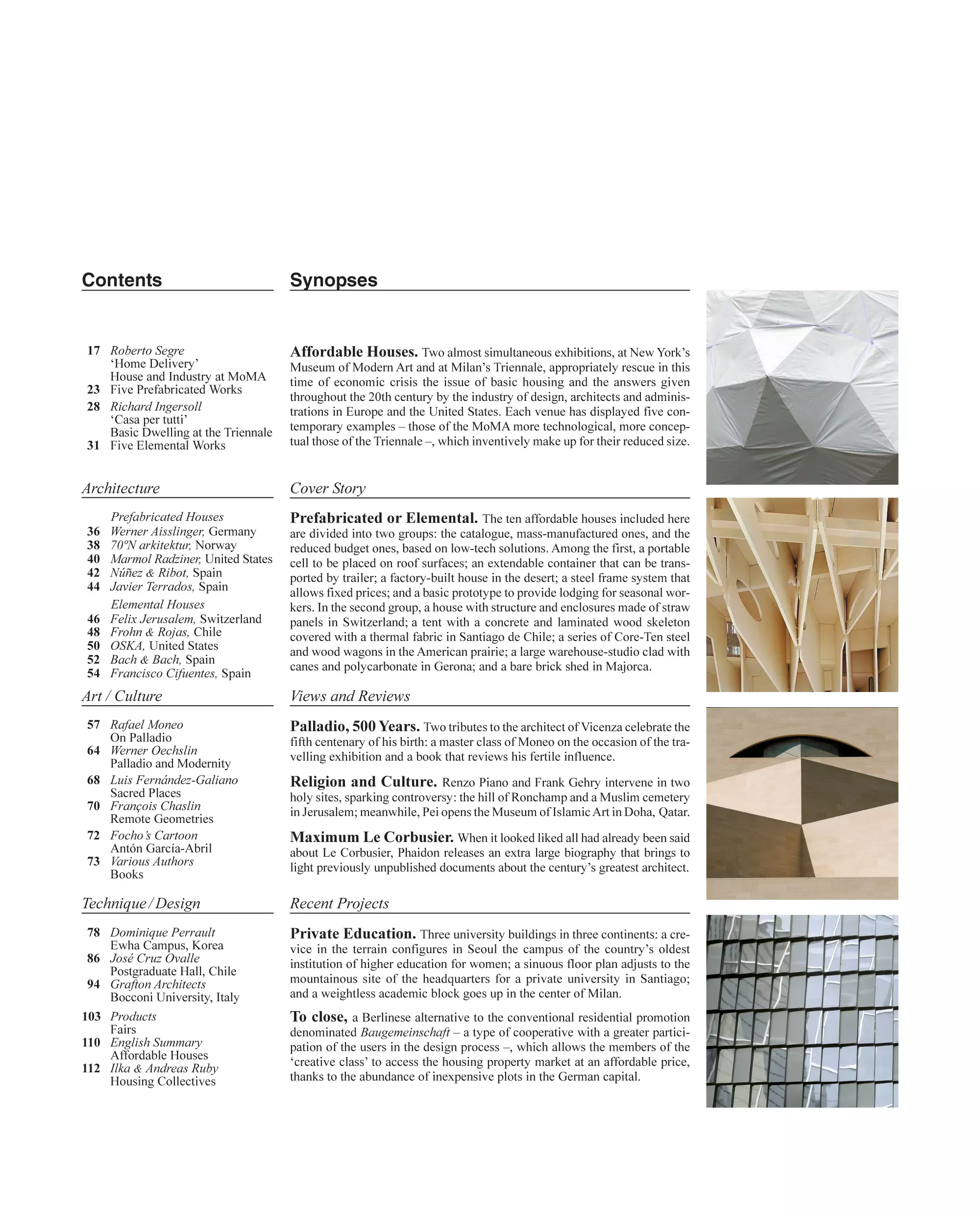 Prefabricadas o elementales. Diez casas asequibles, divididas en dos grupos: las de catálogo, fabricadas en serie, y las de bajo presupuesto, a base de soluciones low-tech. Entre las primeras, una célula portátil para ocupar cubiertas urbanas; un contenedor extensible y transportable en tráiler; una casa en el desierto construida en fábrica; un sistema steel frame que permite precios cerrados; y un prototipo básico para alojar trabajadores temporeros. En el segundo grupo, una casa con estructura y cerramientos de paneles de paja en Suiza; una tienda con esqueleto de hormigón y madera laminada recubierto de un tejido térmico en Santiago de Chile; unos carromatos de acero cortén y madera en la pradera americana; una amplia nave-estudio revestida de cañas y policarbonato en Gerona; y un desnudo galpón cerámico en Mallorca.