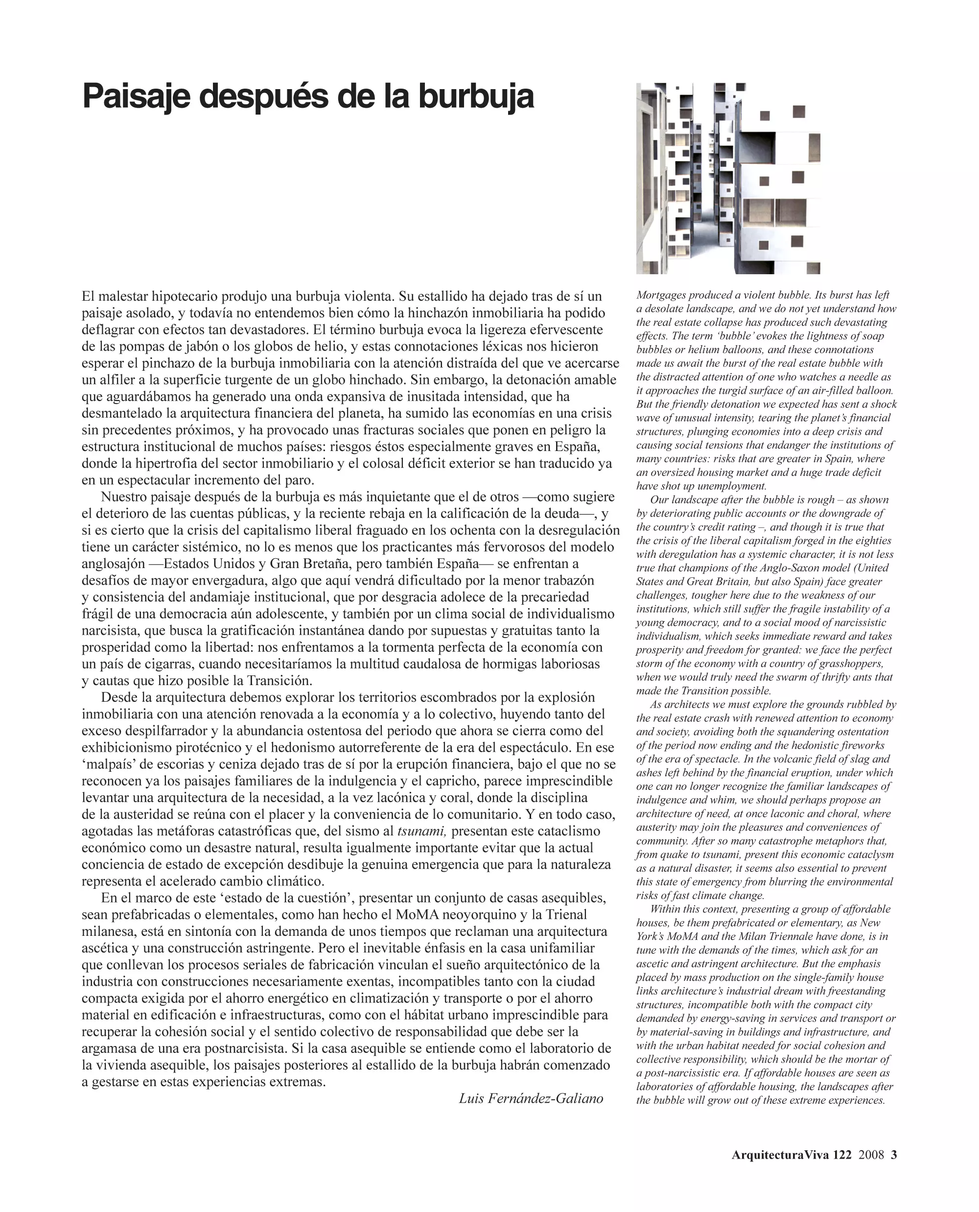 Desde la arquitectura debemos explorar los territorios escombrados por la explosión inmobiliaria con una atención renovada a la economía y a lo colectivo, huyendo tanto del exceso despilfarrador y la abundancia ostentosa del periodo que ahora se cierra como del exhibicionismo pirotécnico y el hedonismo autorreferente de la era del espectáculo. En ese ‘malpaís’ de escorias y ceniza dejado tras de sí por la erupción financiera, bajo el que no se reconocen ya los paisajes familiares de la indulgencia y el capricho, parece imprescindible levantar una arquitectura de la necesidad, a la vez lacónica y coral, donde la disciplina de la austeridad se reúna con el placer y la conveniencia de lo comunitario. Y en todo caso, agotadas las metáforas catastróficas que, del sismo al tsunami, presentan este cataclismo económico como un desastre natural, resulta igualmente importante evitar que la actual conciencia de estado de excepción desdibuje la genuina emergencia que para la naturaleza representa el acelerado cambio climático.