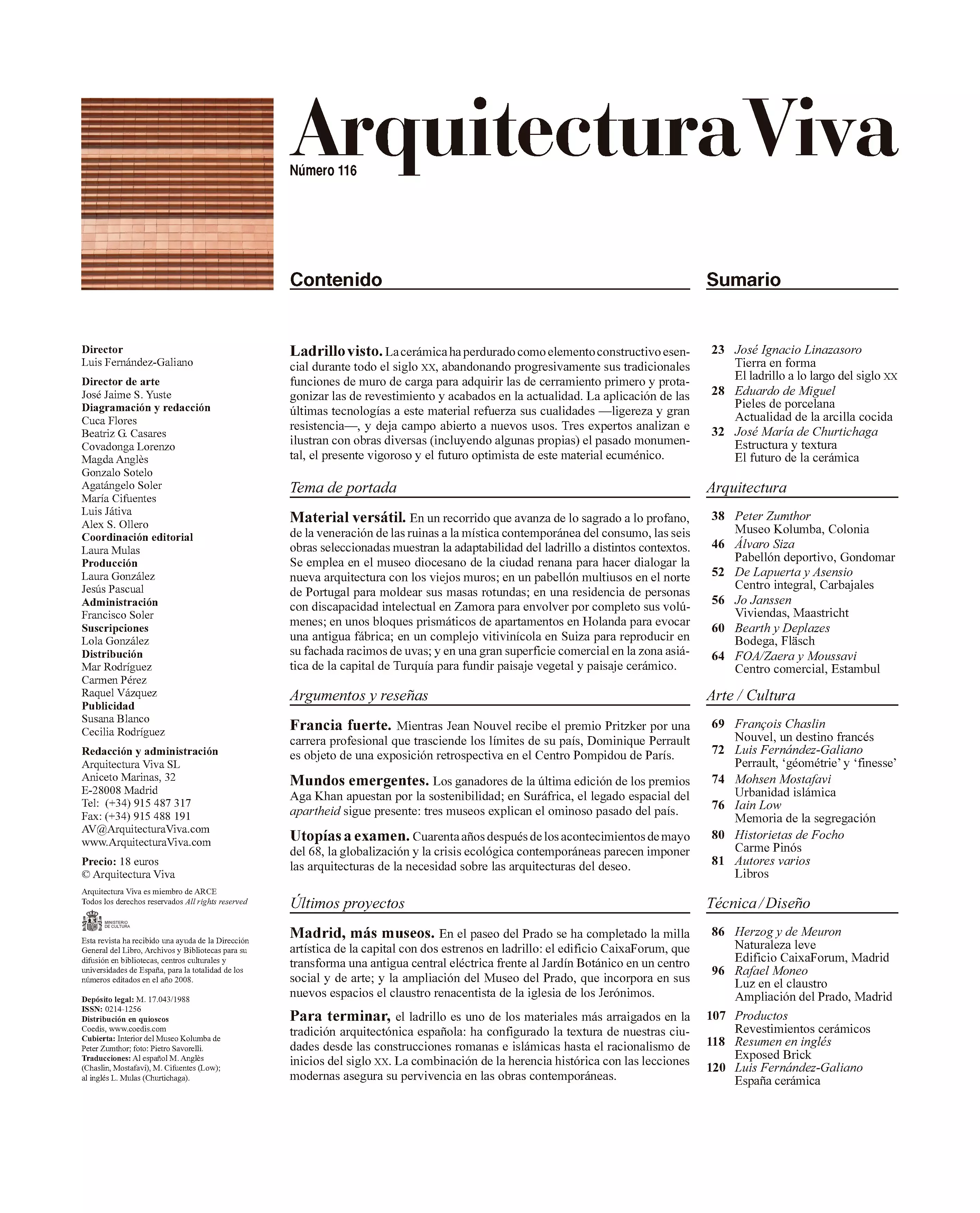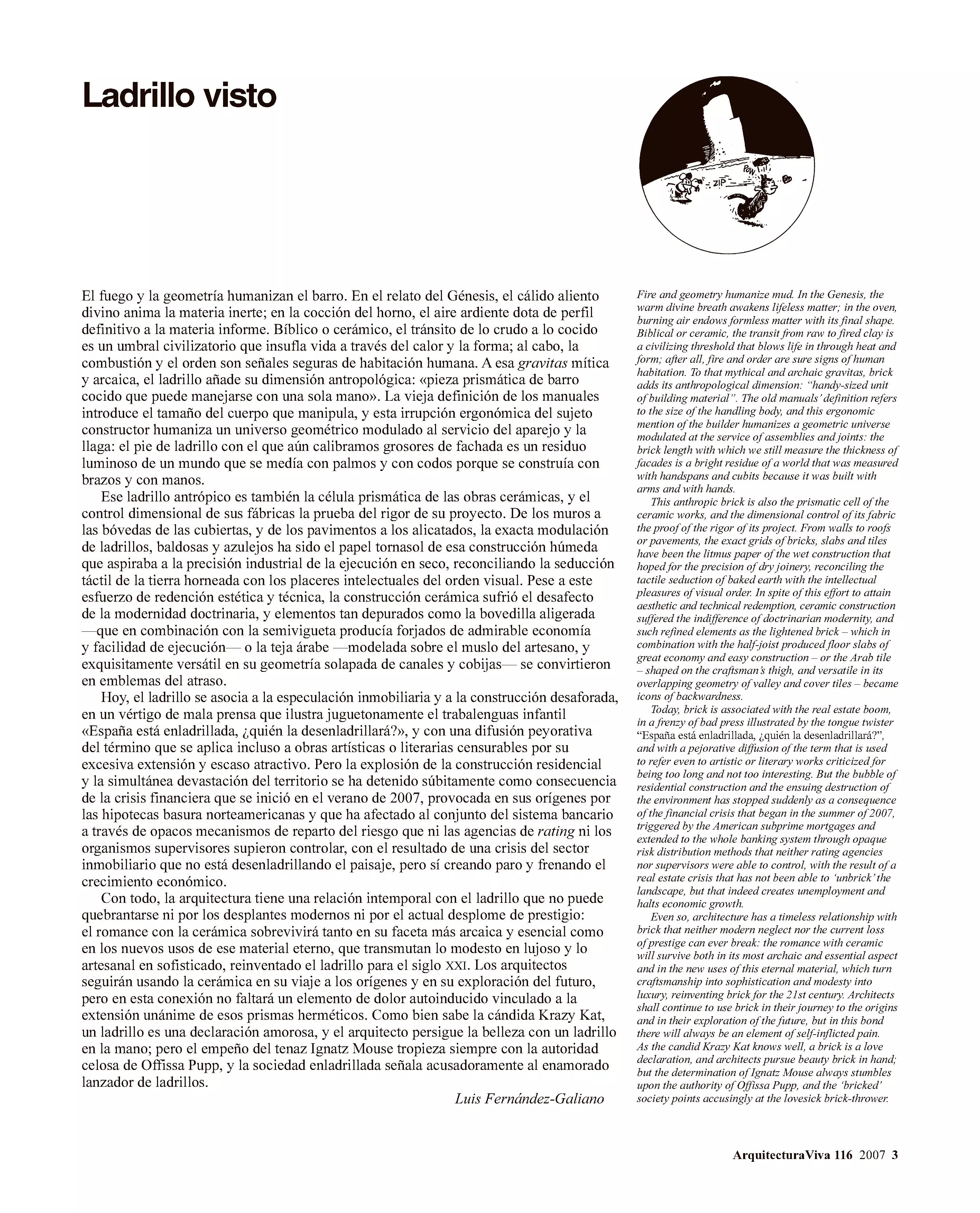 Ladrillo visto. La cerámica ha perdurado como elemento constructivo esencial durante todo el siglo xx, abandonando progresivamente sus tradicionales funciones de muro de carga para adquirir las de cerramiento primero y protagonizar las de revestimiento y acabados en la actualidad. La aplicación de las últimas tecnologías a este material refuerza sus cualidades —ligereza y gran resistencia—, y deja campo abierto a nuevos usos. Tres expertos analizan e ilustran con obras diversas (incluyendo algunas propias) el pasado monumental, el presente vigoroso y el futuro optimista de este material ecuménico.