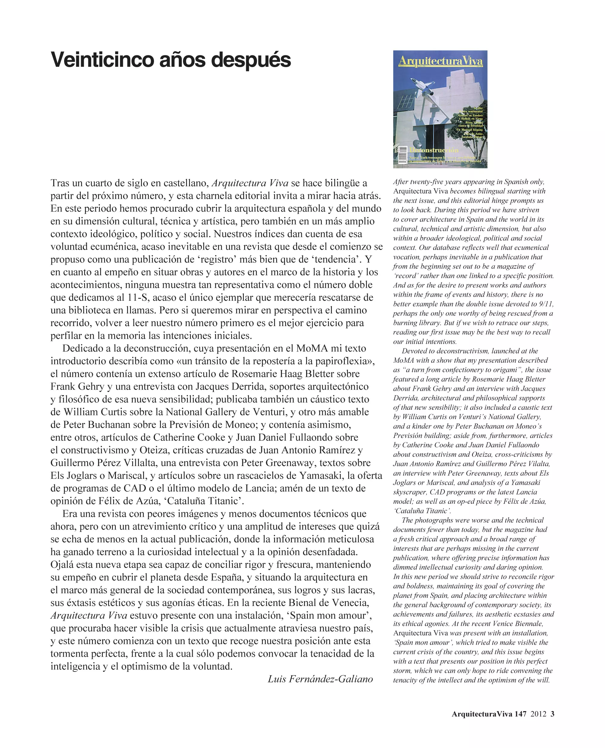 Tras un cuarto de siglo en castellano, Arquitectura Viva se hace bilingüe a partir del próximo número, y esta charnela editorial invita a mirar hacia atrás. En este periodo hemos procurado cubrir la arquitectura española y del mundo en su dimensión c