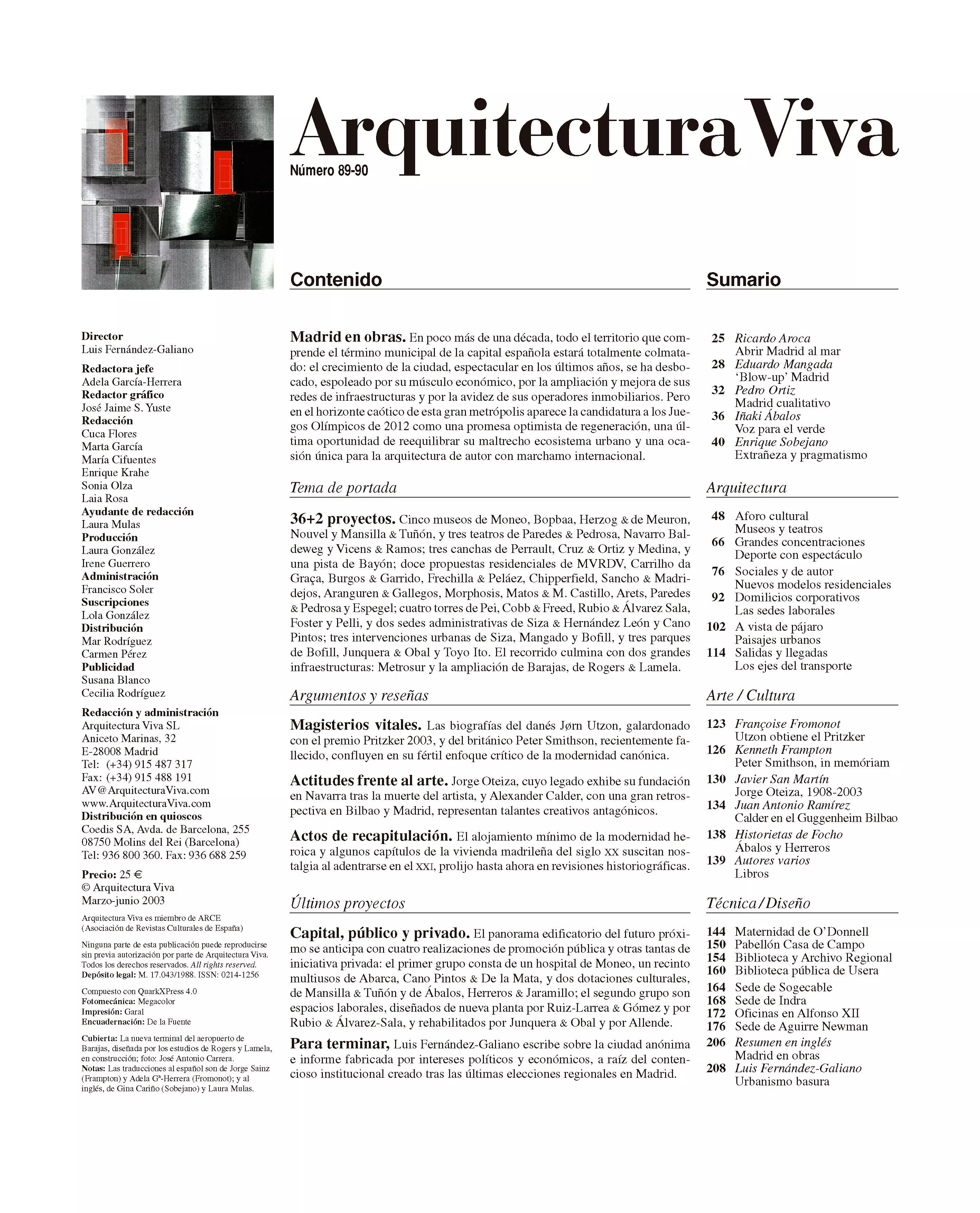 Capital, público y privado. El panorama edificatorio del futuro próximo se anticipa con cuatro realizaciones de promoción pública y otras tantas de iniciativa privada: el primer grupo consta de un hospital de Moneo, un recinto multiusos de Abarca, Cano Pintos & De la Mata, y dos dotaciones culturales, de Mansilla & Tuñón y de Ábalos, Herreros & Jaramillo; el segundo grupo son espacios laborales, diseñados de nueva planta por Ruiz-Larrea & Gómez y por Rubio & Álvarez-Sala, y rehabilitados por Junquera & Obal y por Allende.
