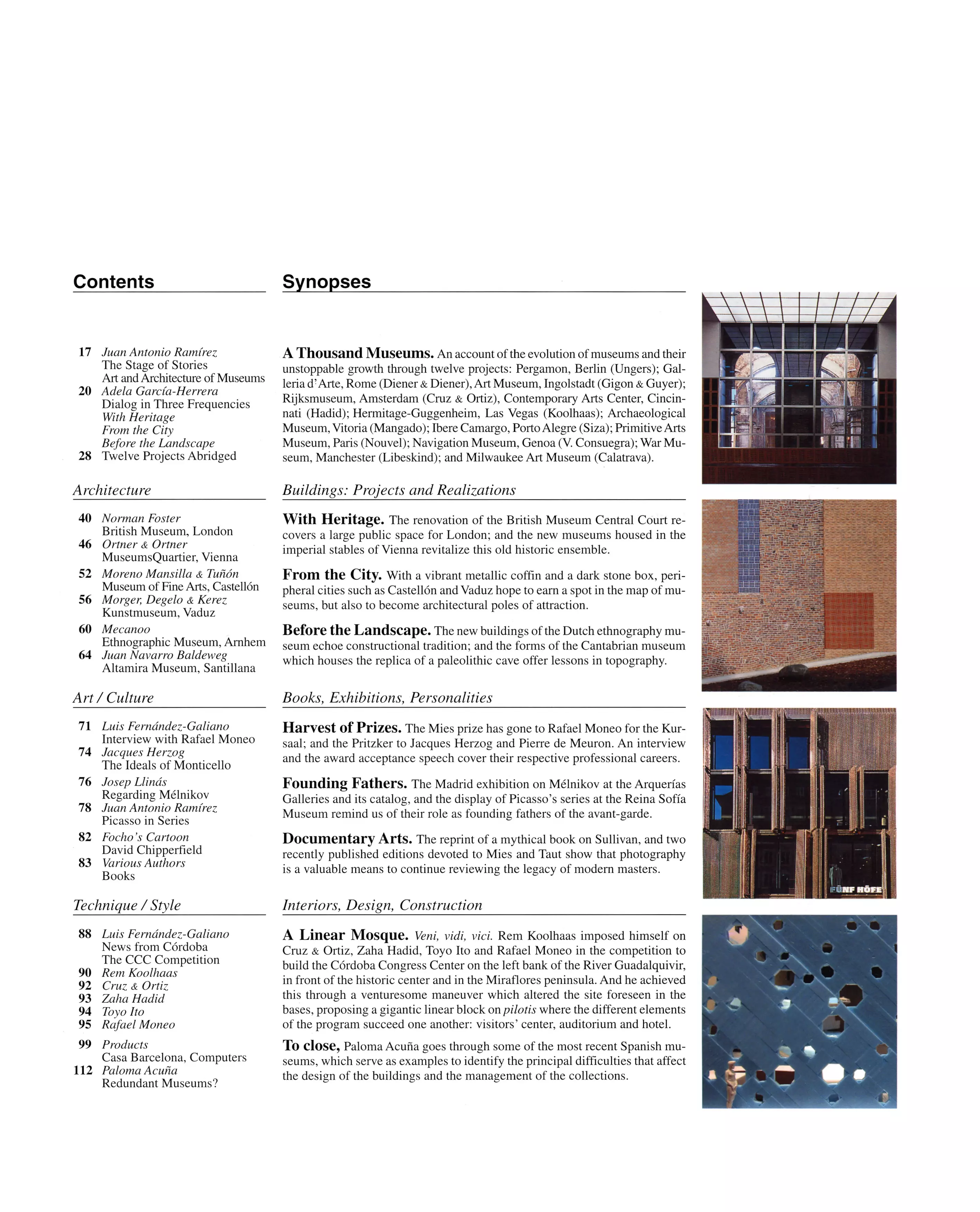 Mil museos. De la evolución del museo como institución y de su imparable multiplicación dan cuenta 12 proyectos: el Pergamon de Berlín (Ungers); la Galleria d’Arte de Roma (Diener y Diener); el de Arte de Ingolstadt (Gigon y Guyer); el Rijksmuseum de Amsterdam (Cruz y Ortiz); el de Arte Contemporáneo de Cincinnati (Hadid); el Hermitage-Guggenheim en Las Vegas (Koolhaas); el Arqueológico de Vitoria (Mangado); el Ibere Camargo en Porto Alegre (Siza); el de Artes Primeras en París (Nouvel); el del Mar de Génova (V. Consuegra); el de la Guerra en Manchester (Libeskind); y el de Arte de Milwaukee (Calatrava).