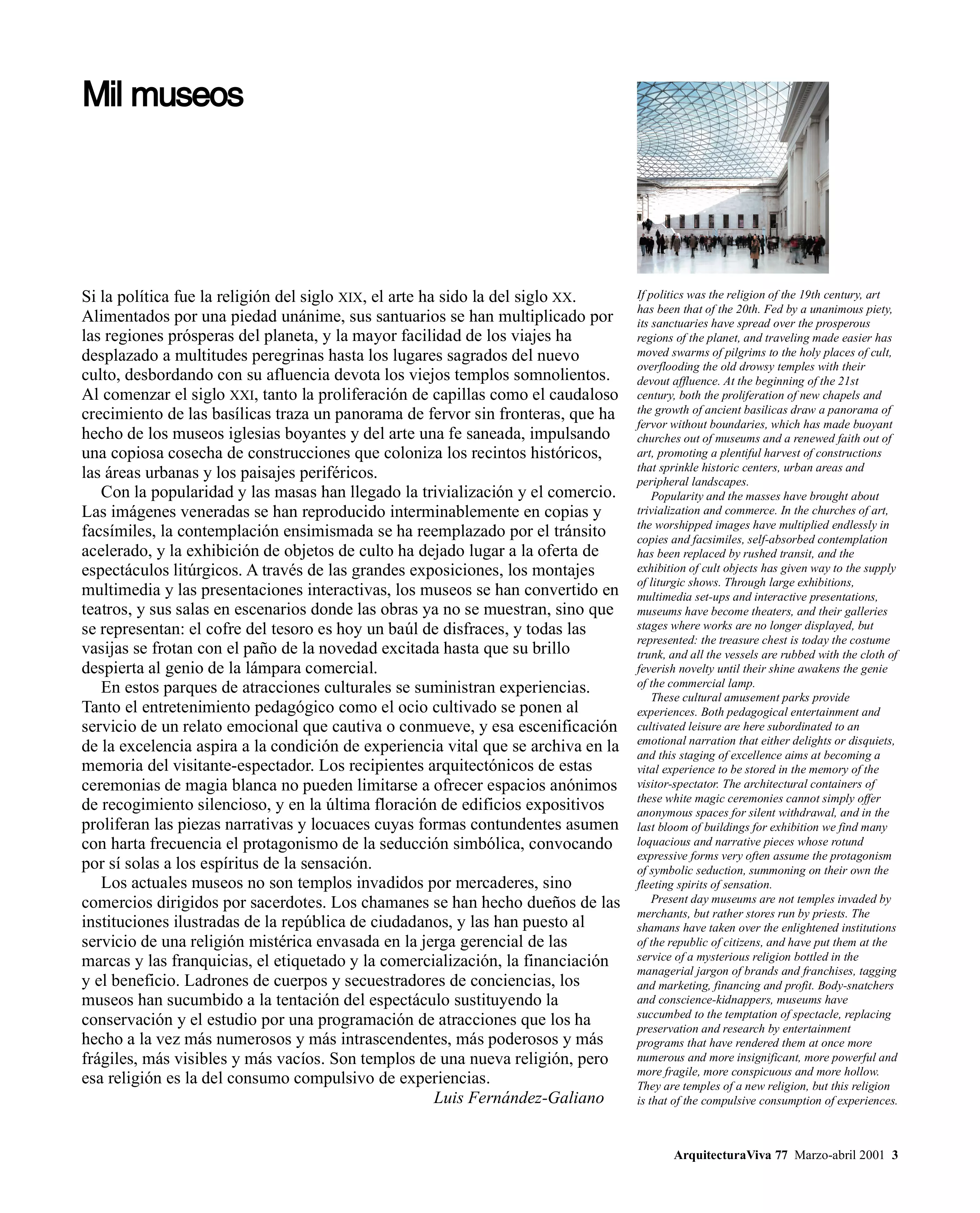 Si la política fue la religión del siglo XIX, el arte ha sido la del siglo XX. Alimentados por una piedad unánime, sus santuarios se han multiplicado por las regiones prósperas del planeta, y la mayor facilidad de los viajes ha desplazado a multitudes peregrinas hasta los lugares sagrados del nuevo culto, desbordando con su afluencia devota los viejos templos somnolientos. Al comenzar el siglo xxi, tanto la proliferación de capillas como el caudaloso crecimiento de las basílicas traza un panorama de fervor sin fronteras, que ha hecho de los museos iglesias boyantes y del arte una fe saneada, impulsando una copiosa cosecha de construcciones que coloniza los recintos históricos, las áreas urbanas y los paisajes periféricos.