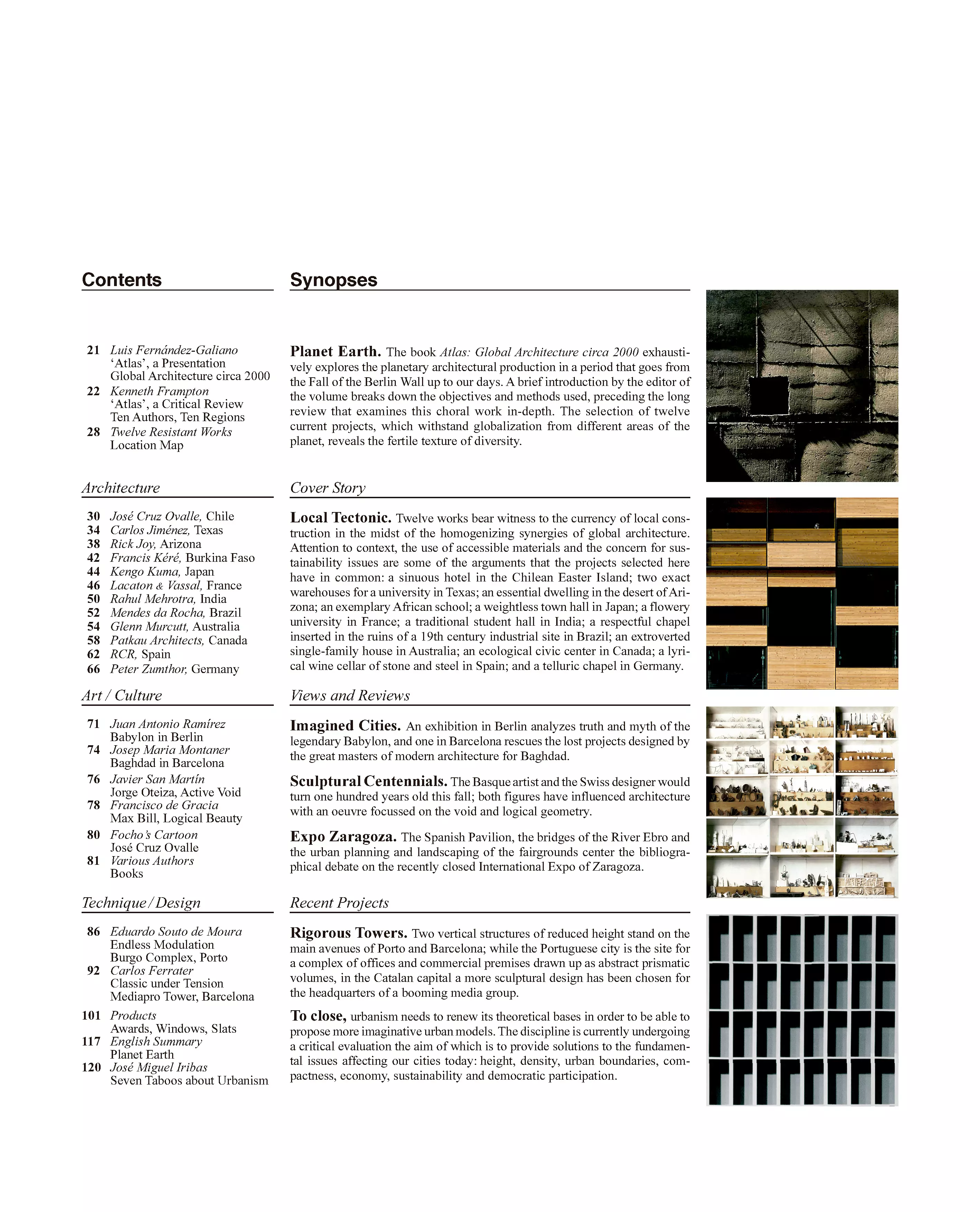 Planeta Tierra. El libro Atlas: arquitectura global circa 2000 revisa de forma exhaustiva la producción arquitectónica planetaria en un periodo que abarca desde la caída del muro de Berlín hasta nuestros días. Una breve introducción del editor del volumen desglosa los objetivos y métodos empleados, precediendo la extensa reseña que examina en profundidad esta obra coral. La selección de doce proyectos actuales, que resisten a la globalización desde distintos puntos del planeta, revela la fértil textura de la diversidad.