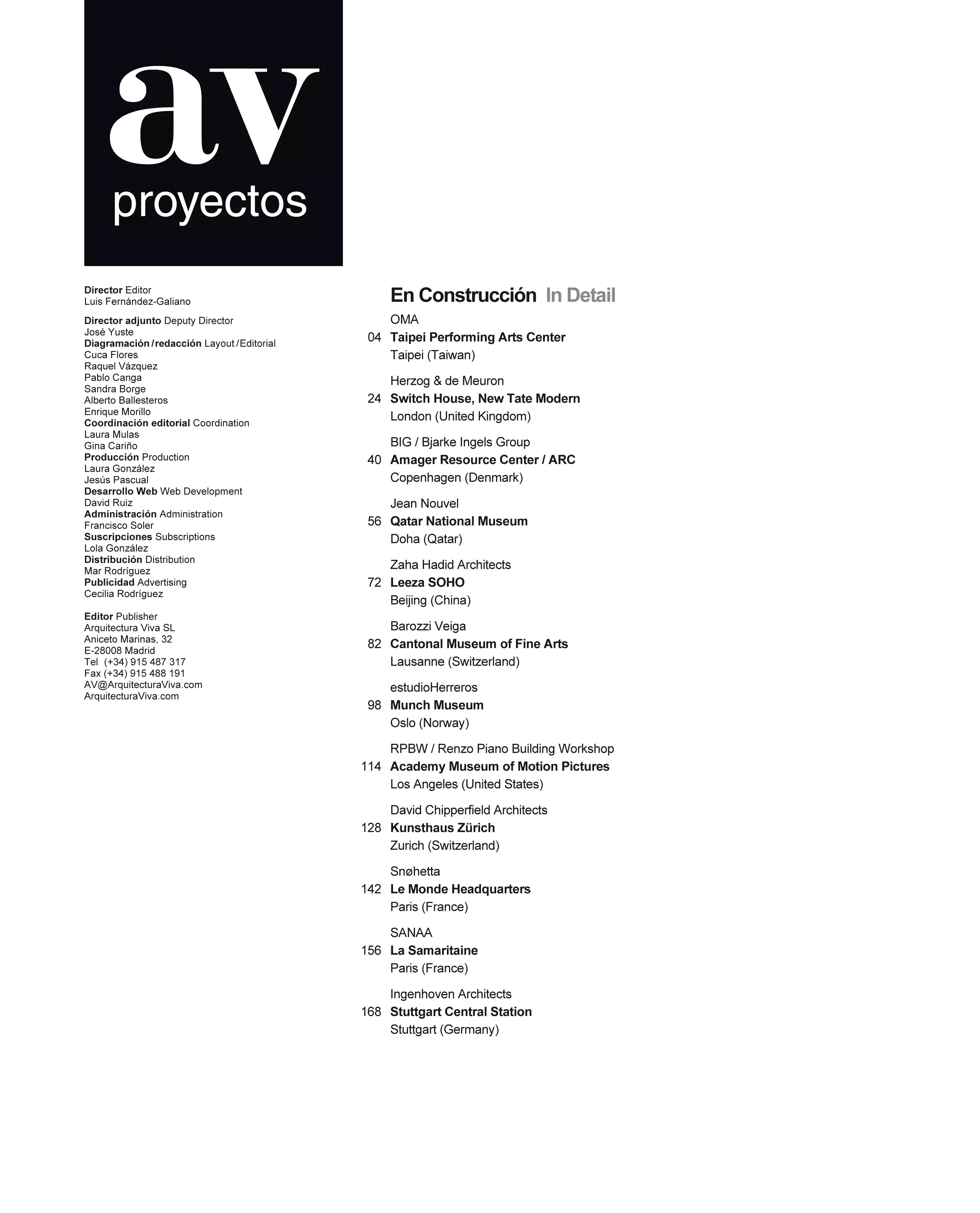 El volumen bilingüe español-inglés, y exclusivamente en versión digital, presenta una selección de doce edificios publicados en la sección ‘En construcción’ de AV Proyectos y muestra en sus 180 páginas una gran variedad de planos técnicos, detalles y fotografías del proceso constructivo de algunas de las principales obras inauguradas en los últimos años. La colección incluye, entre otros ejemplos, nuevas edificaciones museísticas como la ampliación de la Tate Modern en Londres de Herzog & de Meuron o la Kunsthaus Zürich de David Chipperfield; intervenciones patrimoniales como la rehabilitación de La Samaritaine en París de SANAA; y proyectos innovadores como el Centro de Artes Escénicas en Taipei de OMA o la planta de tratamiento de residuos en Copenhague de BIG.